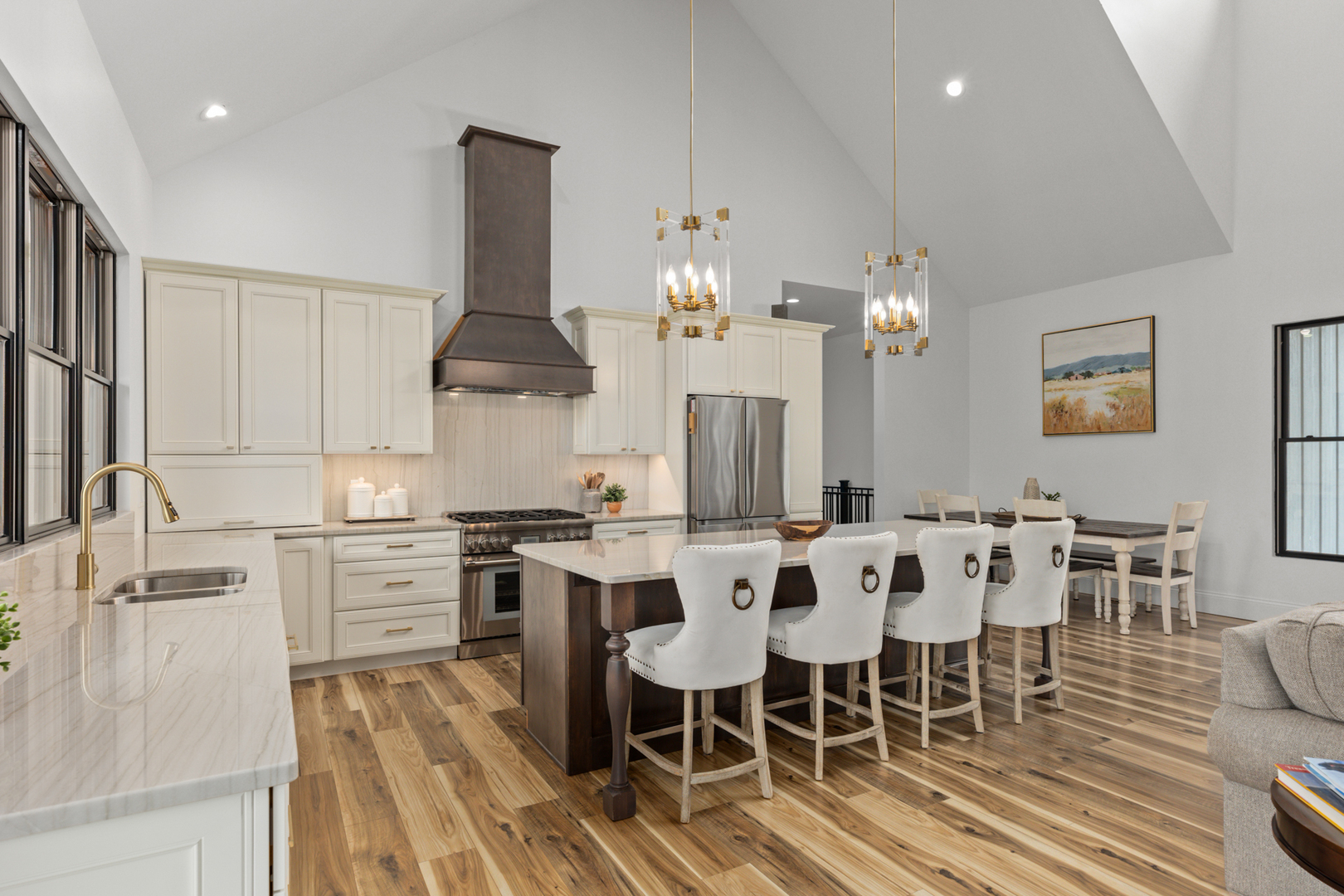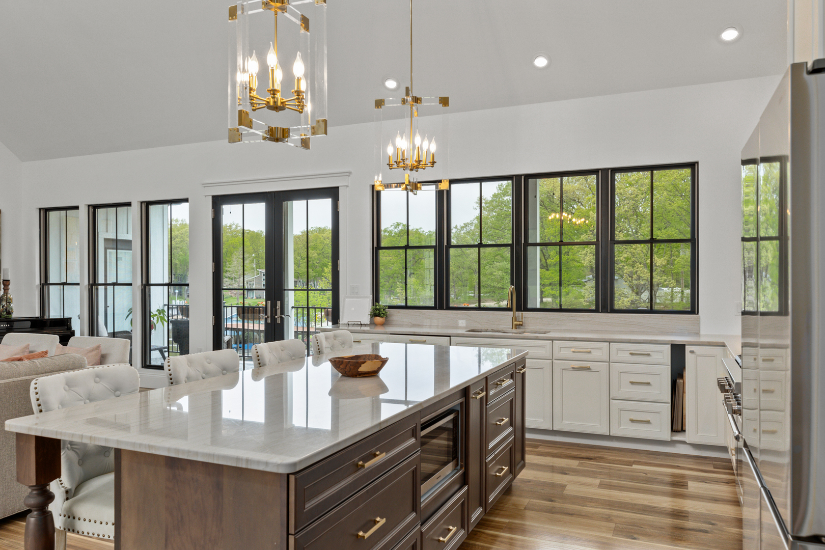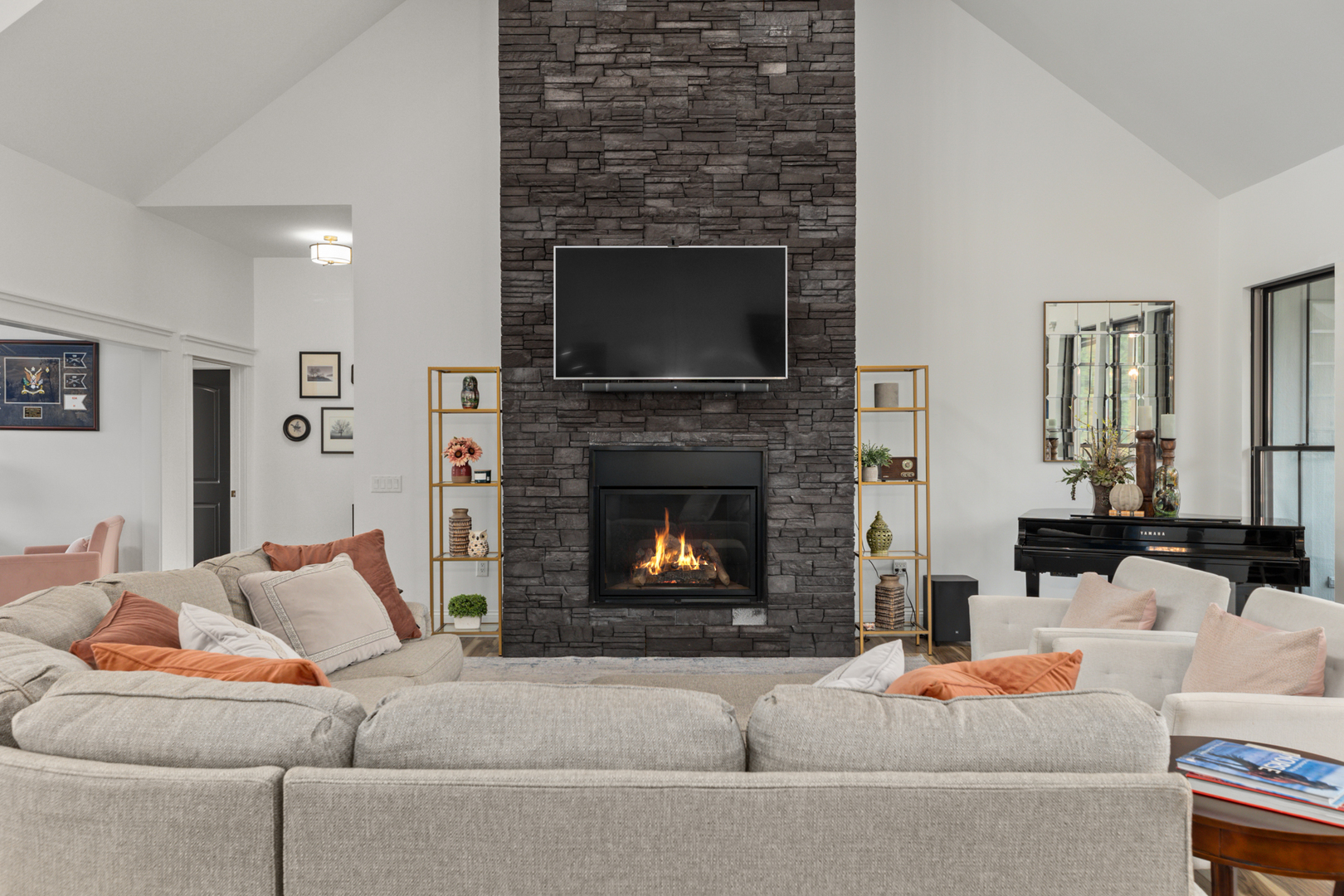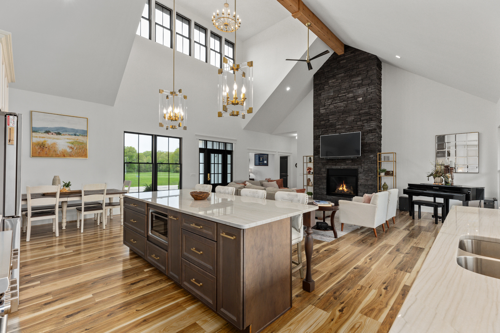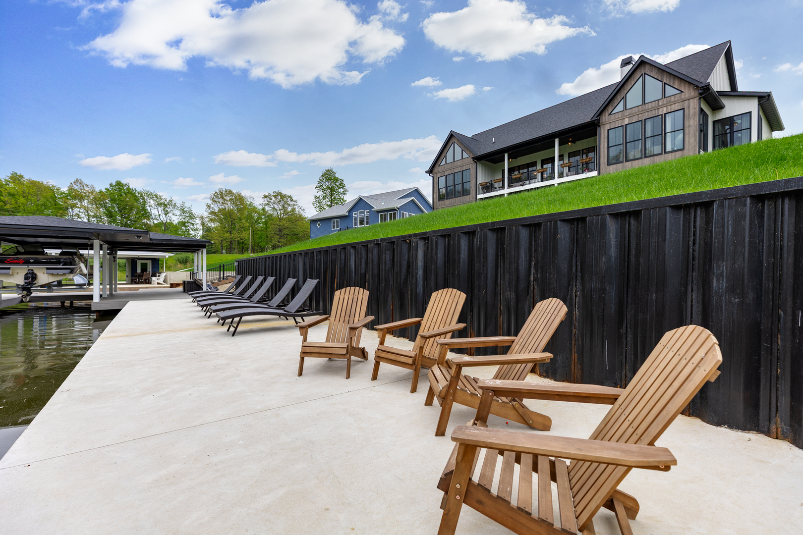 Wake each morning to the peaceful setting of this custom lakefront home on the shores of Lake Sara, with water views and surrounding natural landscape. Enjoy mornings on the covered deck overlooking the lake. Inside, the home offers 22-foot vaulted ceilings with custom exposed cedar beams, Andersen windows and doors, and abundant natural light throughout. The main living area connects to a well-designed kitchen featuring quartzite countertops, a large island, premium appliances, and space for gathering and entertaining. The primary suite is a spa-like retreat, featuring custom walnut cabinetry, a double vanity, soaking tub, and large windows that bring in natural light and views of the surrounding landscape. Bedrooms are generously sized; two upstairs rooms feature exposed beams. The finished walkout lower level includes additional bedrooms, a full bath, family room, game room, and storage. It opens to a covered porch with a gas fireplace. Outdoor living is a standout feature, with a covered 32-foot upper deck and an expansive waterside concrete patio lined with seating areas. The private dock, waterside patio and covered boat slip provide easy access to boating, fishing, and time on the lake. The property sits on over half an acre and includes upgraded mechanical systems, a three-car oversized attached garage, an extended driveway, a fenced dog run, and space for a future in-ground pool.