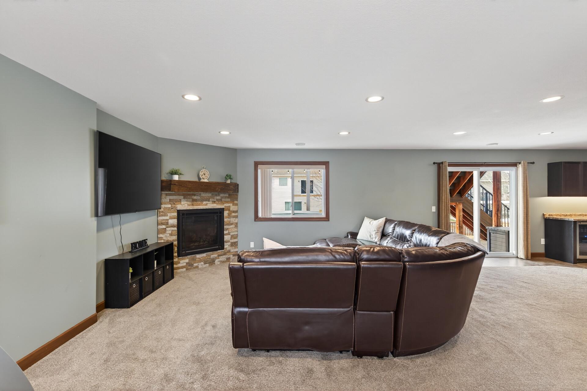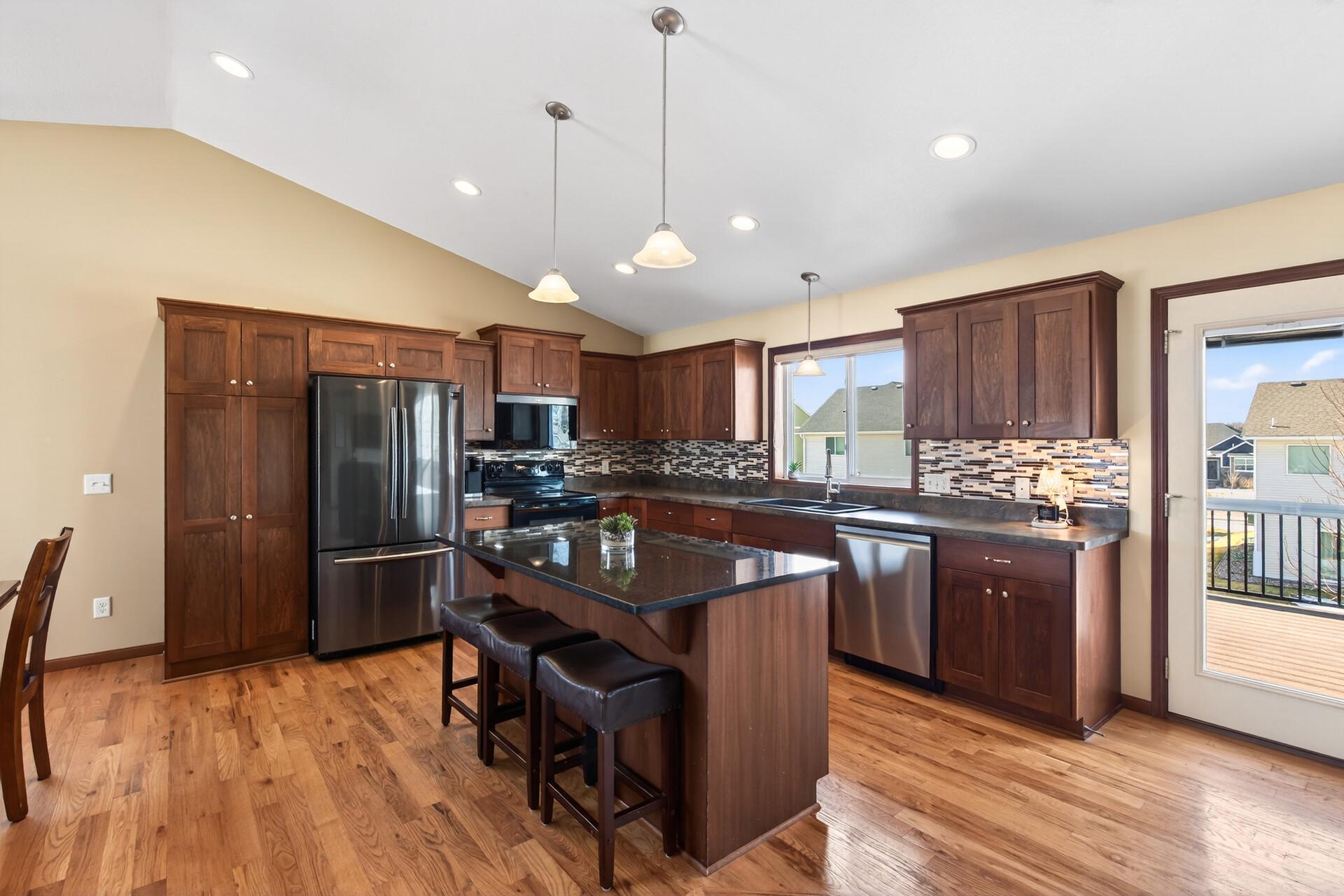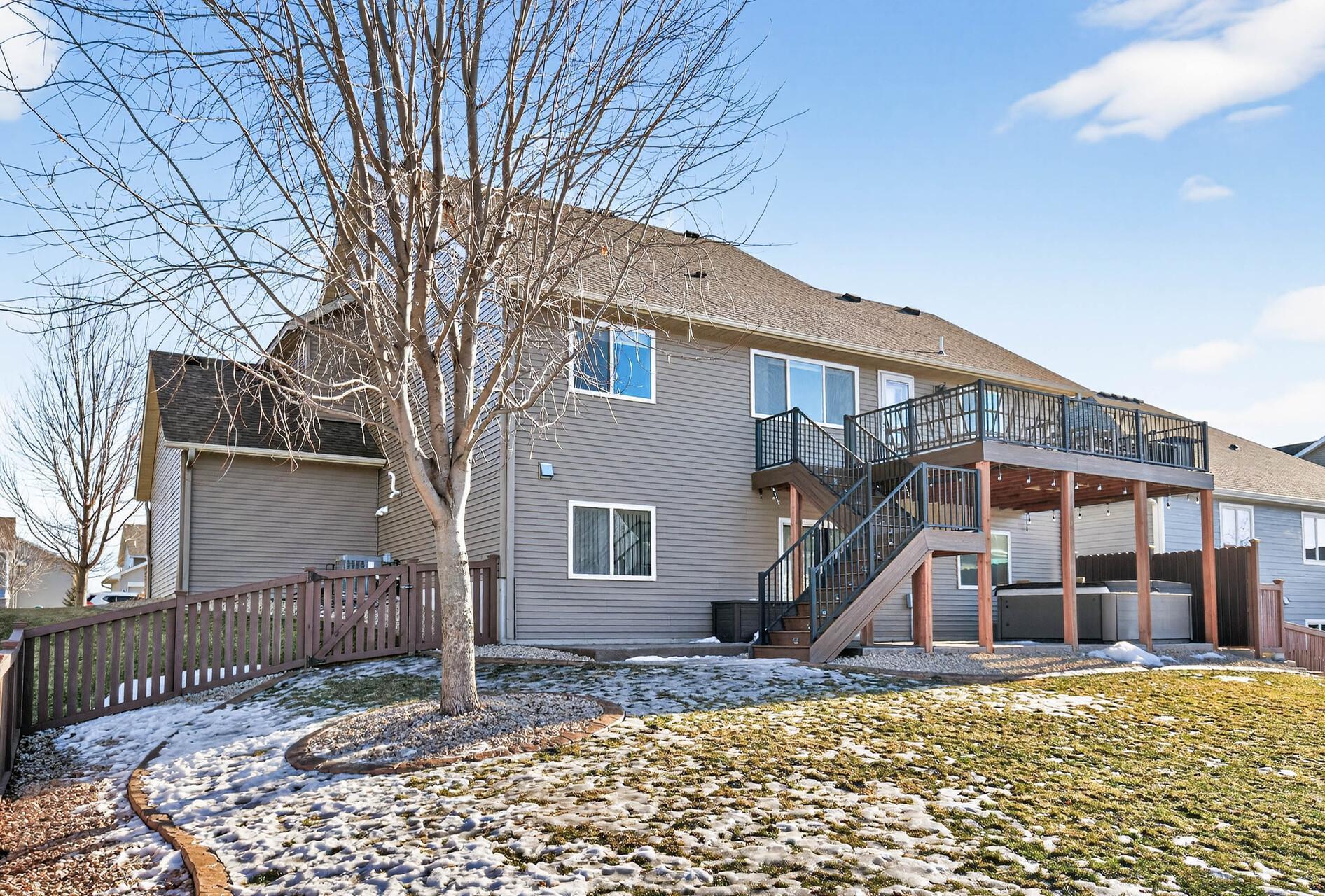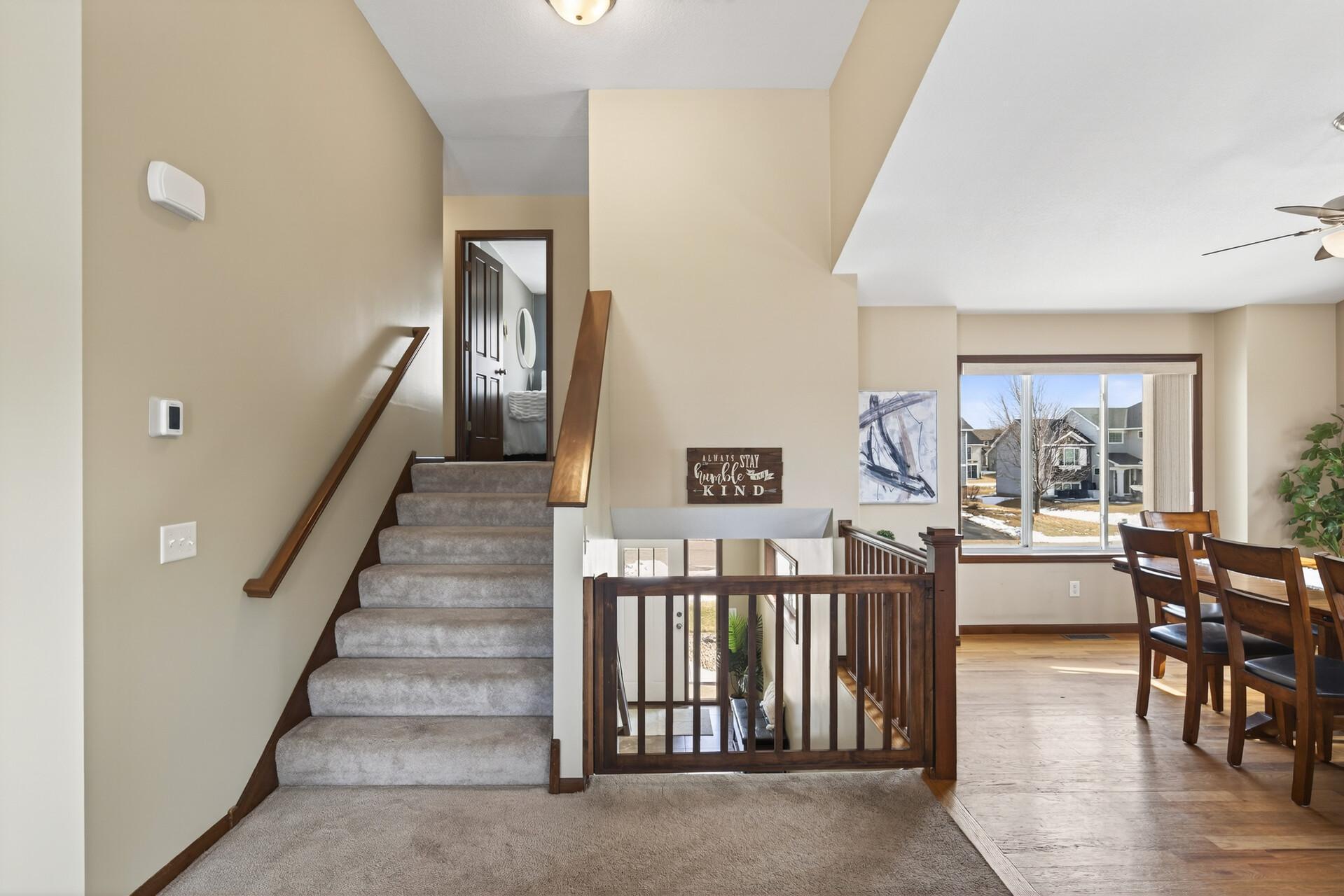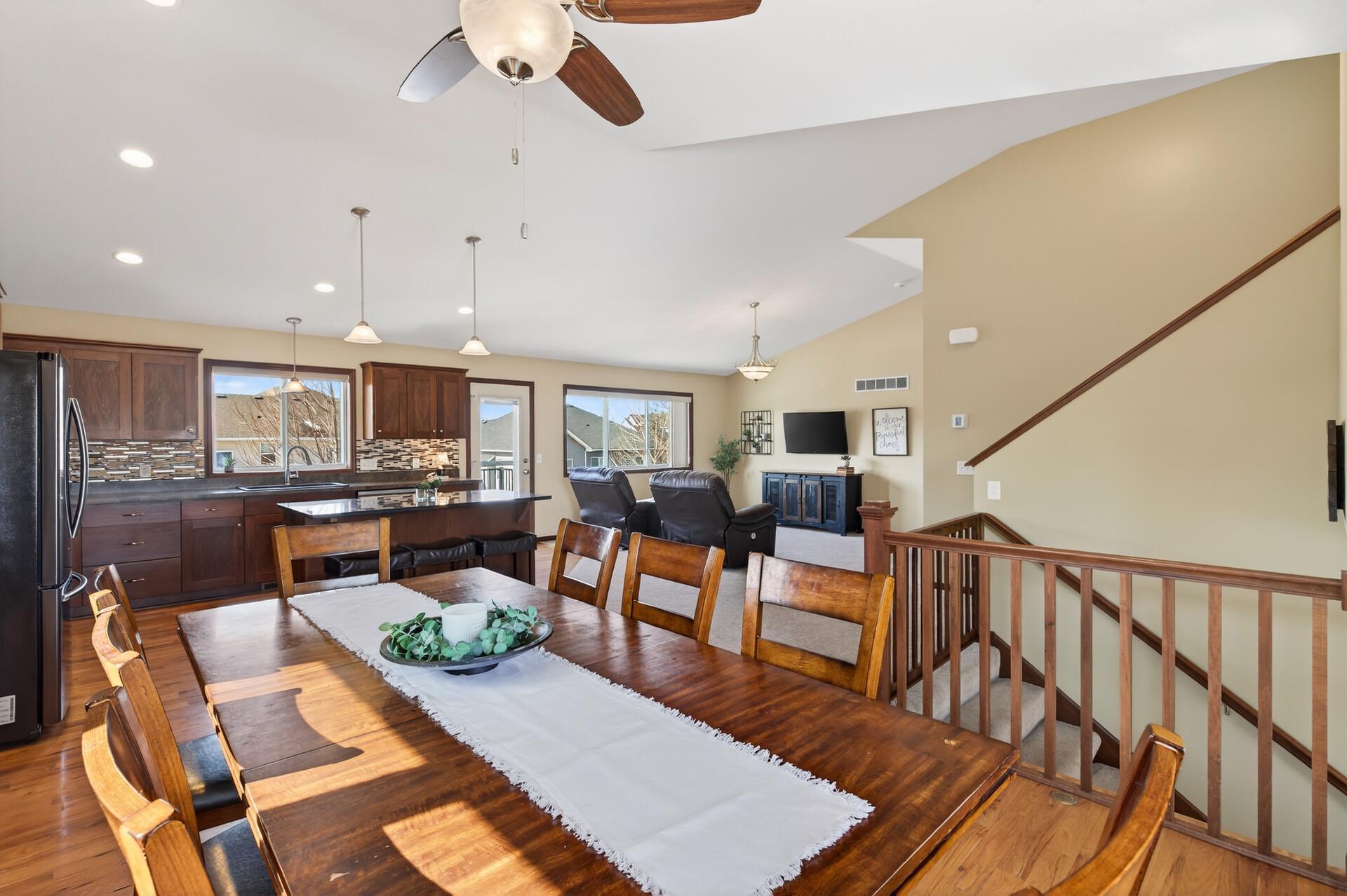 Beautiful custom-built 4-bedroom, 3-bath multilevel home in the desirable Bridle Creek neighborhood, thoughtfully maintained by its original owners. Unlike a traditional split-level, this home welcomes you with a spacious entryway. This well-maintained home features three bedrooms on one level and a convenient primary bedroom on the main floor. Enjoy the fully fenced backyard with a maintenance-free deck overlooking professionally landscaped grounds and professionally designed retaining wall. The walkout lower level offers a cozy gas fireplace, spacious family room, laundry area, flexible bonus space, and stamped concrete patio beneath the deck perfect for relaxing or entertaining. Heated 3 car garage with epoxy-coated floor adds comfort and functionality year-round. Residents enjoy shared neighborhood amenities including a pool, park, and basketball courts. Conveniently located with easy access to Highway 169 and nearby shopping, dining, and local amenities.