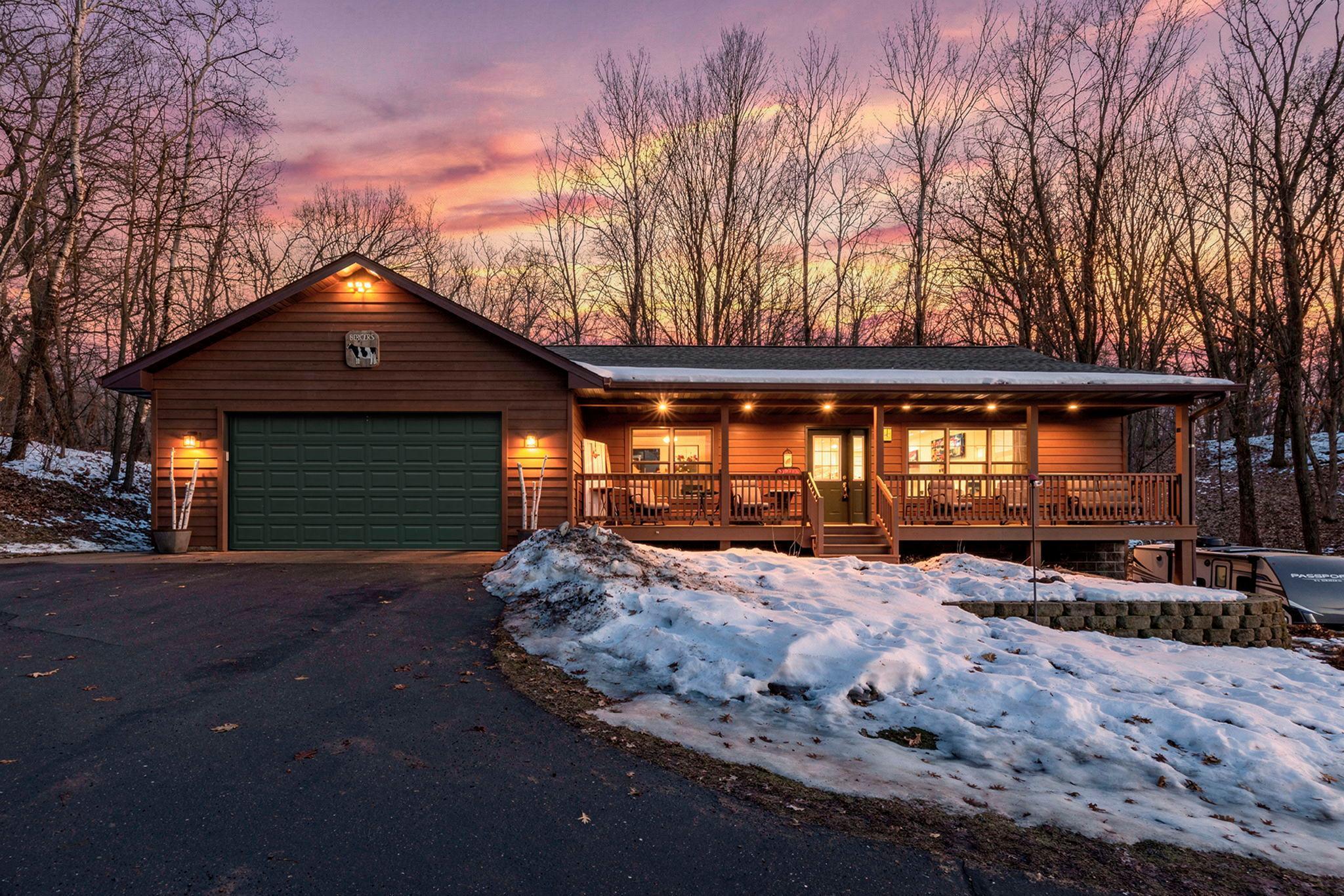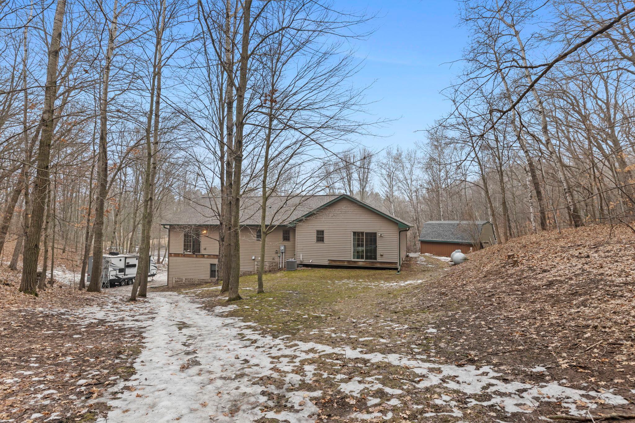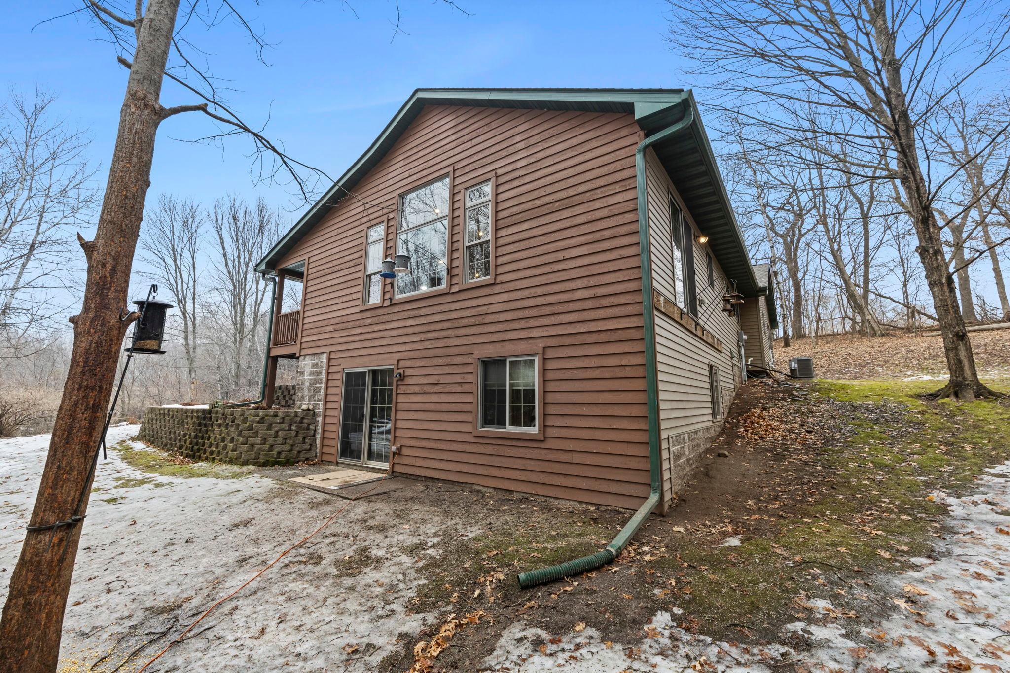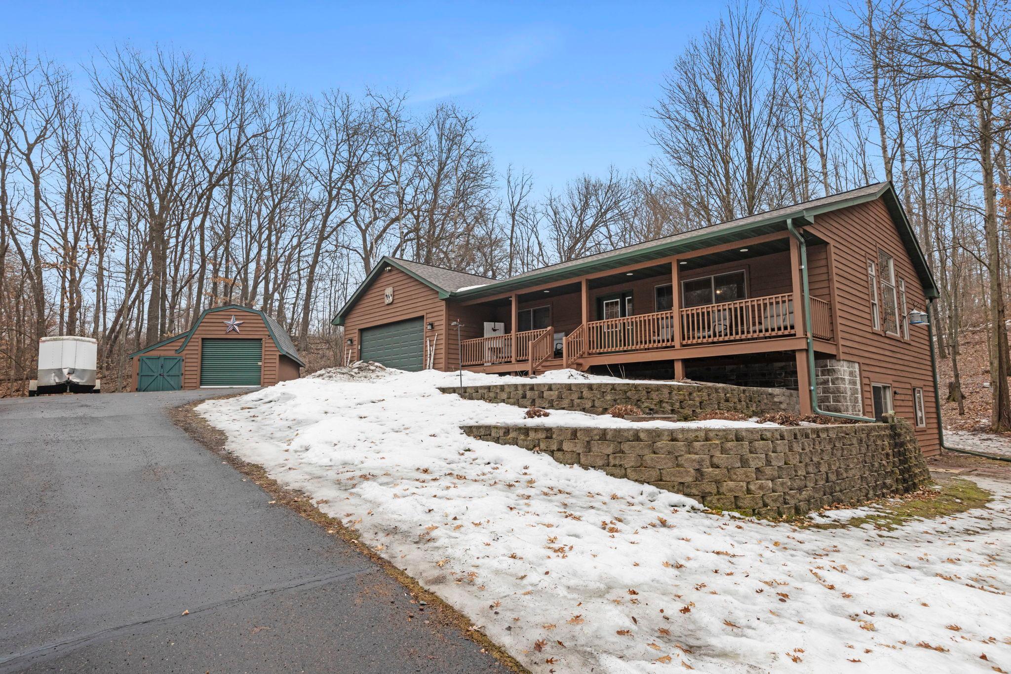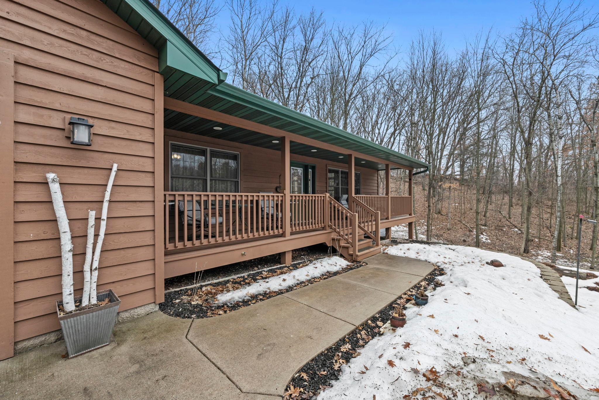 Tucked at the end of a private road, this peaceful country home located on 2 acres offers the perfect blend of privacy, nature, and comfort. Surrounded by mature trees and abundant wildlife, youll enjoy regular visits from deer, pheasant, squirrels, and songbirds, creating a truly serene setting. The inviting front porch is a perfect spot to enjoy morning coffee while taking in the quiet surroundings. Inside, the home features a beautiful open-concept layout with a vaulted ceiling and large windows that fill the living, dining, and kitchen areas with natural light. The kitchen is highlighted by lovely hickory cabinetry and flows seamlessly into the main living spaces, ideal for everyday living and entertaining. The main floor has two bedrooms, including a private owners suite with a walk-in closet and its own bathroom, along with convenient main-floor laundry. The finished lower level expands your living space with a comfortable family room featuring a walk-out patio door, a third bedroom, full bathroom, office space, and additional storage room. The attached 2-car garage is insulated. Major updates including a new roof in 2025, freshly stained cedar siding in 2025, plus newer appliances, AC and furnace in the past 5 years. Nature lovers will appreciate that DNR land adjoins the back of the property, offering direct access to a path leading to the renowned Ice Age Trail, perfect for hiking and enjoying the outdoors. Offering privacy, modern comforts, and a stunning natural setting while still being close to town, this property is truly atreasure. See 3D walk-through video and drone video!