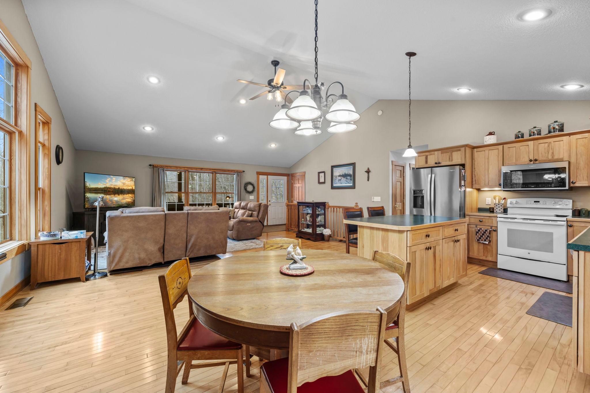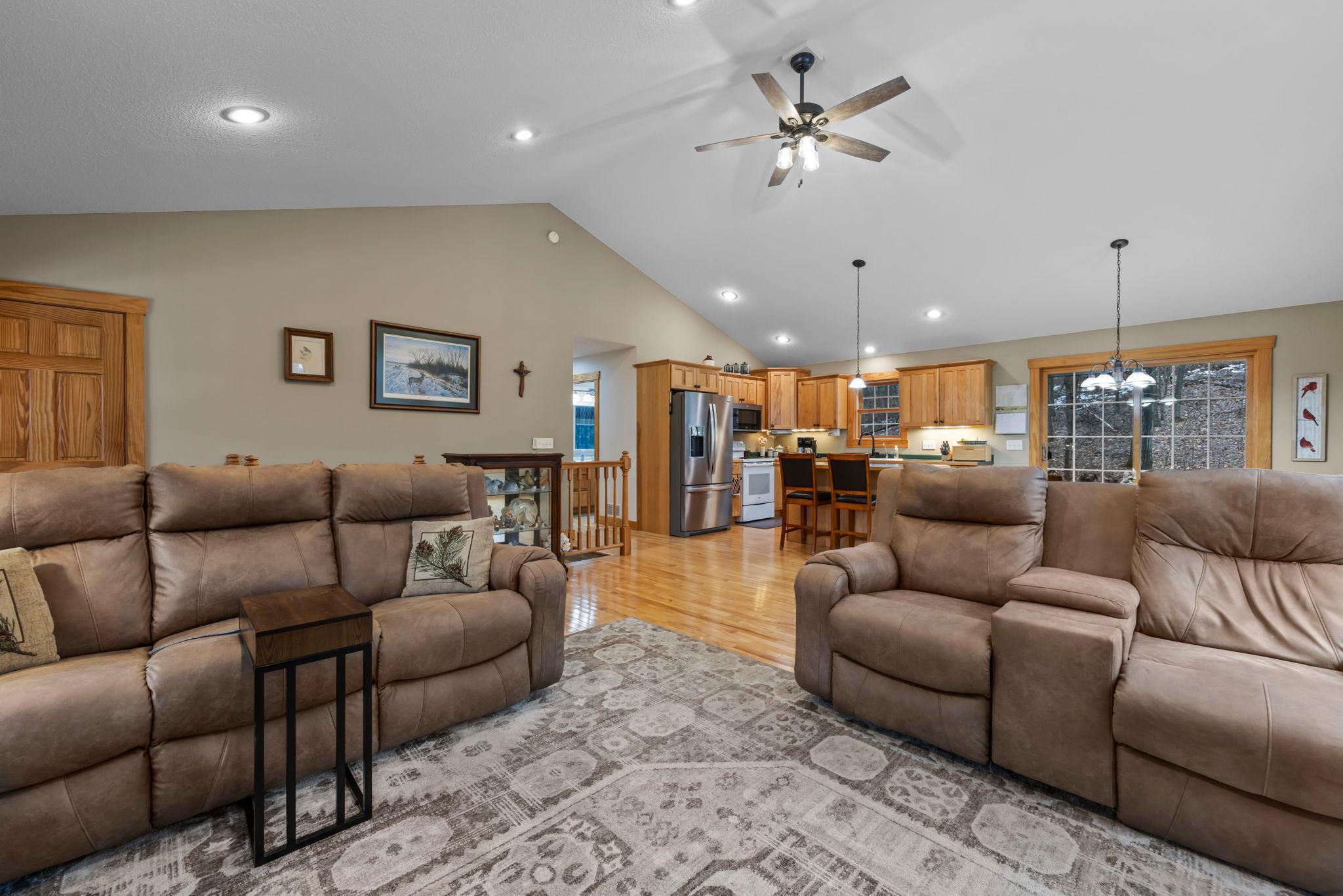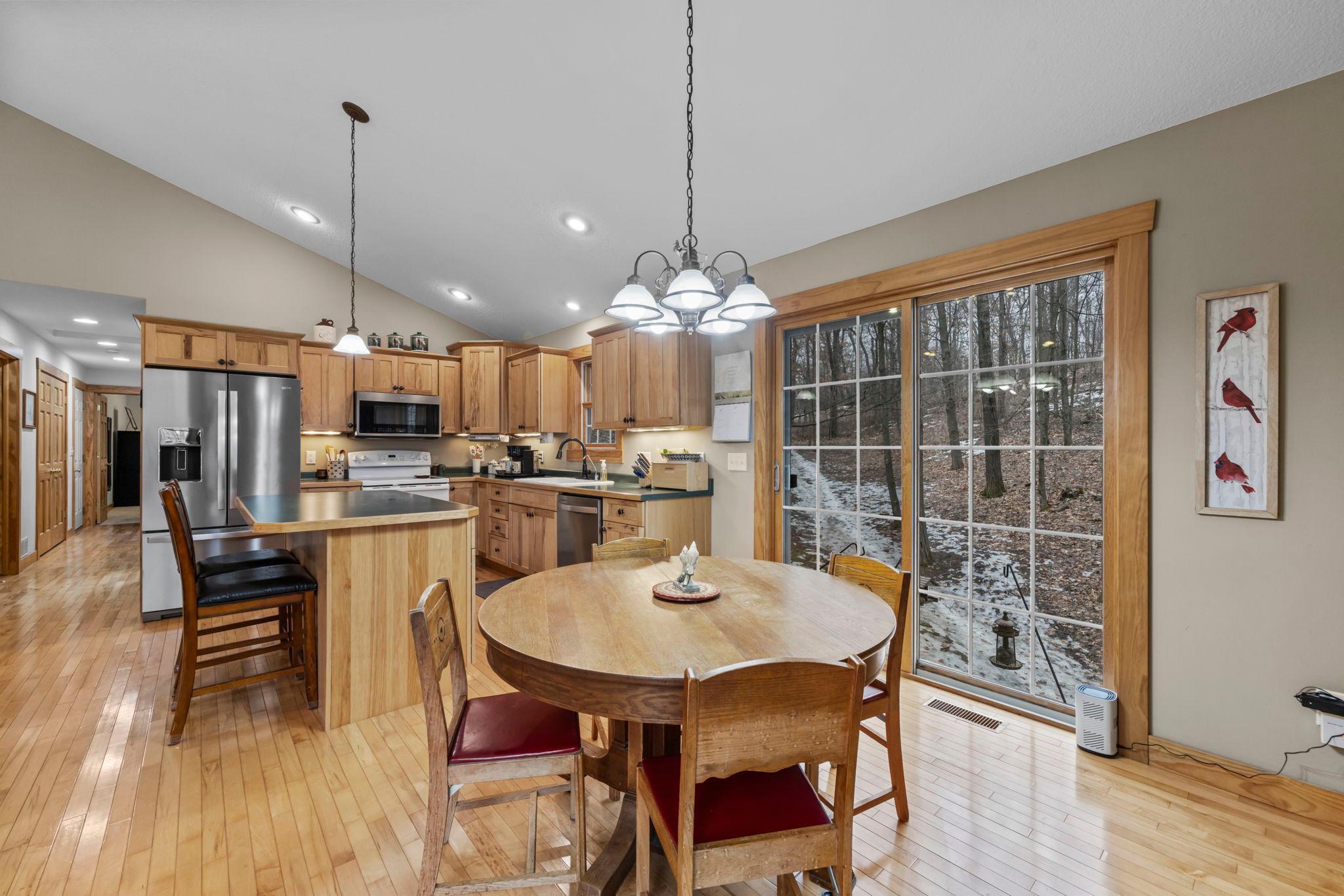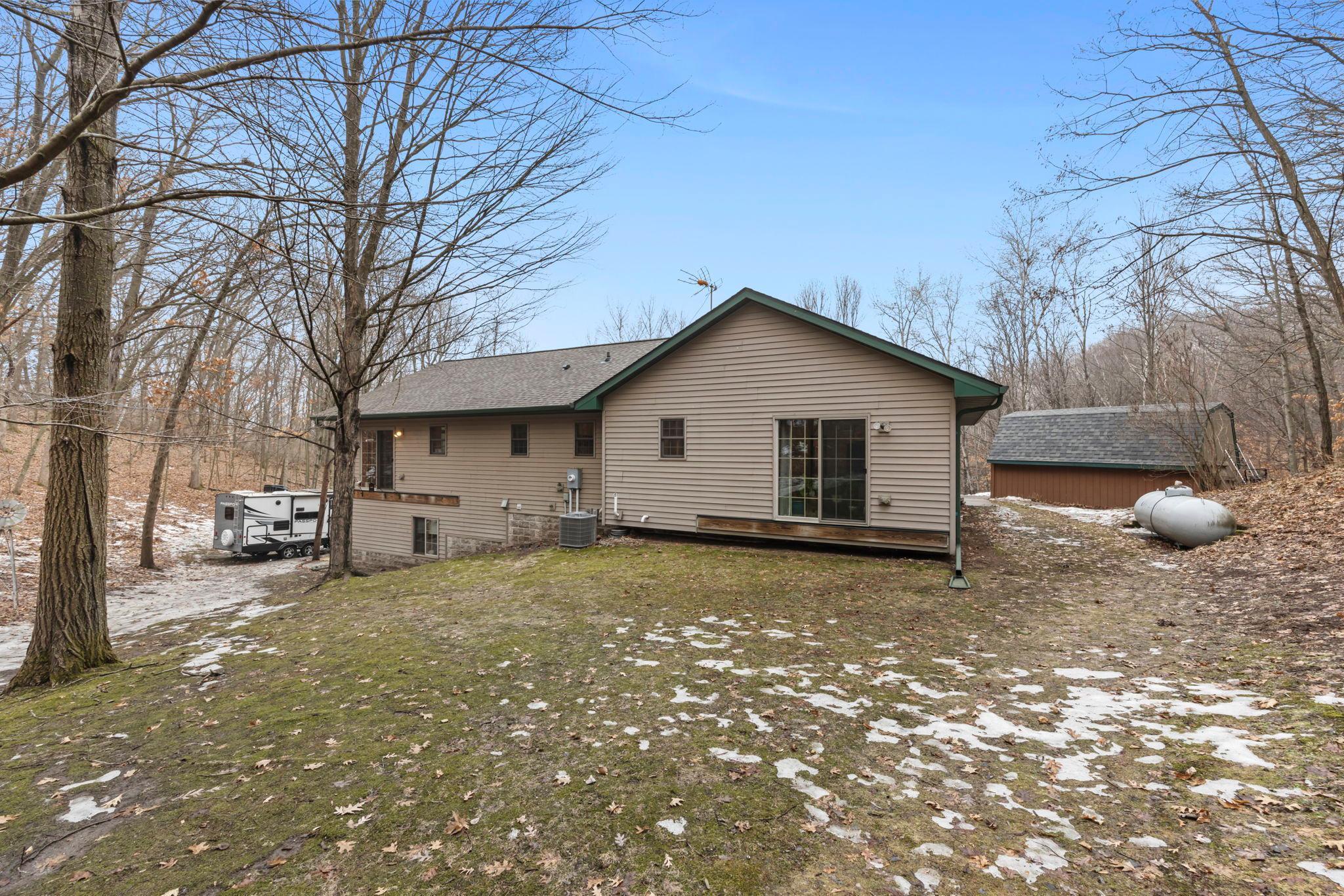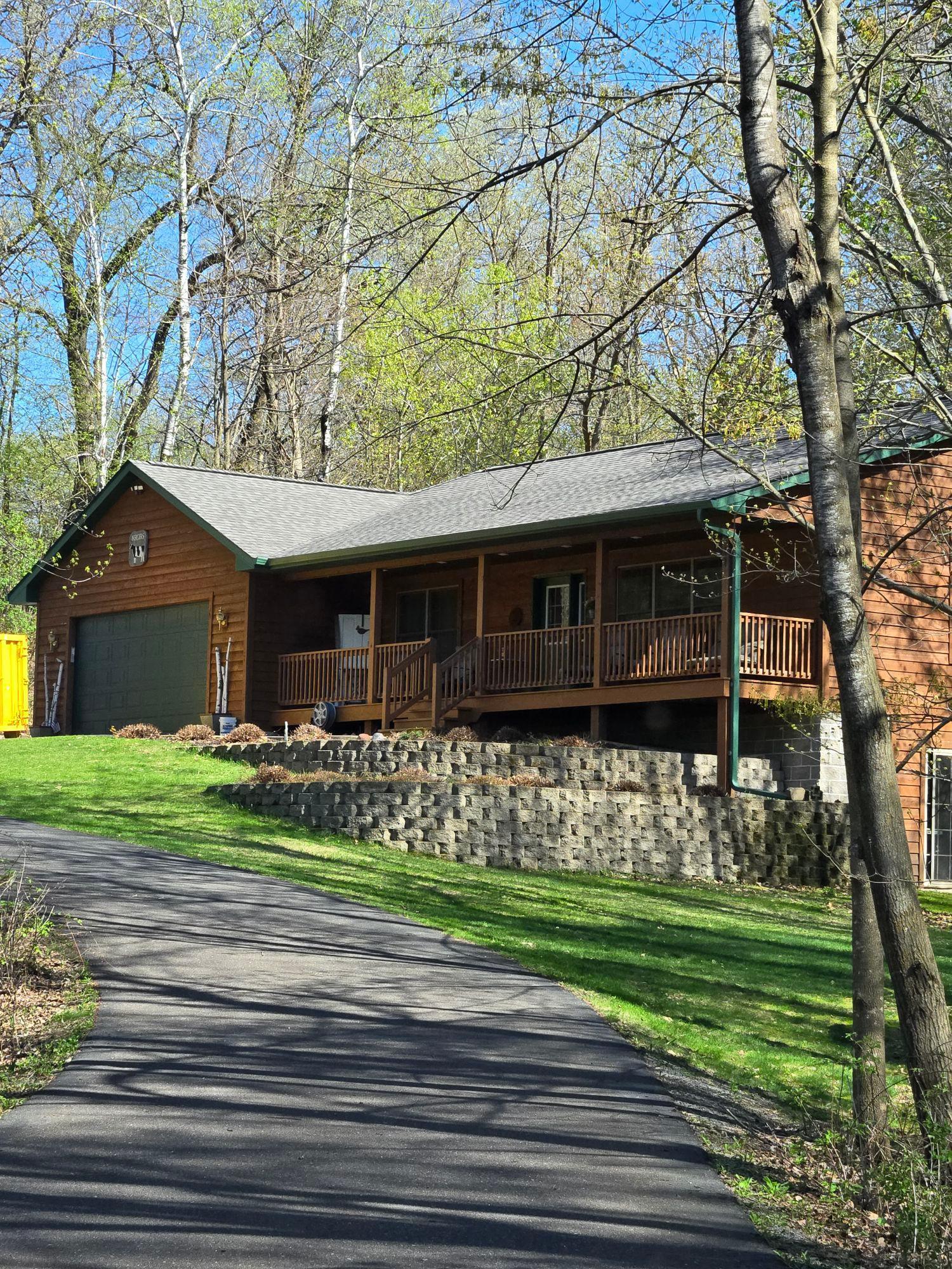 Tucked at the end of a private road, this peaceful country home located on 2 acres offers the perfect blend of privacy, nature, and comfort. Surrounded by mature trees and abundant wildlife, youll enjoy regular visits from deer, pheasant, squirrels, and songbirds, creating a truly serene setting. The inviting front porch is a perfect spot to enjoy morning coffee while taking in the quiet surroundings. Inside, the home features a beautiful open-concept layout with a vaulted ceiling and large windows that fill the living, dining, and kitchen areas with natural light. The kitchen is highlighted by lovely hickory cabinetry and flows seamlessly into the main living spaces, ideal for everyday living and entertaining. The main floor has two bedrooms, including a private owners suite with a walk-in closet and its own bathroom, along with convenient main-floor laundry. The finished lower level expands your living space with a comfortable family room featuring a walk-out patio door, a third bedroom, full bathroom, office space, and additional storage room. The attached 2-car garage is insulated. Major updates including a new roof in 2025, freshly stained cedar siding in 2025, plus newer appliances, AC and furnace in the past 5 years. Nature lovers will appreciate that DNR land adjoins the back of the property, offering direct access to a path leading to the renowned Ice Age Trail, perfect for hiking and enjoying the outdoors. Offering privacy, modern comforts, and a stunning natural setting while still being close to town, this property is truly atreasure. See 3D walk-through video and drone video!