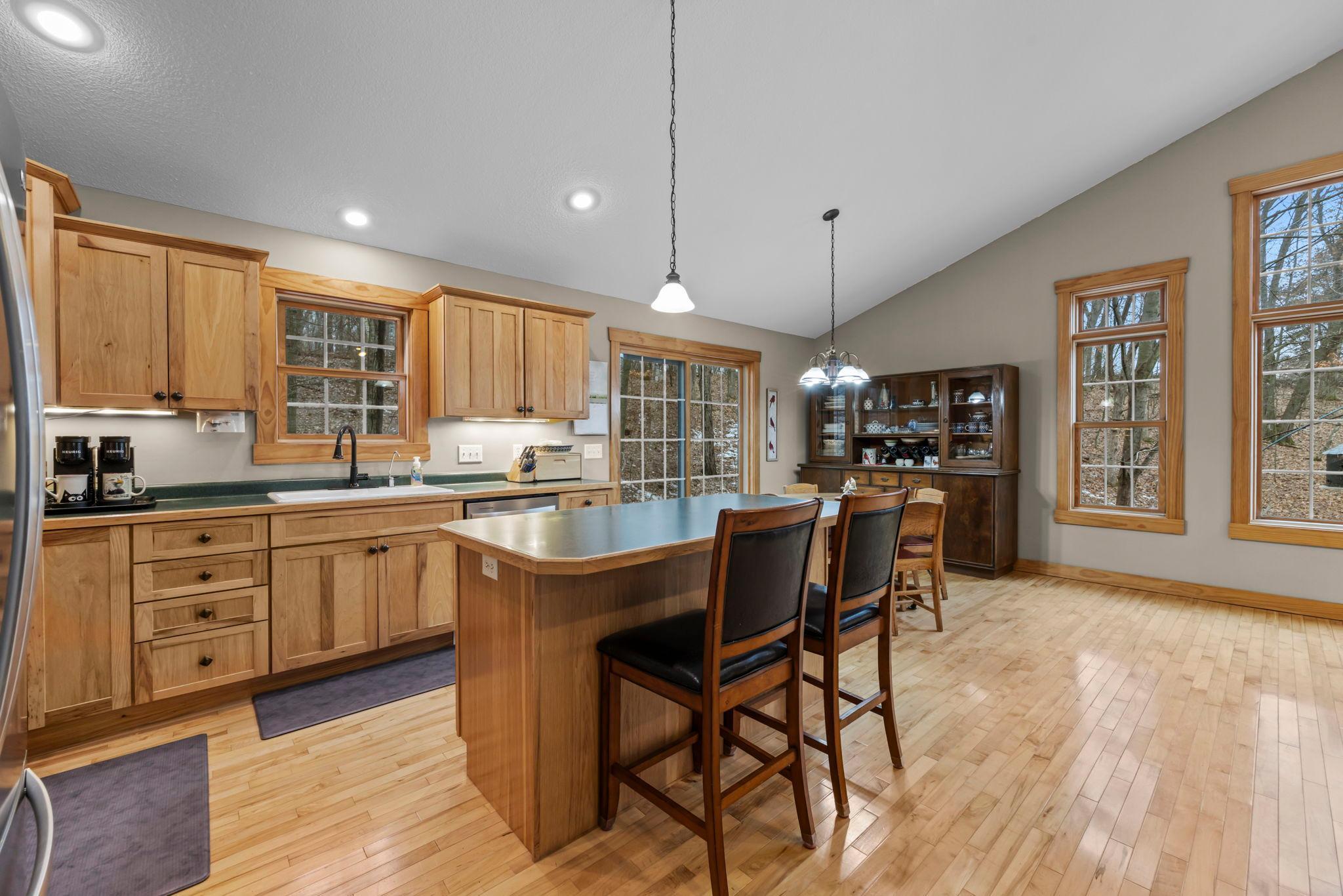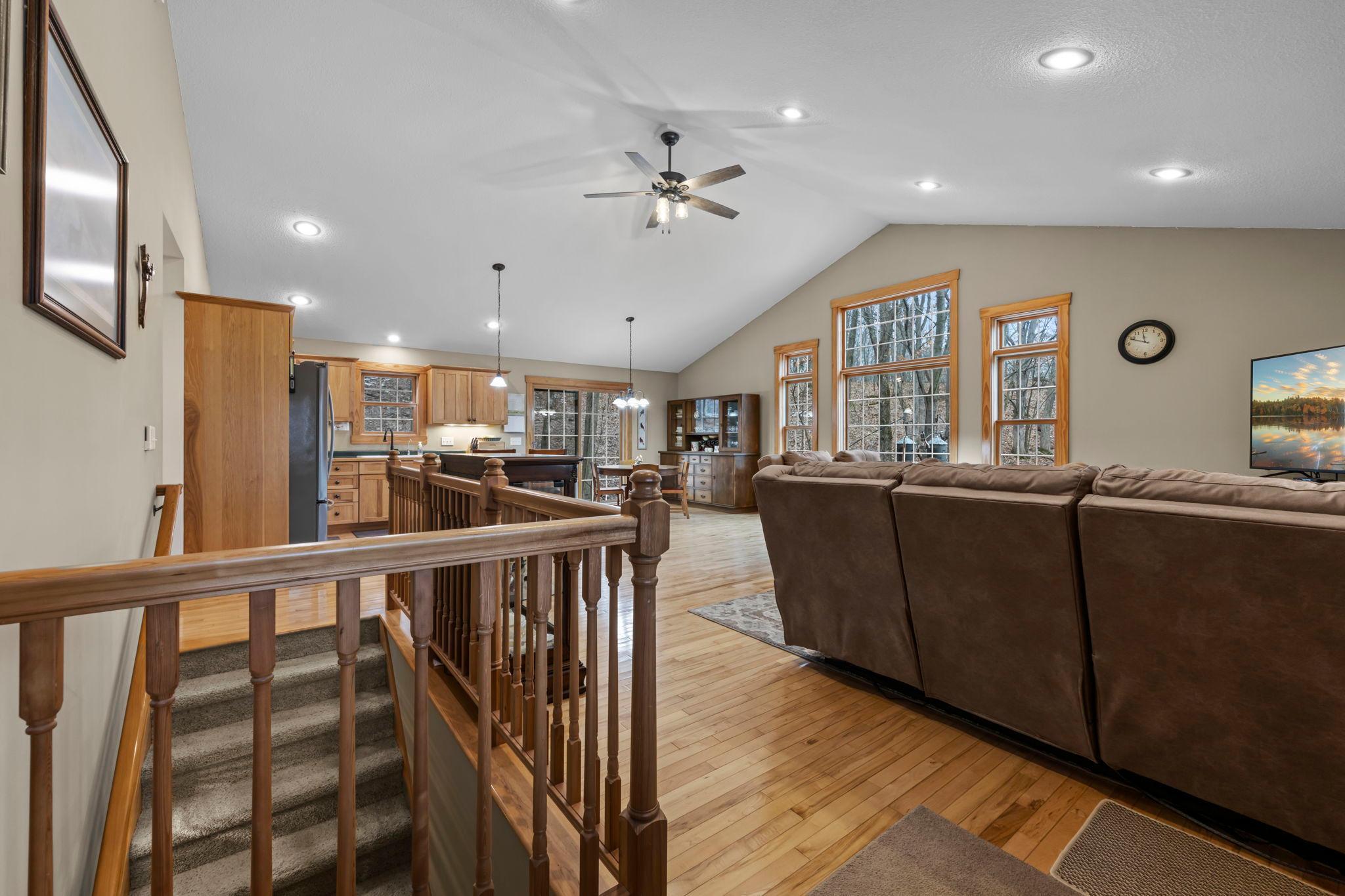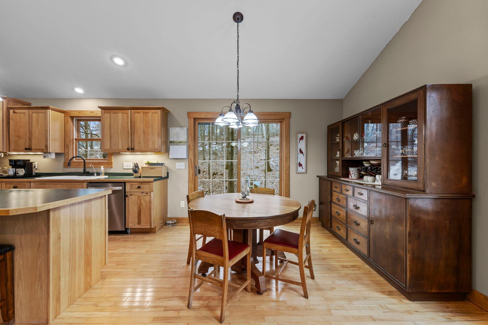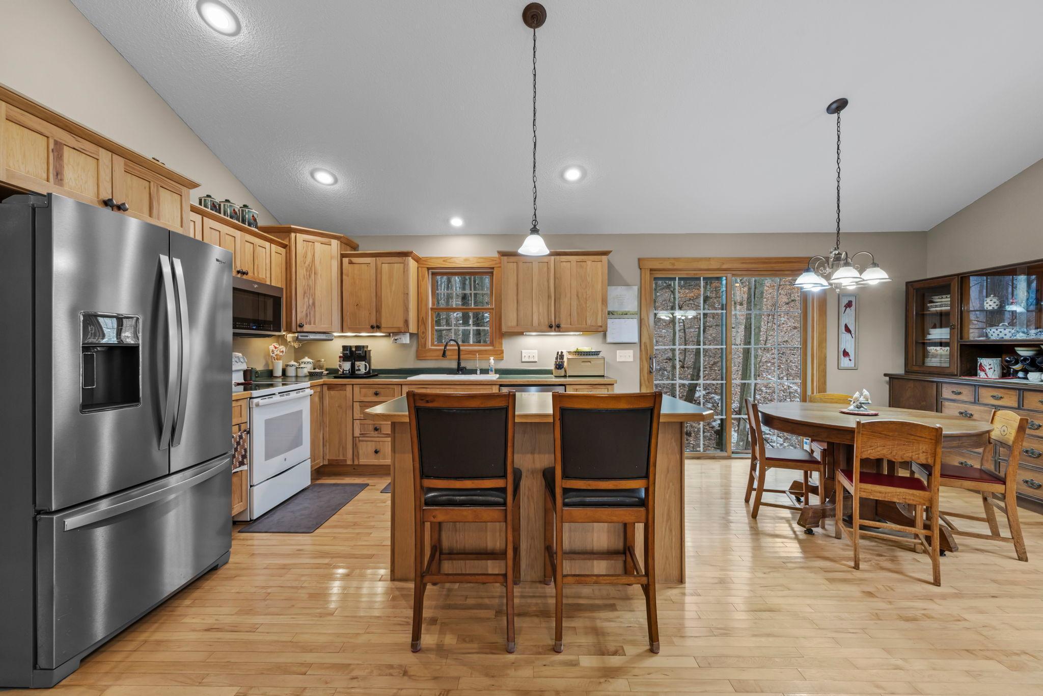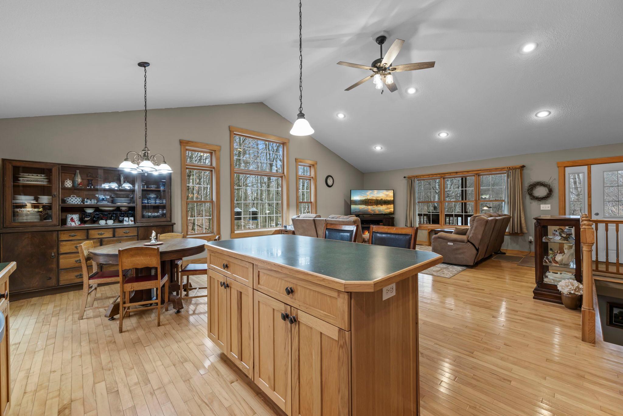 Tucked at the end of a private road, this peaceful country home located on 2 acres offers the perfect blend of privacy, nature, and comfort. Surrounded by mature trees and abundant wildlife, youll enjoy regular visits from deer, pheasant, squirrels, and songbirds, creating a truly serene setting. The inviting front porch is a perfect spot to enjoy morning coffee while taking in the quiet surroundings. Inside, the home features a beautiful open-concept layout with a vaulted ceiling and large windows that fill the living, dining, and kitchen areas with natural light. The kitchen is highlighted by lovely hickory cabinetry and flows seamlessly into the main living spaces, ideal for everyday living and entertaining. The main floor has two bedrooms, including a private owners suite with a walk-in closet and its own bathroom, along with convenient main-floor laundry. The finished lower level expands your living space with a comfortable family room featuring a walk-out patio door, a third bedroom, full bathroom, office space, and additional storage room. The attached 2-car garage is insulated. Major updates including a new roof in 2025, freshly stained cedar siding in 2025, plus newer appliances, AC and furnace in the past 5 years. Nature lovers will appreciate that DNR land adjoins the back of the property, offering direct access to a path leading to the renowned Ice Age Trail, perfect for hiking and enjoying the outdoors. Offering privacy, modern comforts, and a stunning natural setting while still being close to town, this property is truly atreasure. See 3D walk-through video and drone video!