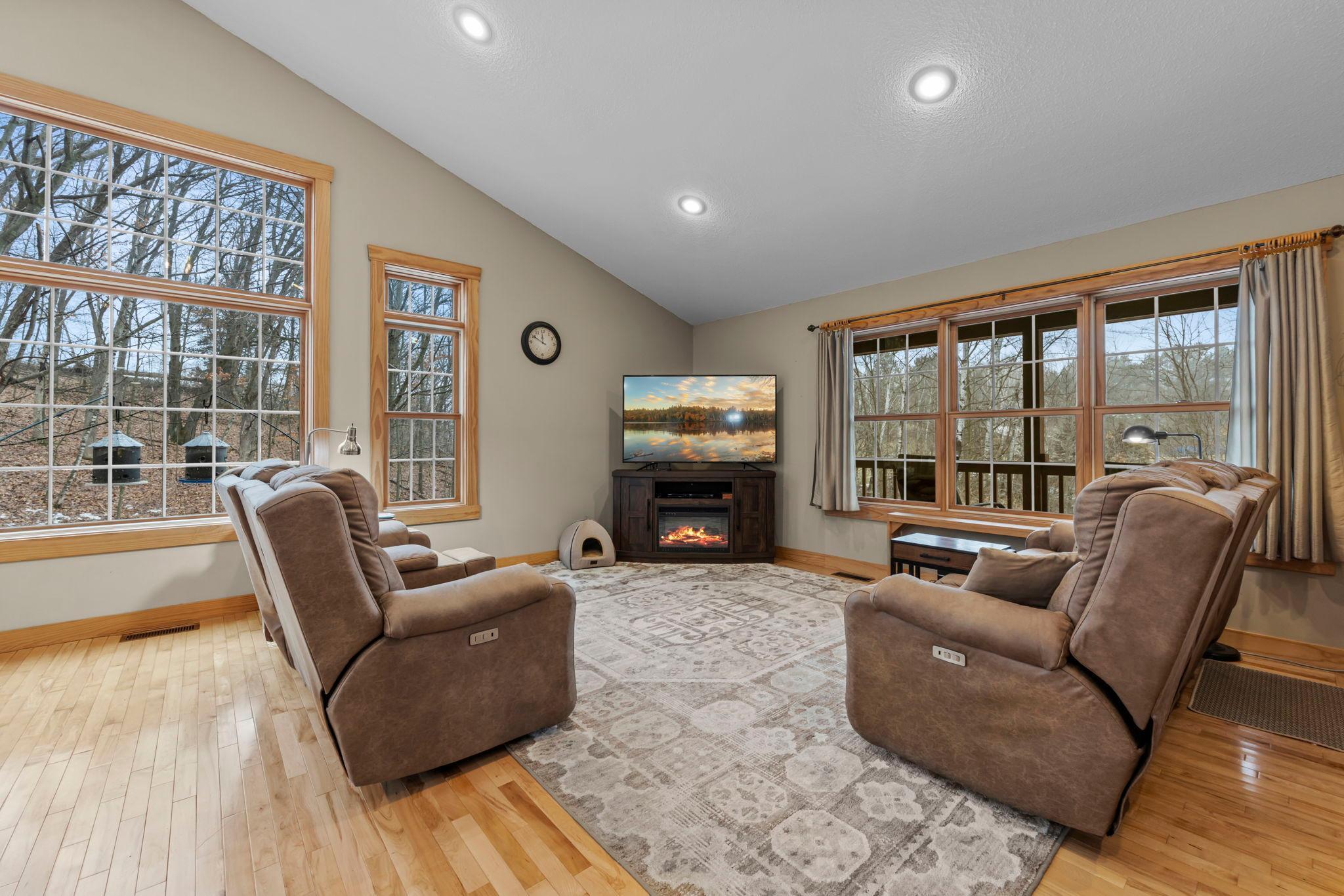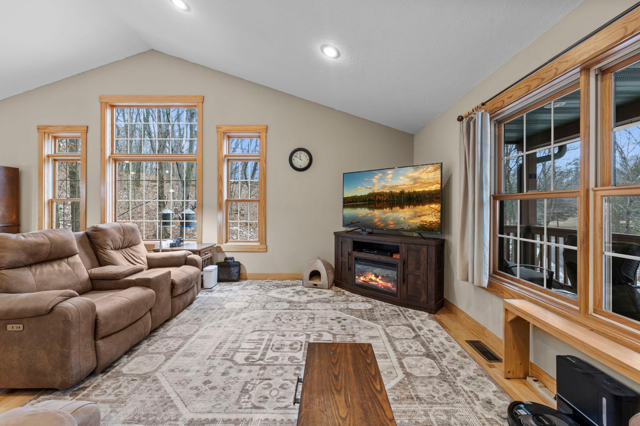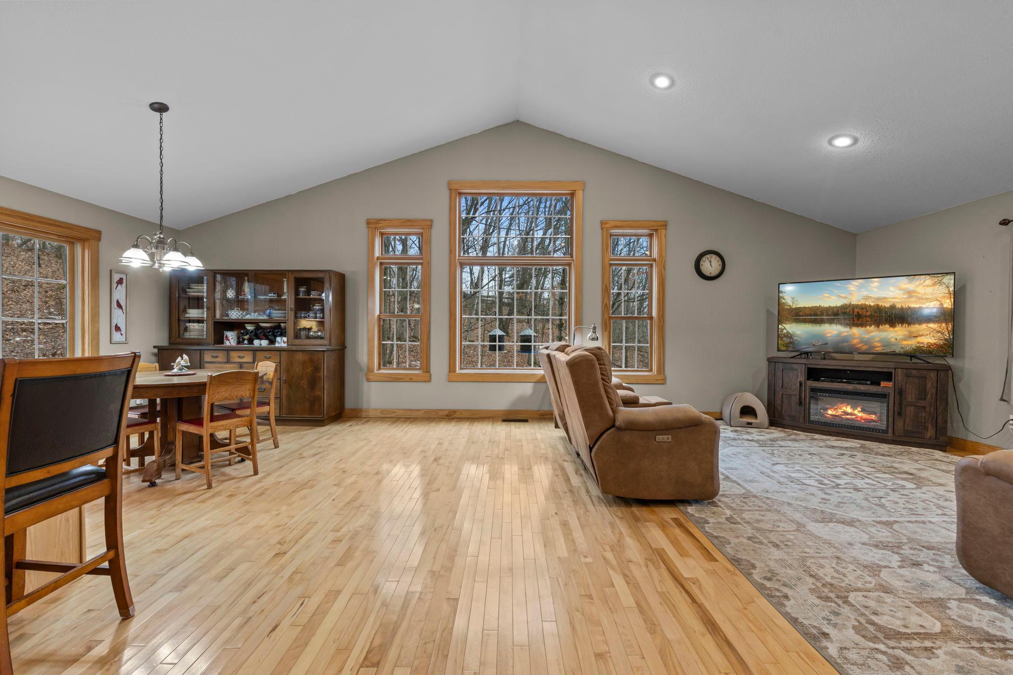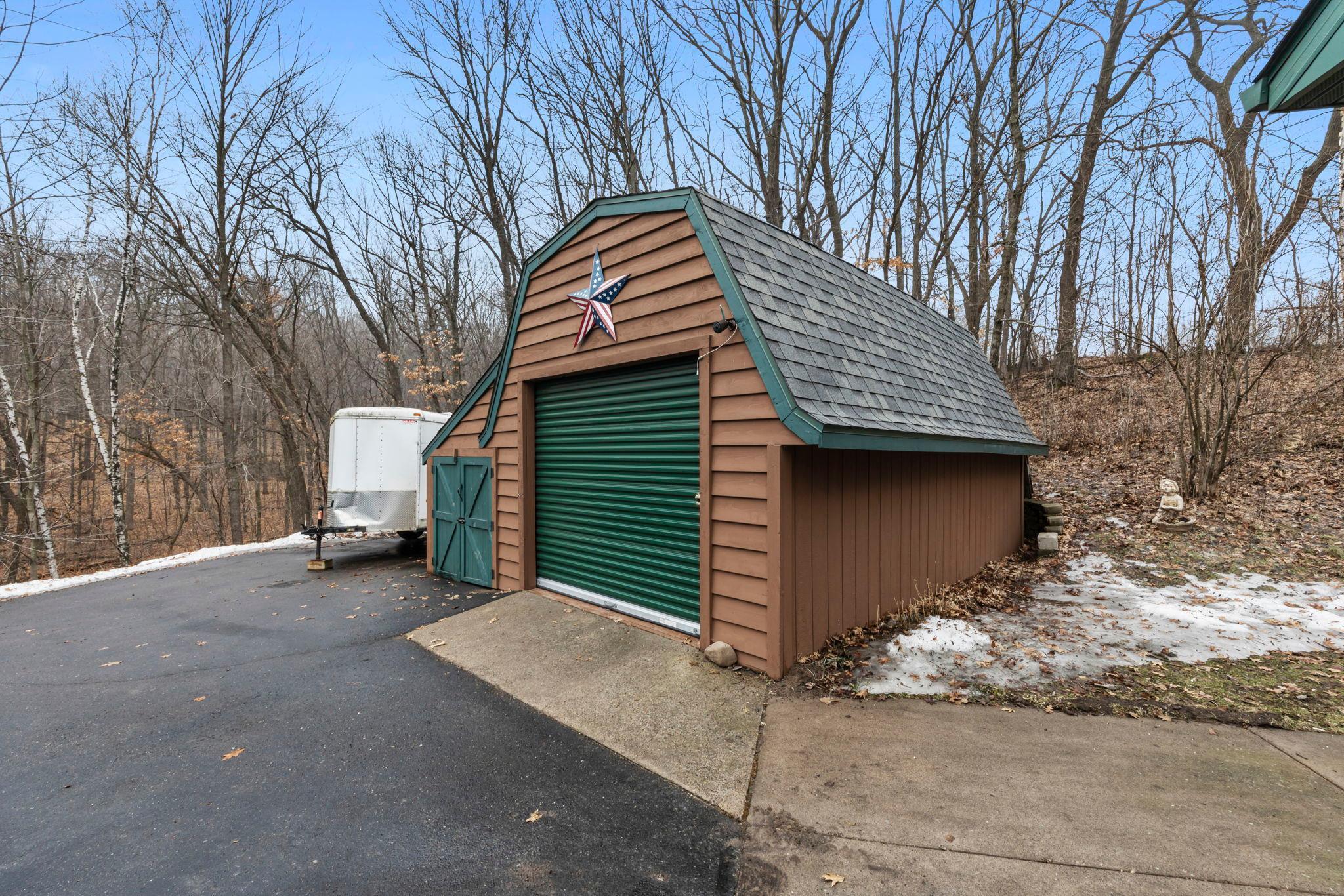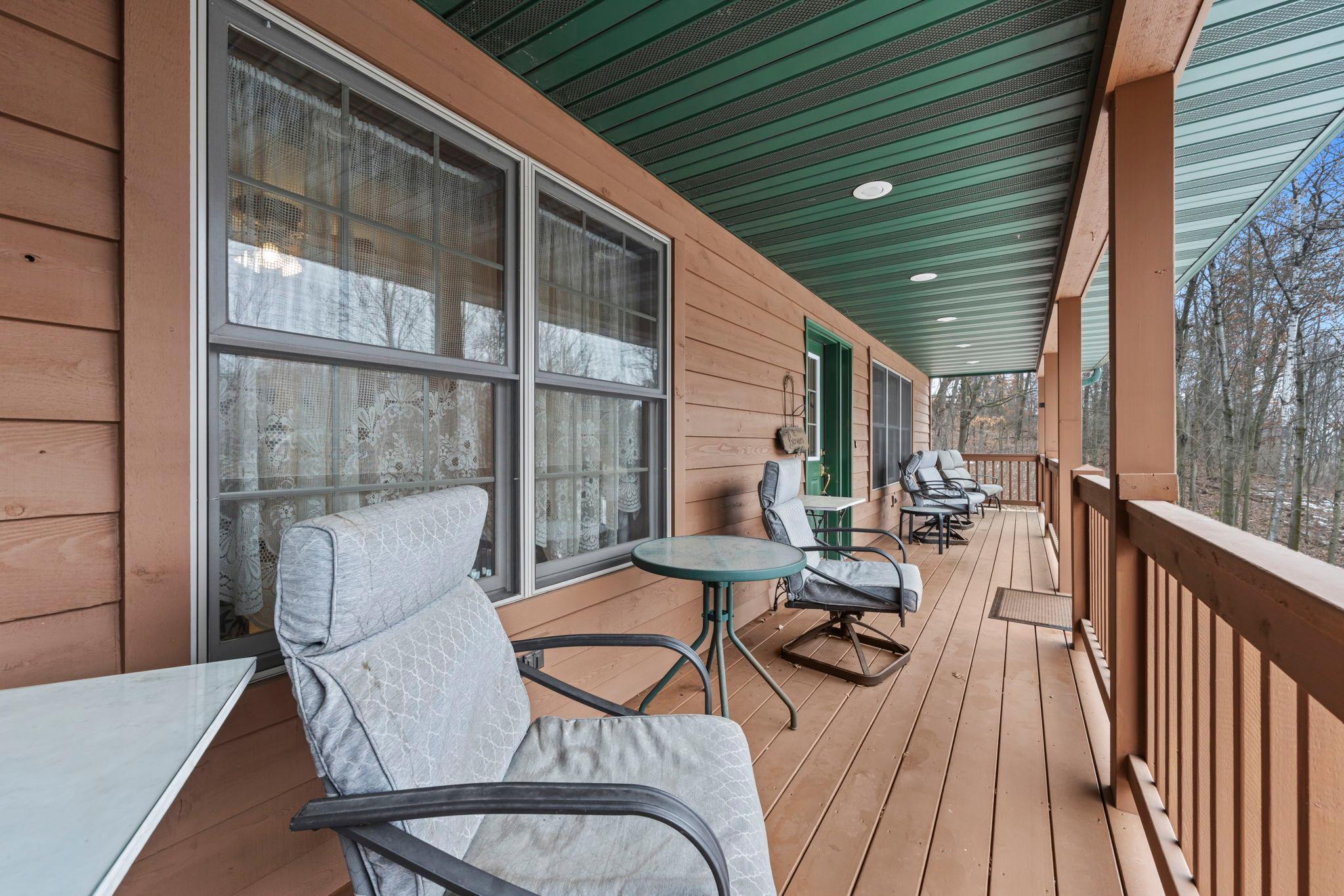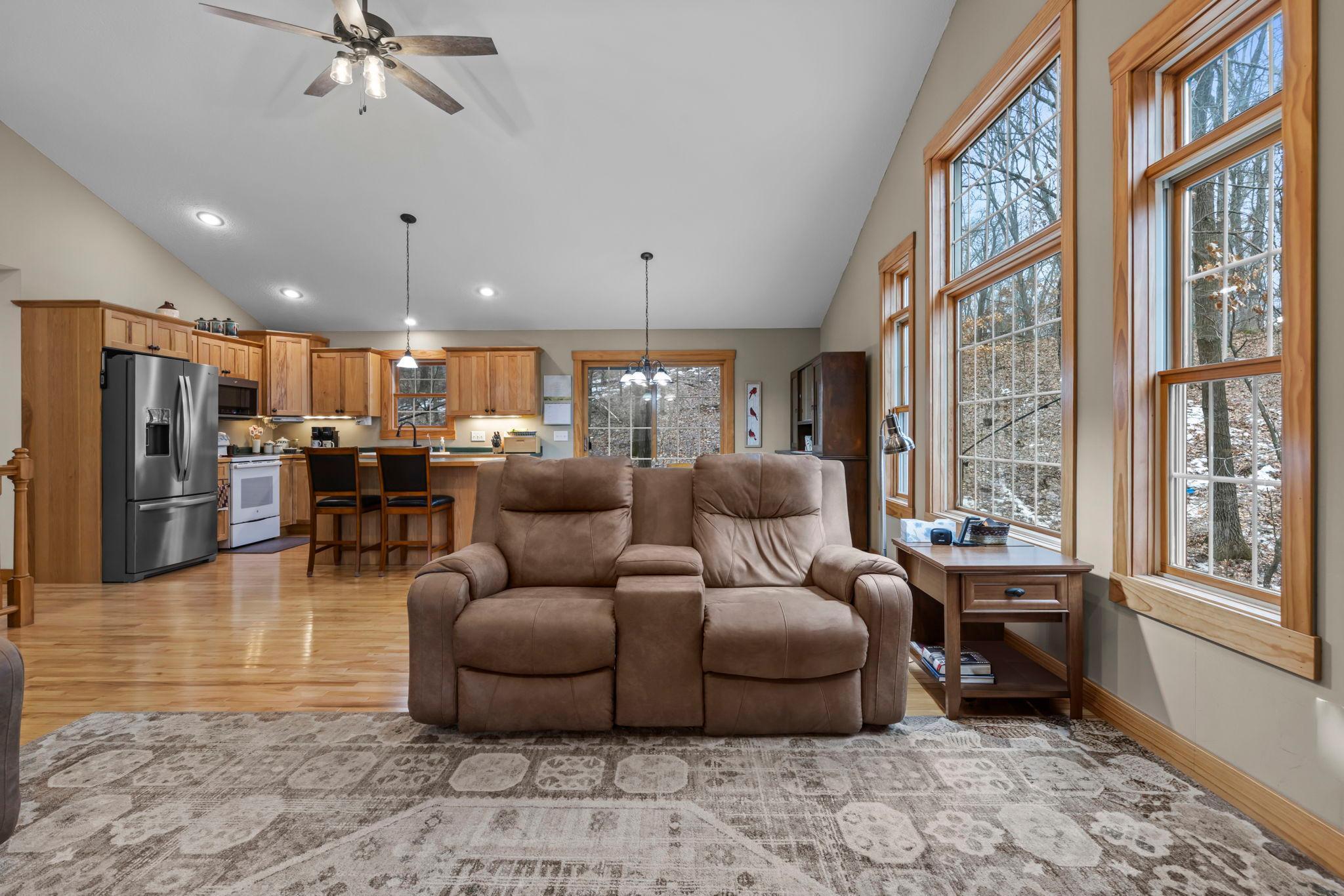 Tucked at the end of a private road, this peaceful country home located on 2 acres offers the perfect blend of privacy, nature, and comfort. Surrounded by mature trees and abundant wildlife, youll enjoy regular visits from deer, pheasant, squirrels, and songbirds, creating a truly serene setting. The inviting front porch is a perfect spot to enjoy morning coffee while taking in the quiet surroundings. Inside, the home features a beautiful open-concept layout with a vaulted ceiling and large windows that fill the living, dining, and kitchen areas with natural light. The kitchen is highlighted by lovely hickory cabinetry and flows seamlessly into the main living spaces, ideal for everyday living and entertaining. The main floor has two bedrooms, including a private owners suite with a walk-in closet and its own bathroom, along with convenient main-floor laundry. The finished lower level expands your living space with a comfortable family room featuring a walk-out patio door, a third bedroom, full bathroom, office space, and additional storage room. The attached 2-car garage is insulated. Major updates including a new roof in 2025, freshly stained cedar siding in 2025, plus newer appliances, AC and furnace in the past 5 years. Nature lovers will appreciate that DNR land adjoins the back of the property, offering direct access to a path leading to the renowned Ice Age Trail, perfect for hiking and enjoying the outdoors. Offering privacy, modern comforts, and a stunning natural setting while still being close to town, this property is truly atreasure. See 3D walk-through video and drone video!