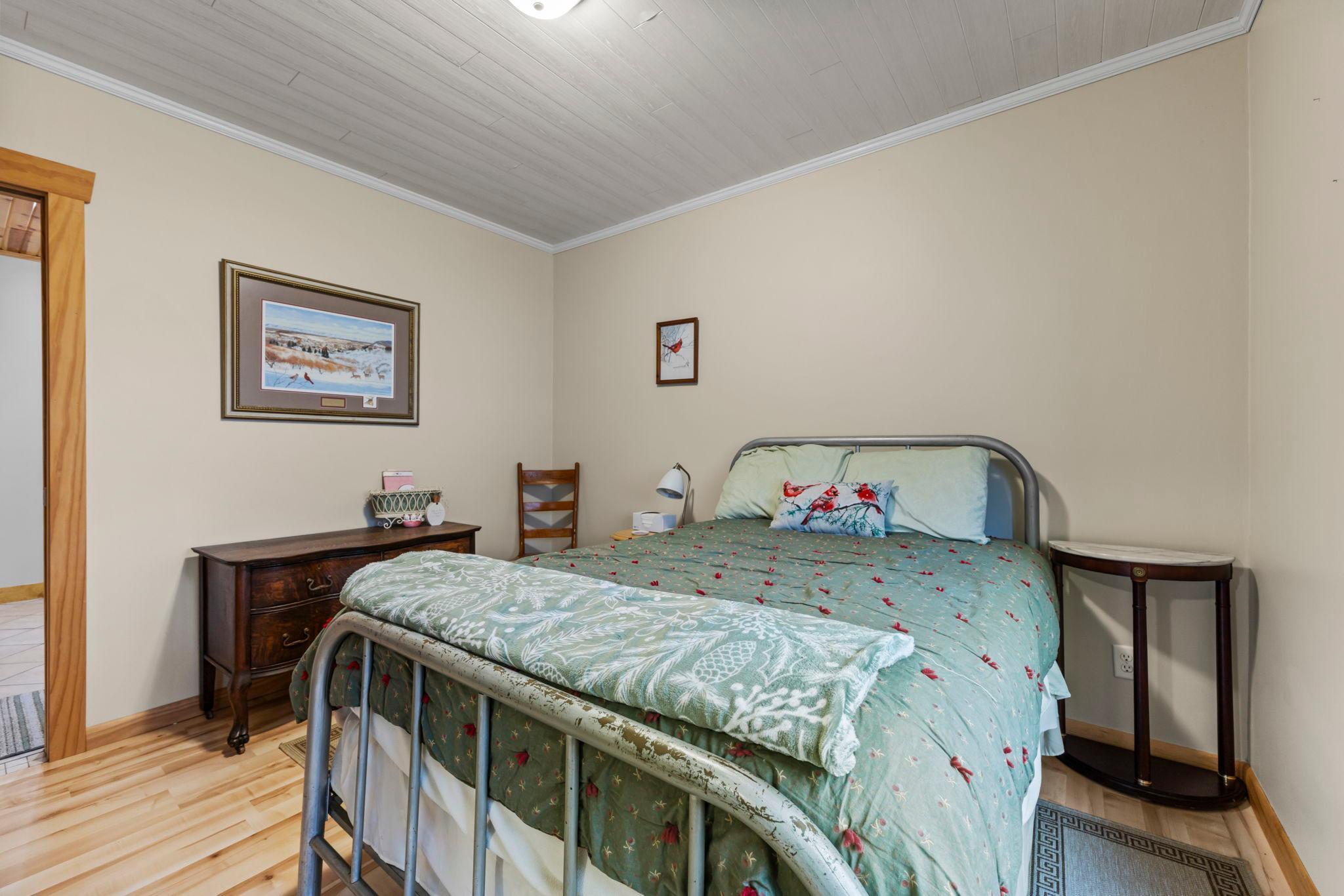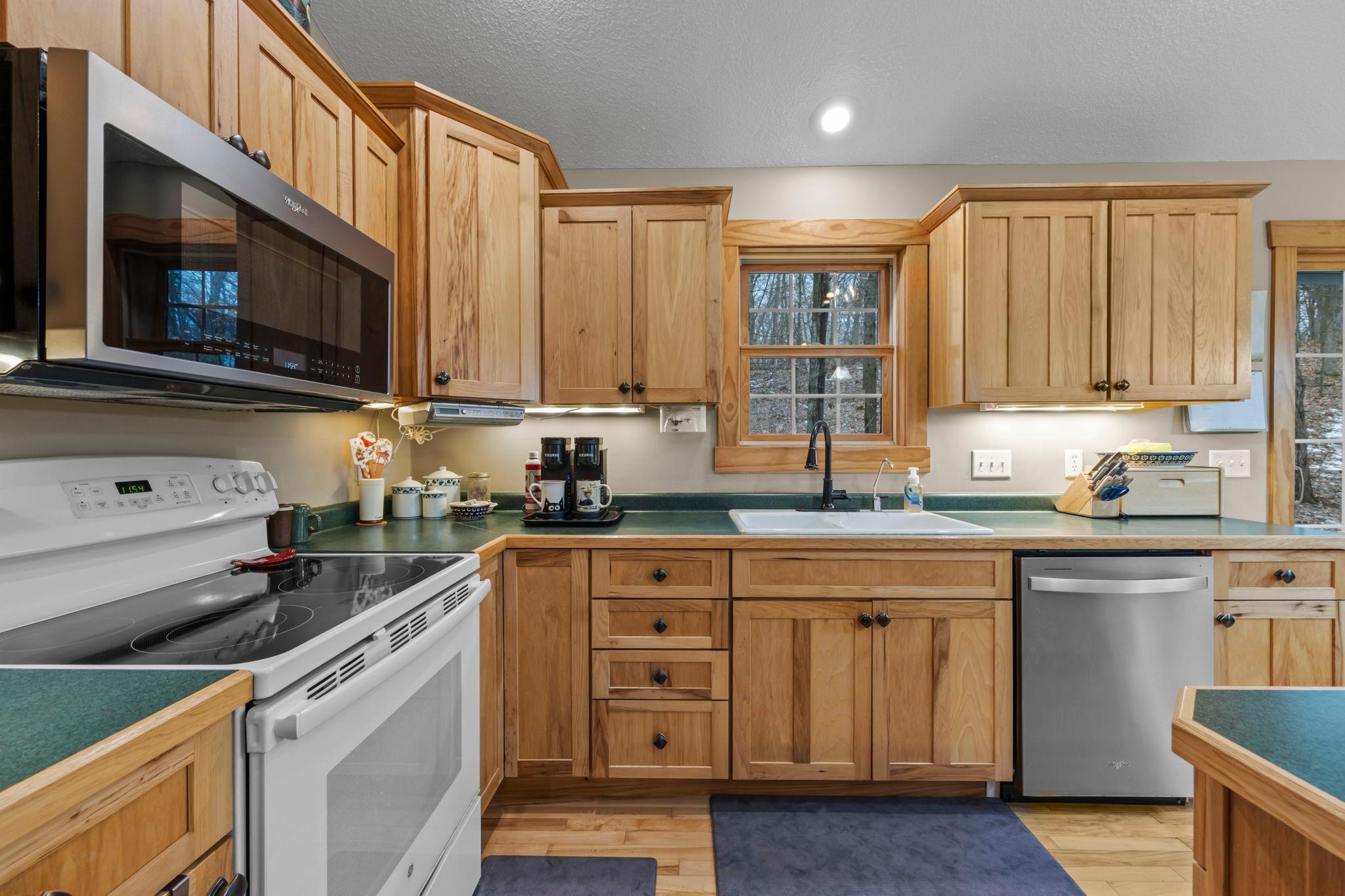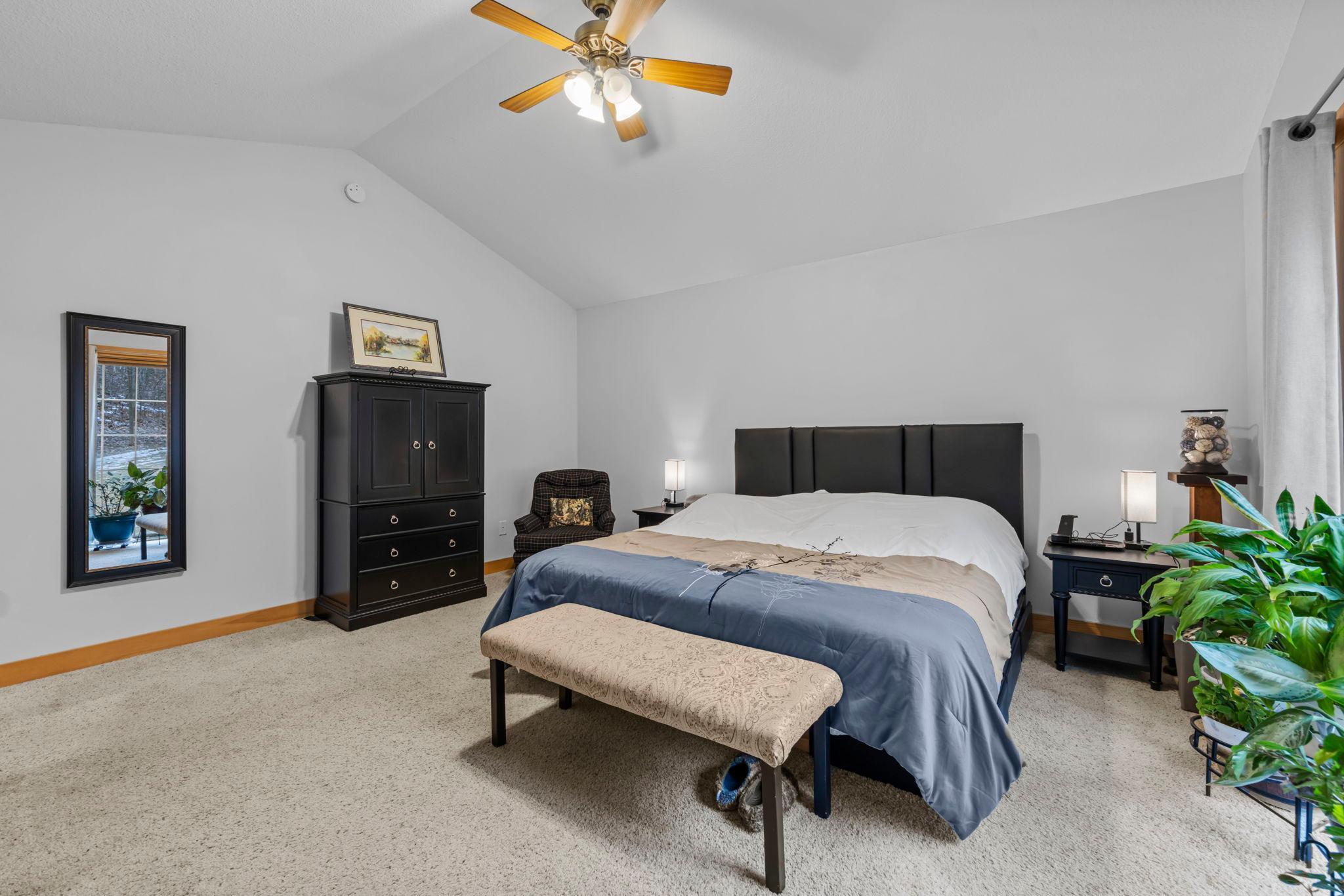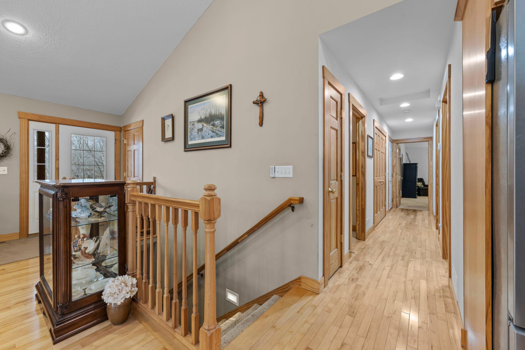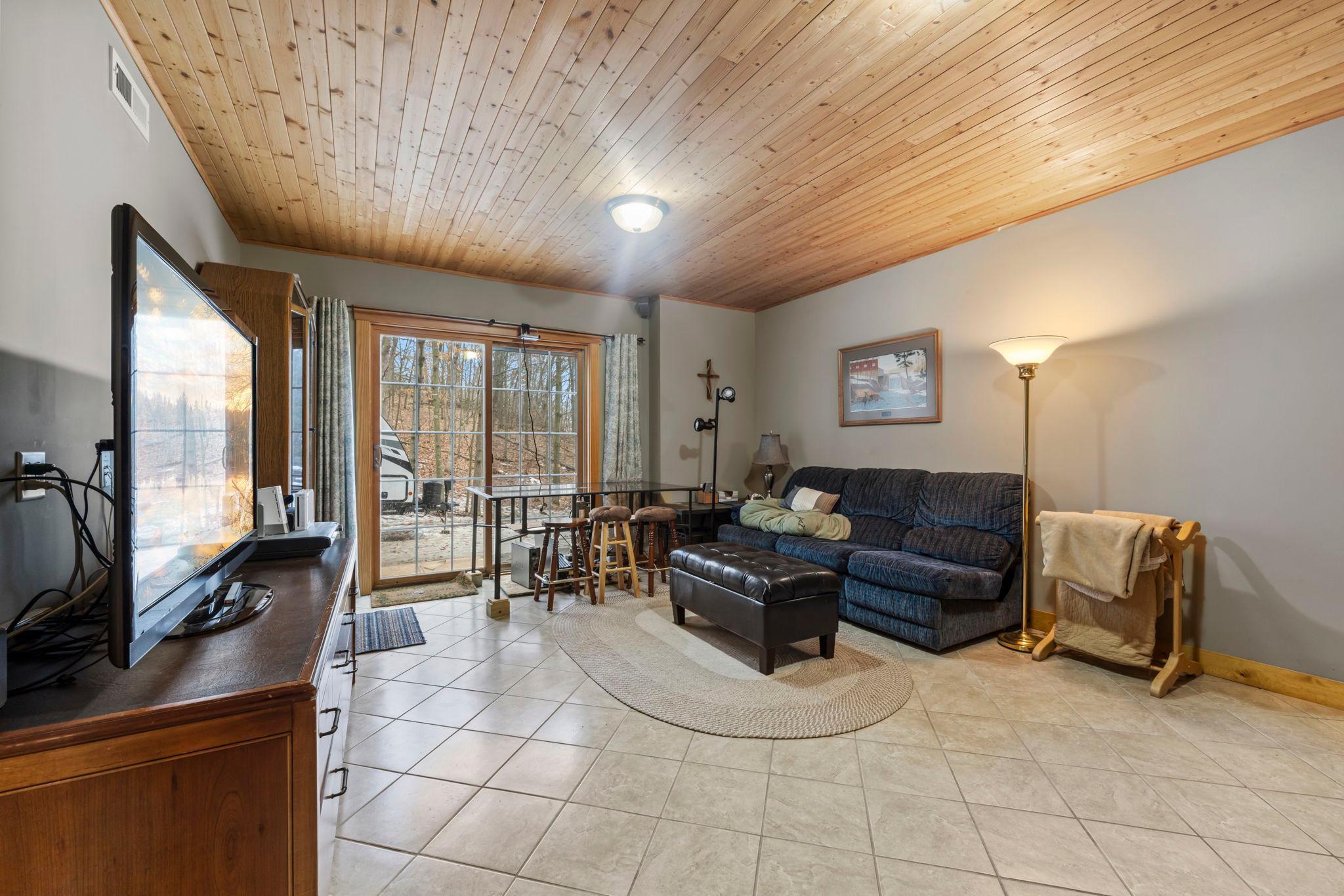 Tucked at the end of a private road, this peaceful country home located on 2 acres offers the perfect blend of privacy, nature, and comfort. Surrounded by mature trees and abundant wildlife, youll enjoy regular visits from deer, pheasant, squirrels, and songbirds, creating a truly serene setting. The inviting front porch is a perfect spot to enjoy morning coffee while taking in the quiet surroundings. Inside, the home features a beautiful open-concept layout with a vaulted ceiling and large windows that fill the living, dining, and kitchen areas with natural light. The kitchen is highlighted by lovely hickory cabinetry and flows seamlessly into the main living spaces, ideal for everyday living and entertaining. The main floor has two bedrooms, including a private owners suite with a walk-in closet and its own bathroom, along with convenient main-floor laundry. The finished lower level expands your living space with a comfortable family room featuring a walk-out patio door, a third bedroom, full bathroom, office space, and additional storage room. The attached 2-car garage is insulated. Major updates including a new roof in 2025, freshly stained cedar siding in 2025, plus newer appliances, AC and furnace in the past 5 years. Nature lovers will appreciate that DNR land adjoins the back of the property, offering direct access to a path leading to the renowned Ice Age Trail, perfect for hiking and enjoying the outdoors. Offering privacy, modern comforts, and a stunning natural setting while still being close to town, this property is truly atreasure. See 3D walk-through video and drone video!