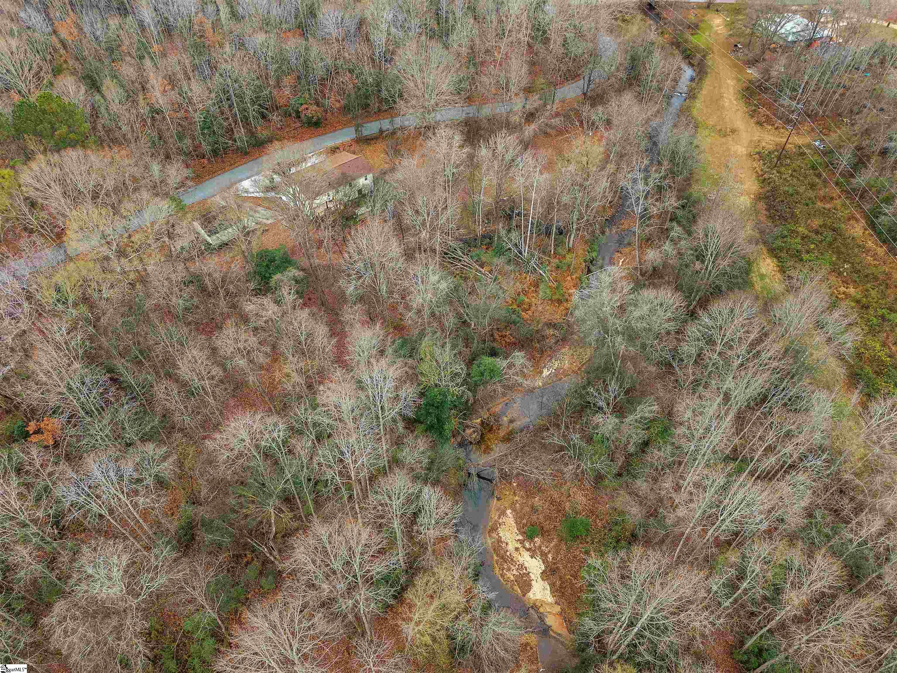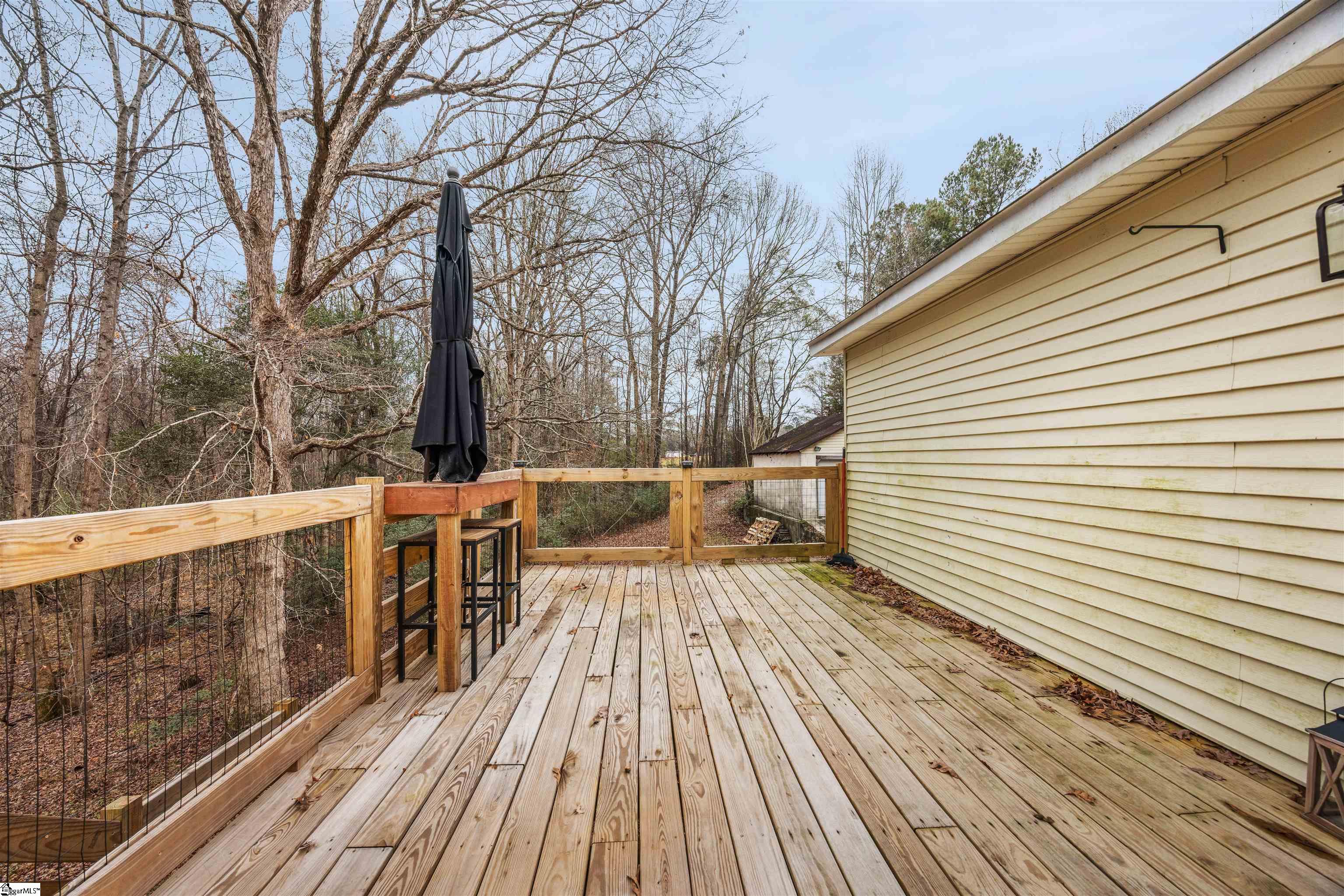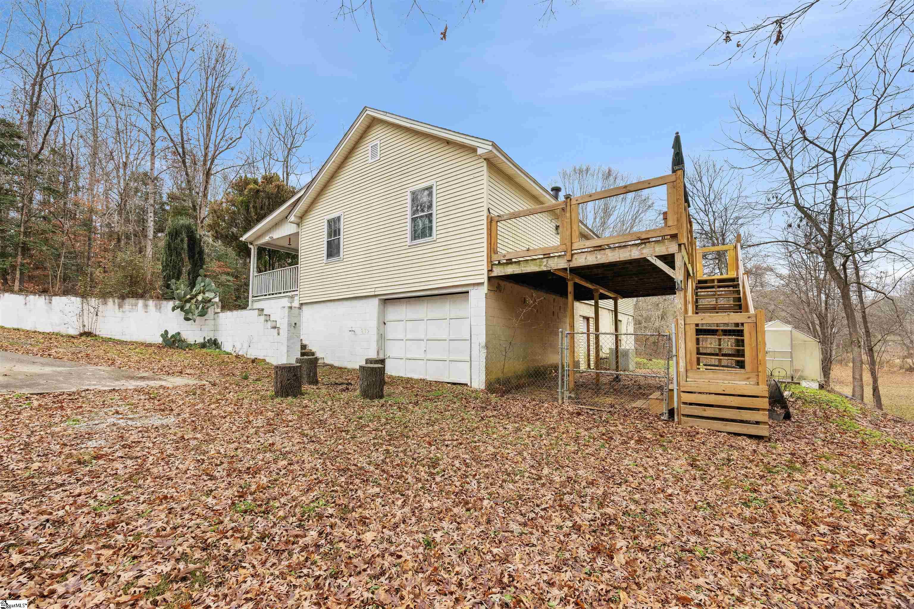 Picturesque country home with an active creek and a wooded lot, offering a huge front porch for outdoor living and a deck on the backside that would be perfect for entertaining, all just minutes from Five Forks or Pelham Rd in Simpsonville. The 2-bedroom, 1.5 bath with a huge walk-in huge could be altered to accommodate a third bedroom, and the plumbing is available for the half bath to be completed to a whole bath. If you need extra space or want a large workshop, you'll love the 24x24 detached garage. This property is being sold AS-IS.