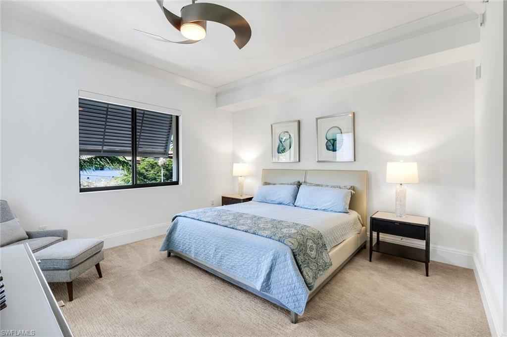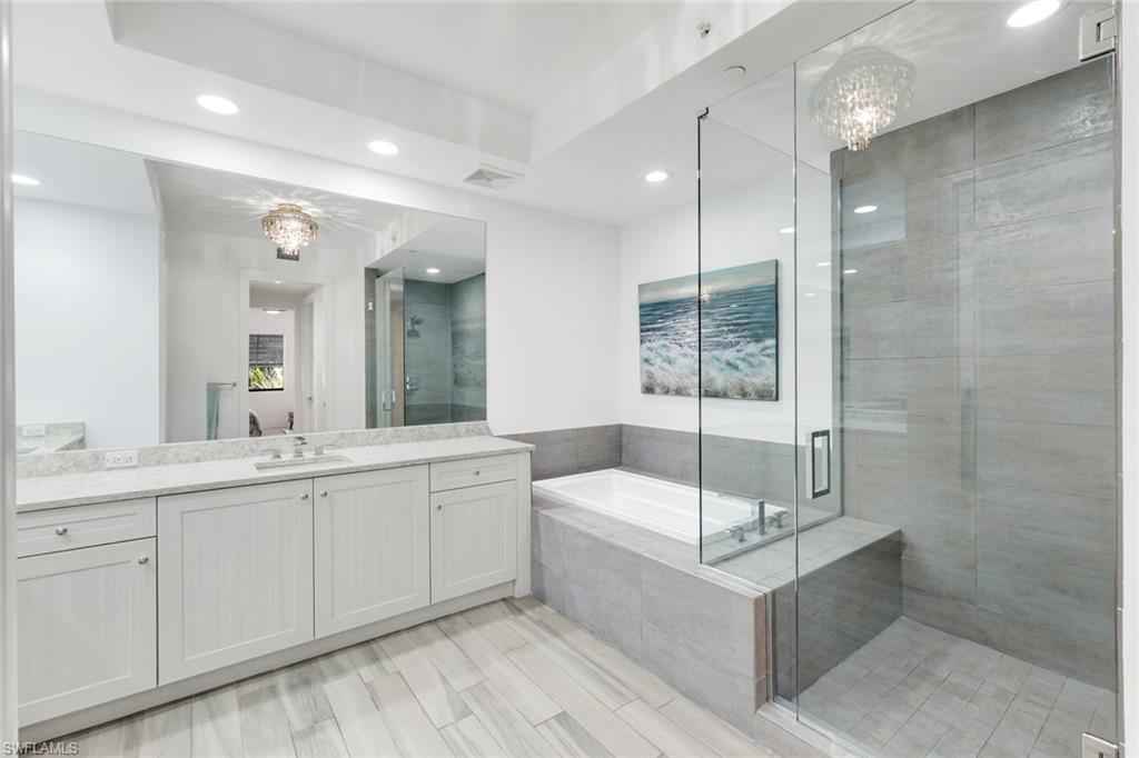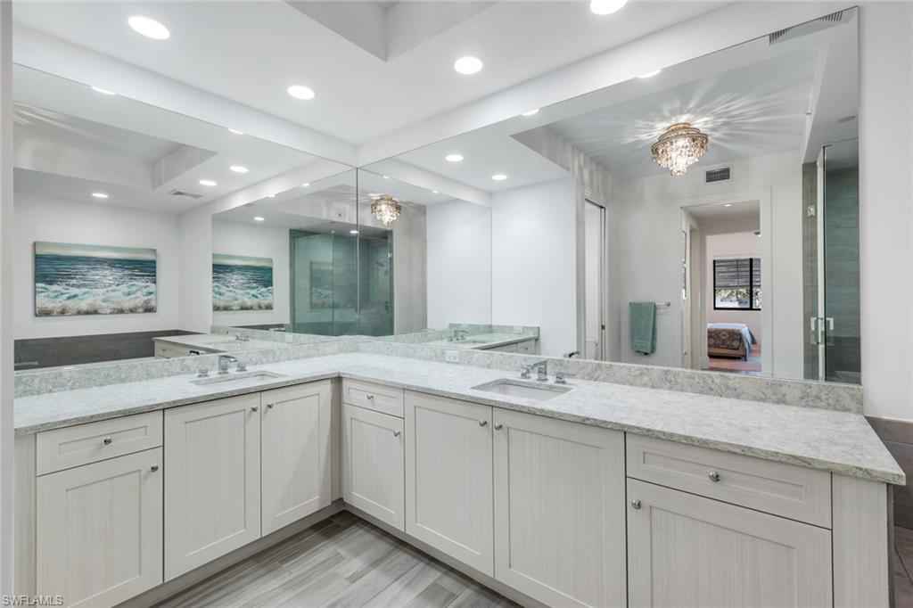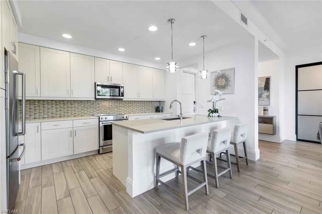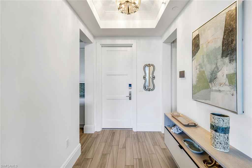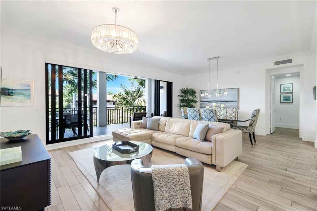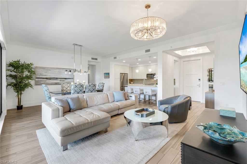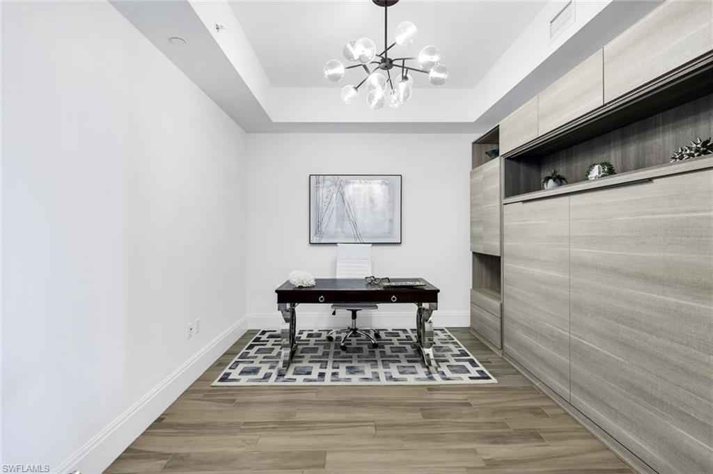 Welcome to this beautifully maintained, turnkey-furnished condominium in the heart of the Naples Design District. Western exposure bathes the home in warm afternoon light, while lush palm trees surrounding the lanai create a private, tropical oasis. Inside, the spacious great room provides the perfect place to relax on the sofa or enjoy delicious meals with family & friends. A custom den is accessed through striking metal and frosted glass doors, offering an elegant space for a home office or relaxation. A thoughtfully designed California Closets built-in wall features a queen-size Murphy bed and integrated dresser, allowing the den to easily convert into an additional guest bedroom. The bathrooms have been tastefully upgraded with custom tile finishes and glass door enclosures, enhancing both style and functionality. Naples Square residents enjoy an exceptional array of amenities, including a resort-style pool and spa, a fully equipped fitness room, and secured underground parking for two vehicles. Ideally located and surrounded by Naplesx2019; finest restaurants, shops, parks, and cultural attractions, this residence offers a vibrant lifestyle with unparalleled convenience. This exquisite condo presents a rare opportunity to enjoy upscale living in one of Naplesx2019; most desirable neighborhoods.