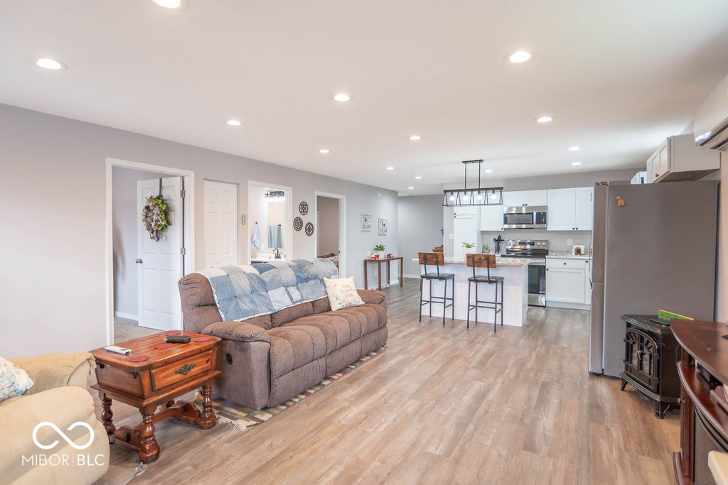 Step into easy living with this beautiful 3-bedroom, 2-bath ranch featuring a desirable open-concept floor plan. The bright living room flows effortlessly into the kitchen, highlighted by a center island with seating and stainless steel appliances that stay with the home. The primary suite offers a private ensuite bath, while two additional bedrooms share a full bathroom. Durable LVP flooring runs through the main living areas, with cozy carpet in the bedrooms. Enjoy your morning coffee on the covered front porch and take advantage of the spacious backyard with a large mini barn, perfect for storage, hobbies, or lawn equipment.