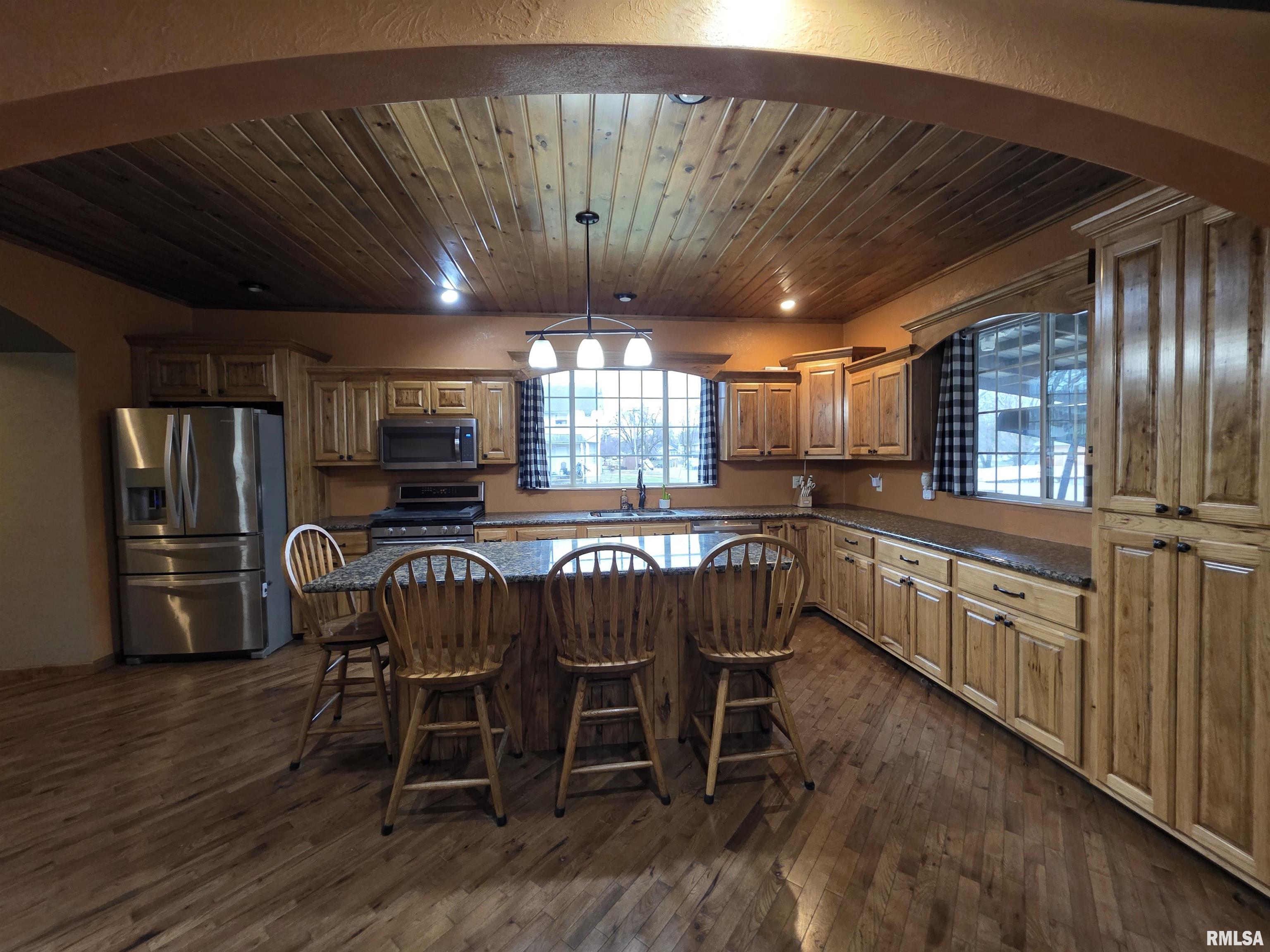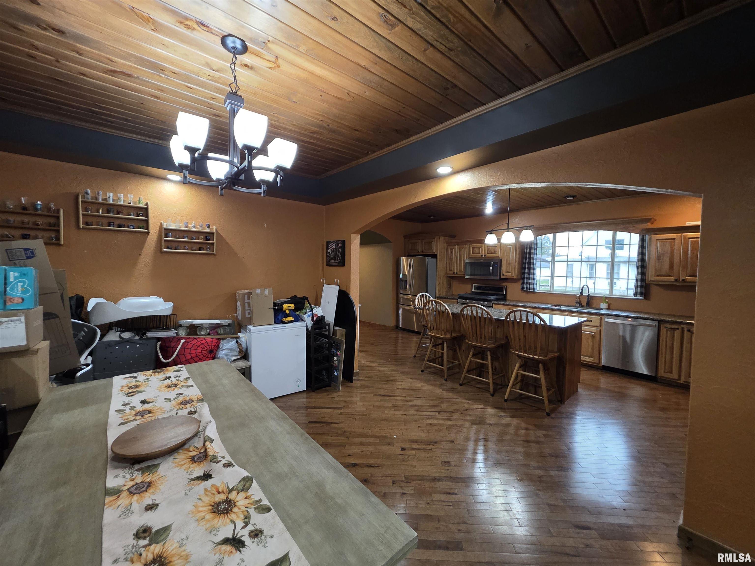 Beautifully updated 1,512 sq ft home with high-end finishes throughout! Stunning diagonal hardwood flooring sets the tone as you enter, leading into a show-stopping kitchen and dining area featuring granite countertops, custom cabinetry, and a gorgeous wood-slated ceiling that perfectly complements the flooring. Arched doorways add character and charm. The living room impresses with a vaulted ceiling, exposed beam detail, matching wood ceiling accents, and abundant natural light. The updated main bathroom offers modern finishes, while the primary suite features hardwood floors and a spa-inspired ensuite complete with granite vanity, jacuzzi tub with built-in shower, and custom tile surround. Solid hardwood doors and trim elevate every room. The laundry room doubles as a functional mudroom with backyard access. Solar panels on the home and garage provide energy efficiency benefits. Outside, youll find an oversized 3-car garage with new siding, soffits, garage door, and newer roof. A separate workshop/garden shed with lean-to offers additional storage or shaded patio space. This home blends craftsmanship, warmth, and thoughtful design, truly a standout property.
