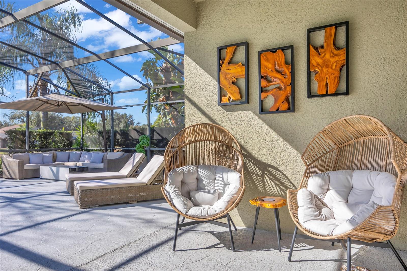 This modern, fully furnished residence sits on a beautifully landscaped, oversized lot offering rare privacy and an unbeatable location, gated community. Step inside and youre welcomed by an open, airy floor plan filled with natural light and stylish finishes. The gourmet kitchen, the heart of the homecomplete with quartz counters, farm sink, modern appliances, Sonos surround system, and luxury ceramic flooringflows seamlessly into the main living spaces and elevates every step, creating the perfect setting for everyday living and effortless entertaining. Every detail has been thoughtfully curated. The stylish office, converted from two bedrooms, offers exceptional versatility with double closets and a custom Murphy bed. The main suite is a true calming sanctuary, showcasing a tray ceiling, crown molding, recently replaced several windows, and a spa-inspired bathroom with a standalone soaking tub, walk-in shower, double sinks, and an impressive closet designed for comfort and convenience. But its the outdoor living that truly defines the lifestyle here. Imagine mornings by the screened saltwater pool, afternoons grilling in your outdoor kitchen are, and evenings relaxing under the covered patio as the breeze moves through the palms. With direct access to a full bath, this space becomes your personal oasis- functional and luxurious. This home invites you to slow down, breathe deeply, and truly enjoy where you live. Tucked away on a beautifully landscaped, oversized lot, it offers the kind of privacy and serenity that instantly feels like a retreat. Comes fully furnished. Roof 2018/ main suite has new windows/ water irrigation on well/