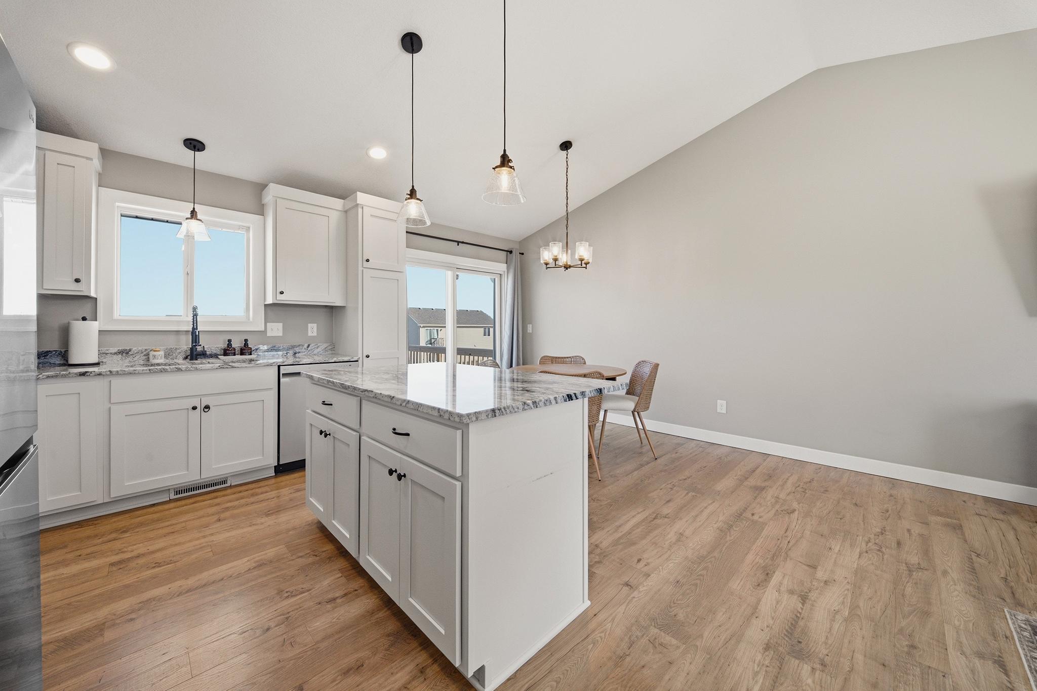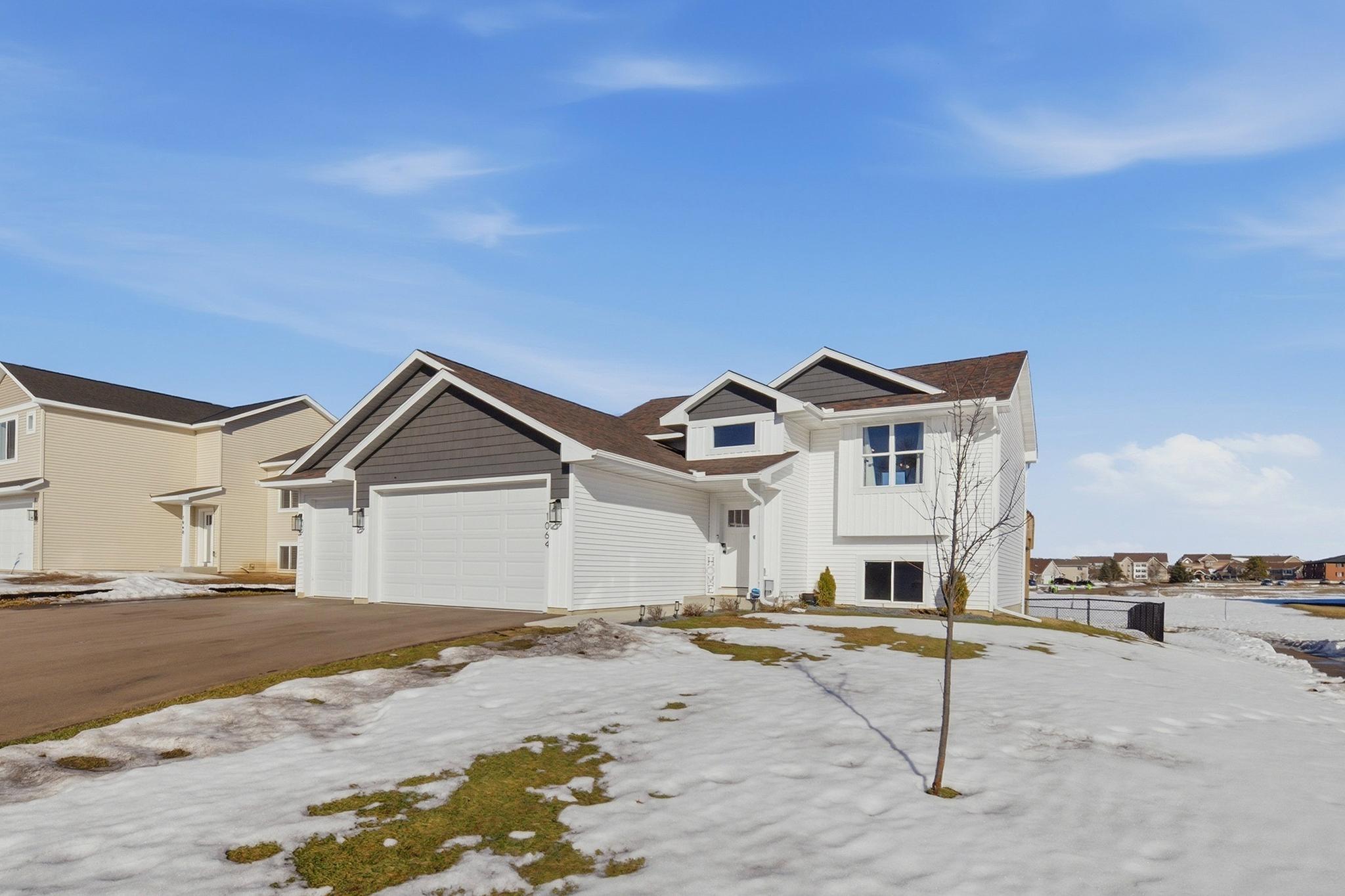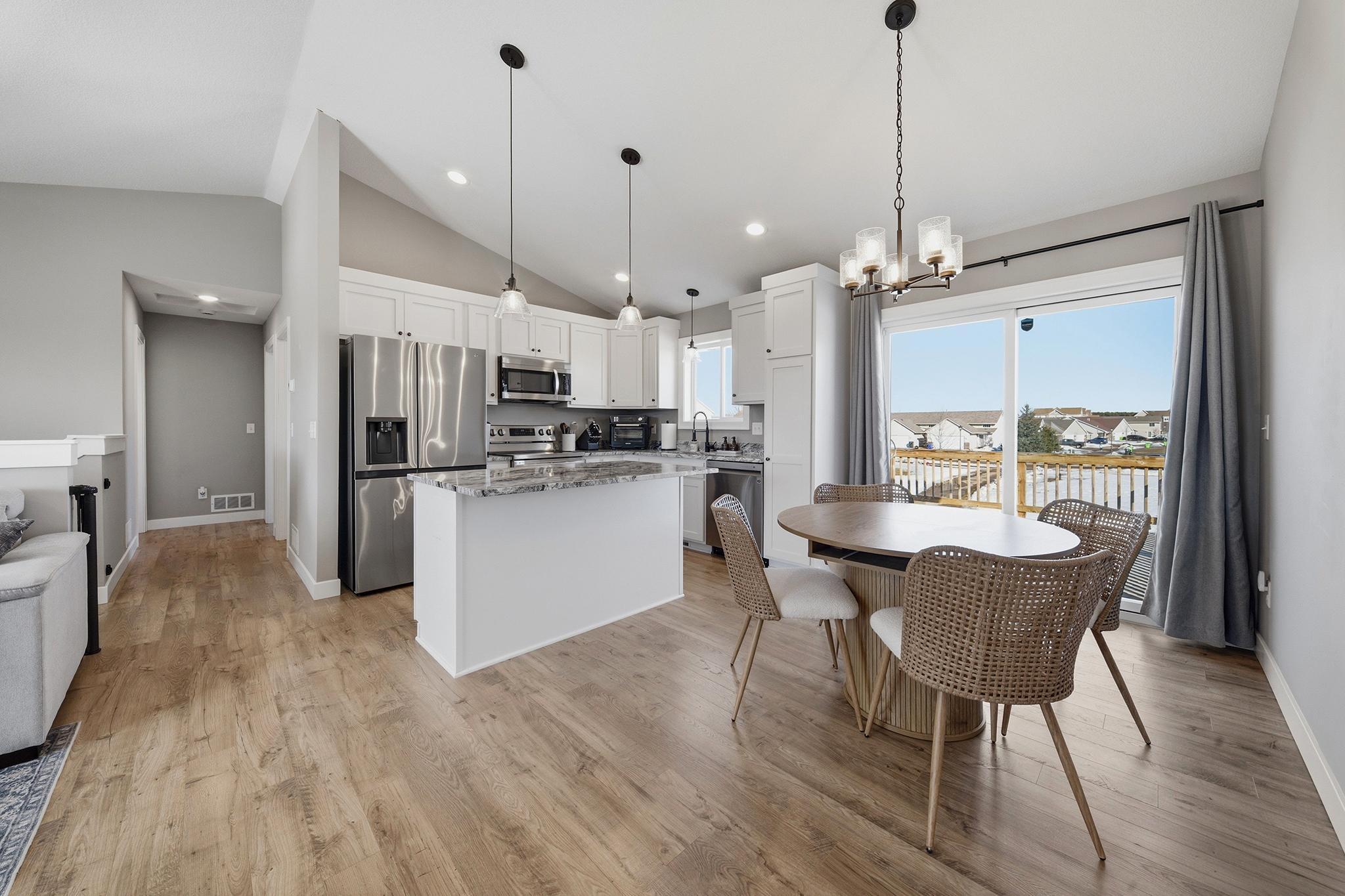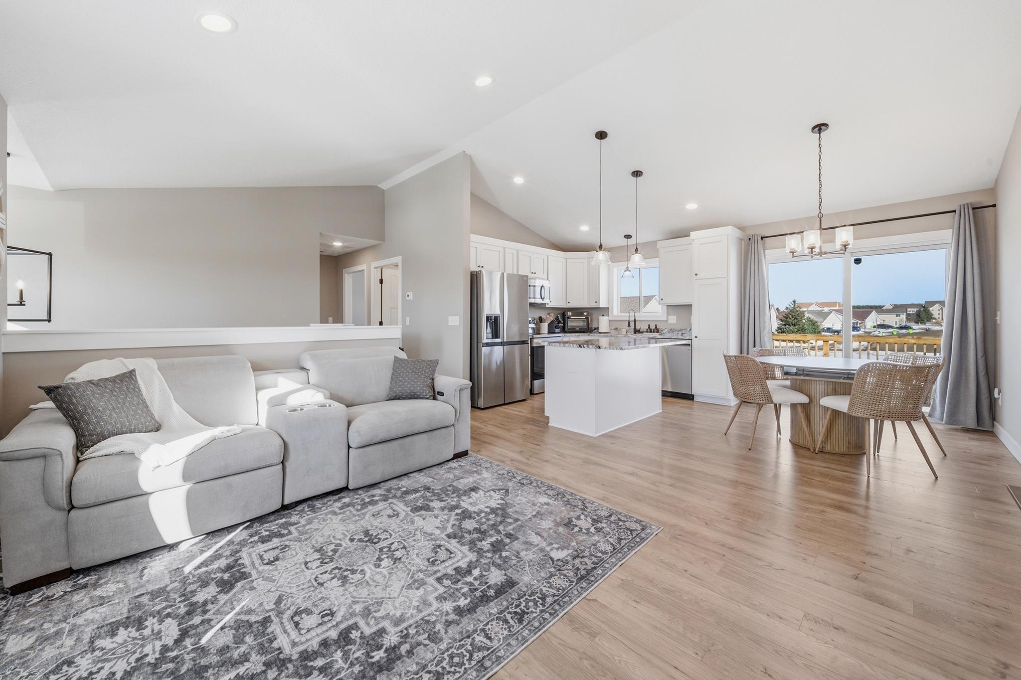 This beautifully maintained home, built in 2024, offers a rare opportunity to enjoy the benefits of newer construction without the wait. Thoughtfully cared for over the past two years, this move-in ready home allows you to skip the time, rising costs, and uncertainty of building while still enjoying the modern design that buyers desire. This home provides an inviting open-concept layout featuring vaulted ceilings, abundant natural light, and durable laminate flooring throughout the main living areas. The bright white kitchen serves as the centerpiece of the home, showcasing granite countertops, ample cabinetry, and a seamless flow into the dining and living spacesperfect for both everyday living and entertaining. The main level includes two comfortable bedrooms and a full bathroom along with the primary living areas. Downstairs, the finished walkout basement expands your living space with a large family room, an additional bedroom, and another full bathroom. The walkout patio door provides easy access to the patio beneath the deck, a fenced-in backyard, and an outdoor space ideal for relaxing or hosting guests. This property is situated close to walking trails, dog parks, city conveniences, local hotspots, and the New Richmond Golf Club. Enjoy the layout and complete finishes of newer construction, without the hassle of building. Do not miss this opportunity, reach out to schedule your private showing today! This property is owned by a licensed real estate broker.