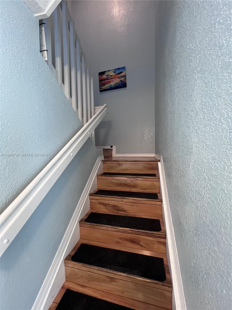 This is a two-story, three-bedroom condo unit in a tranquil community. The laundry room is located on the first floor of the unit, and all three bedrooms are upstairs.