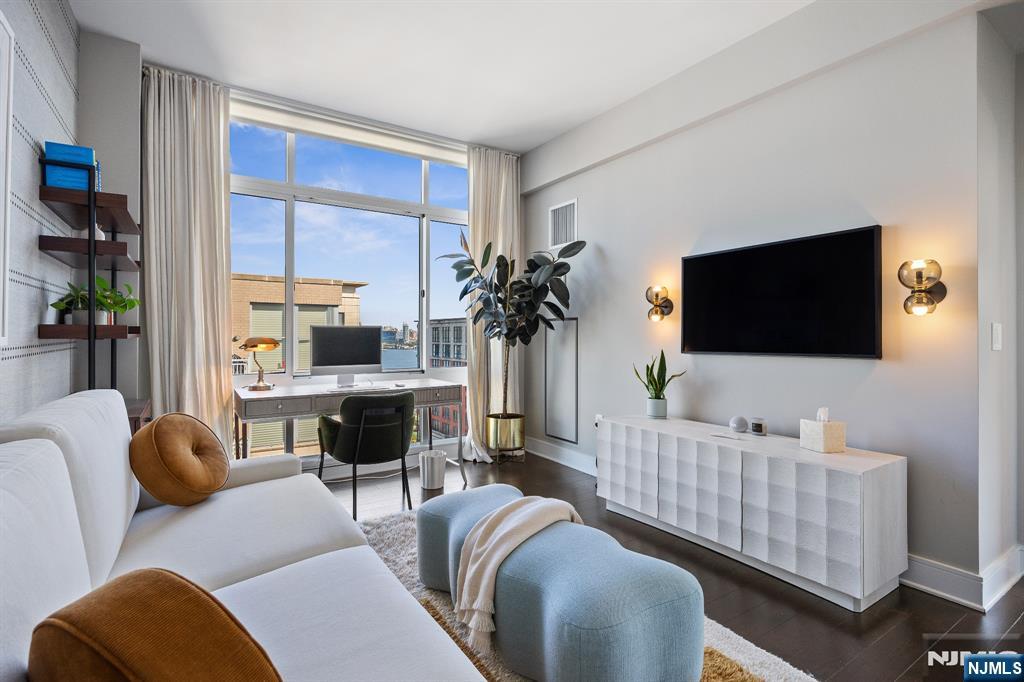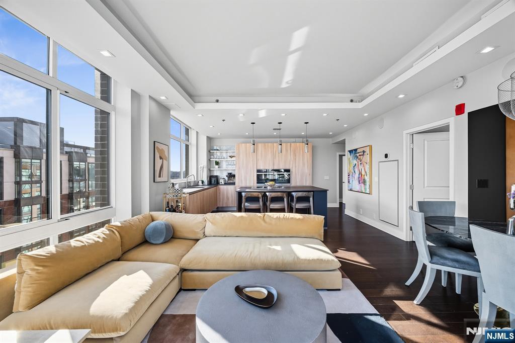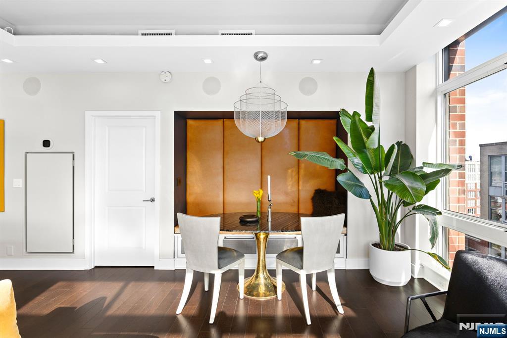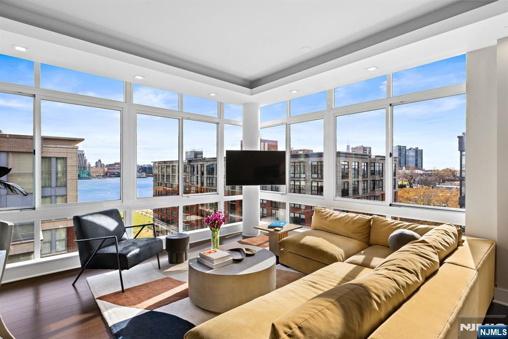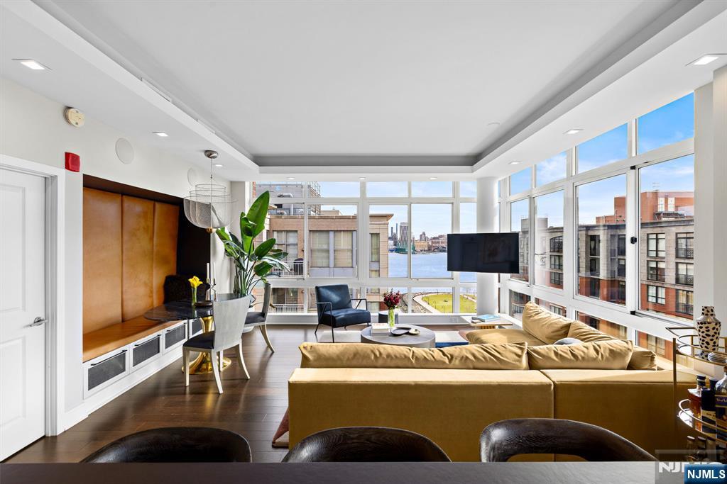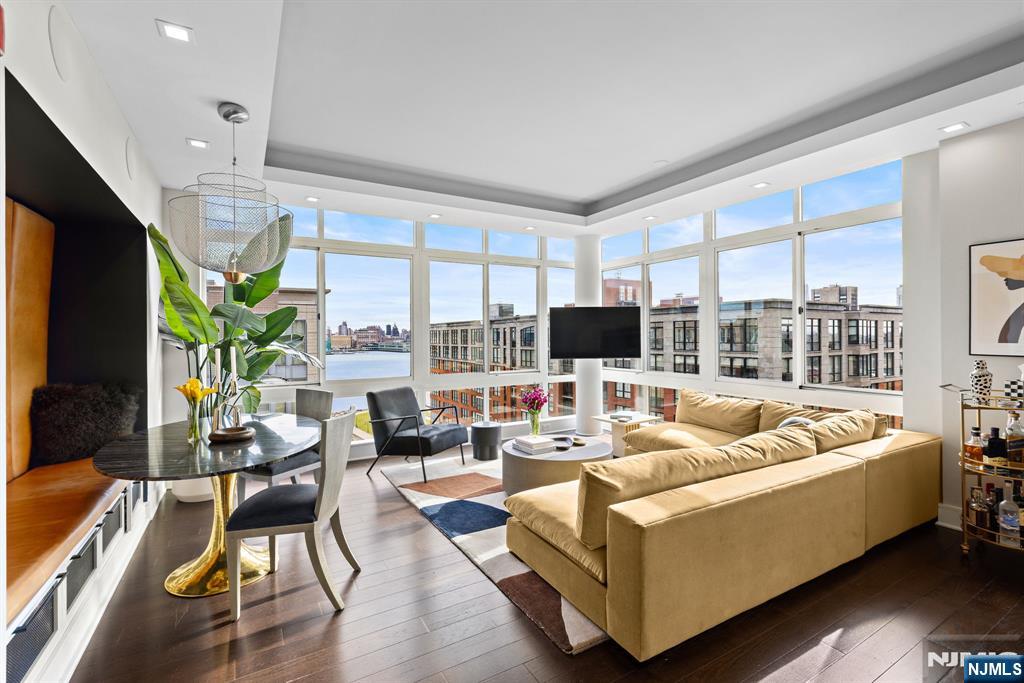 Stunningly designed 2 bed/2 bath corner Penthouse with southeast NYC & Hudson River views, right here in the luxury waterfront community of 1100 Maxwell Ln. This one-of-a-kind home was described as chic but cozy when featured in DesignNJ. The kitchen (designed by Mimi&Hill) is appointed with Arclinea cabinets, Dekton countertops, and Carrera marble backsplash, as well as Miele appliances including an induction cooktop, downdraft exhaust, 2 wall ovens (conventional and steam), a SubZero refrigerator and Gaggenau dual zone wine cooler. Raised ceiling heights in the kitchen and living areas accentuate the open feel created by the floor-to-ceiling windows, and the bespoke built-in dining banquette with a Moooi chandelier truly makes this living space complete. The oversized primary bedroom is soundproofed with a walk-in closet and ensuite bath with double vanity. The second bedroom is spacious with NYC/river views. Custom closets and hall pantry, automated window treatments, gleaming hardwood floors, and deeded parking spot #69 round out this perfect home. The communitys luxury amenities include 24/7 concierge and security, 2 gyms, 2 pools, 2 playrooms, 2 rooftop decks with BBQ grills, community rooms, and shuttle service to and from the Path. The building is conveniently located near the NYC Ferry, bus stop, shops, restaurants, and everything that uptown Hoboken has to offer.