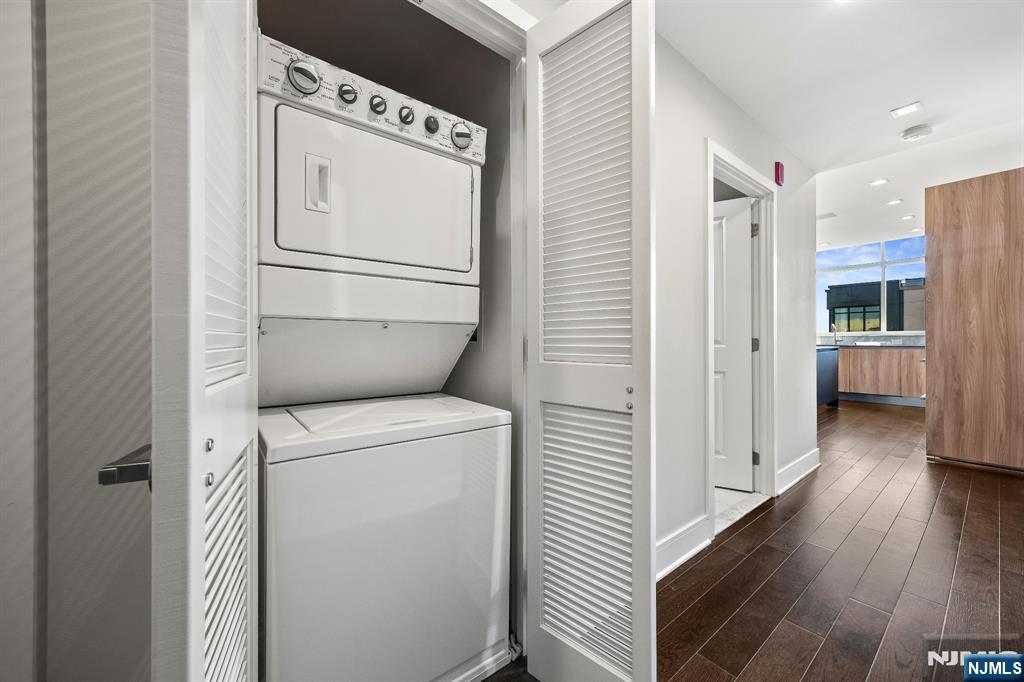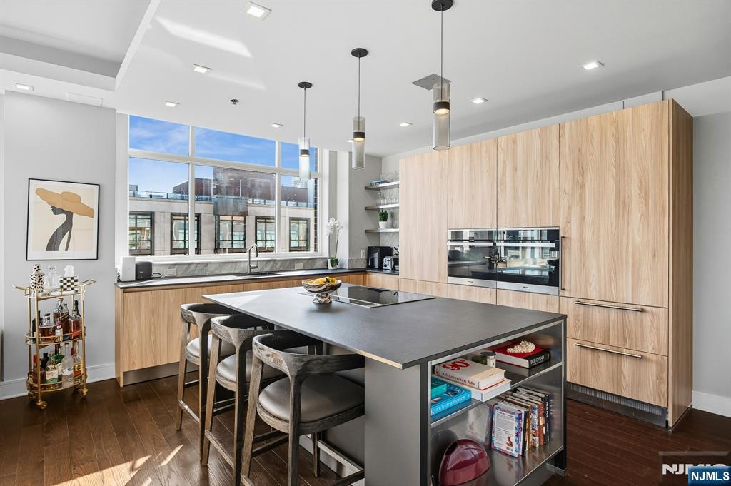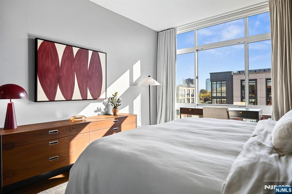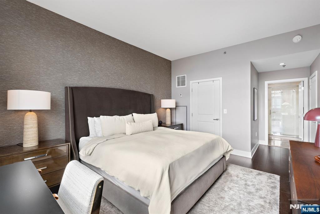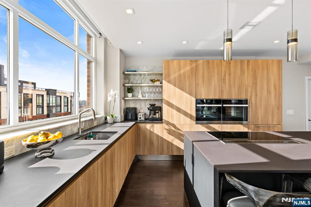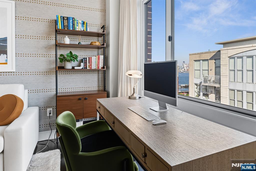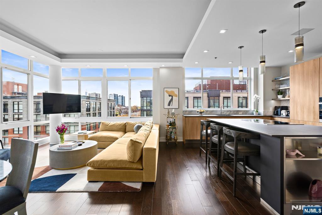 Stunningly designed 2 bed/2 bath corner Penthouse with southeast NYC & Hudson River views, right here in the luxury waterfront community of 1100 Maxwell Ln. This one-of-a-kind home was described as chic but cozy when featured in DesignNJ. The kitchen (designed by Mimi&Hill) is appointed with Arclinea cabinets, Dekton countertops, and Carrera marble backsplash, as well as Miele appliances including an induction cooktop, downdraft exhaust, 2 wall ovens (conventional and steam), a SubZero refrigerator and Gaggenau dual zone wine cooler. Raised ceiling heights in the kitchen and living areas accentuate the open feel created by the floor-to-ceiling windows, and the bespoke built-in dining banquette with a Moooi chandelier truly makes this living space complete. The oversized primary bedroom is soundproofed with a walk-in closet and ensuite bath with double vanity. The second bedroom is spacious with NYC/river views. Custom closets and hall pantry, automated window treatments, gleaming hardwood floors, and deeded parking spot #69 round out this perfect home. The communitys luxury amenities include 24/7 concierge and security, 2 gyms, 2 pools, 2 playrooms, 2 rooftop decks with BBQ grills, community rooms, and shuttle service to and from the Path. The building is conveniently located near the NYC Ferry, bus stop, shops, restaurants, and everything that uptown Hoboken has to offer.