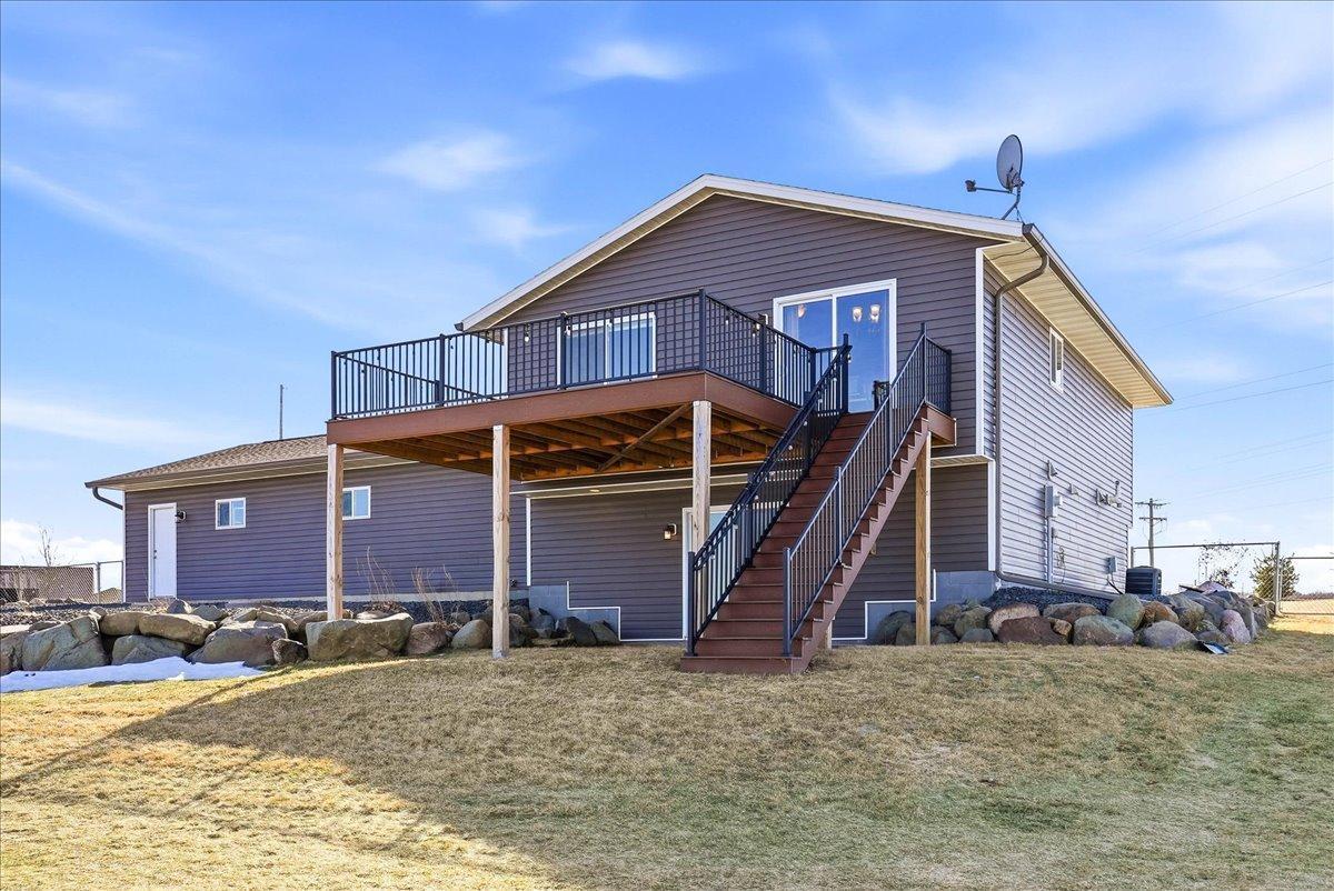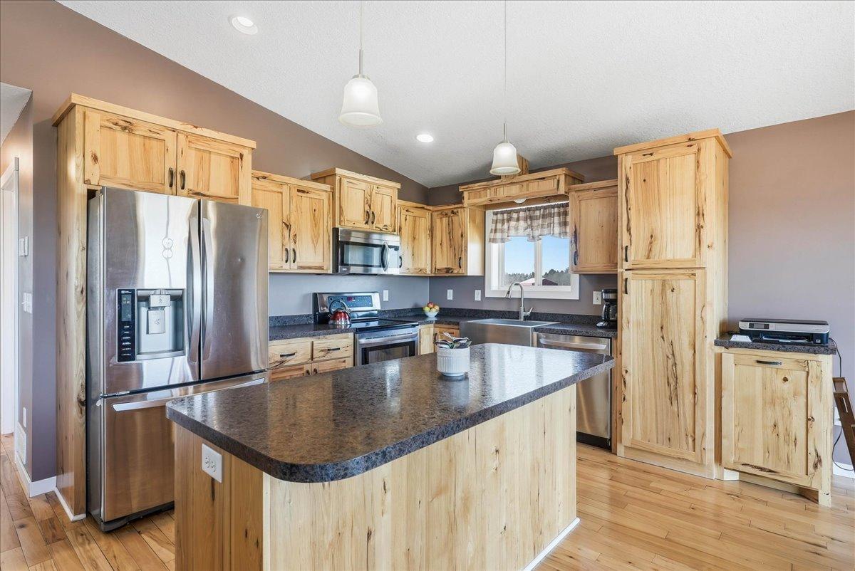 This is the one buyers have been waiting for! Offering a functional and thoughtfully designed floorplan, this home combines comfort, quality, and beautiful country views.The main level features real hickory flooring and a warm, inviting kitchen with hickory cabinetry. The finished lower level provides a spacious family room perfect for relaxing or entertaining.Step outside to the maintenance-free 24' x 14' deck overlooking 2 acres of yard with exceptional landscaping, surrounded by farmland, creating a peaceful setting with room to breathe. Great layout, scenic location near Sand Lake landing, and move-in ready condition this home checks all the boxes.