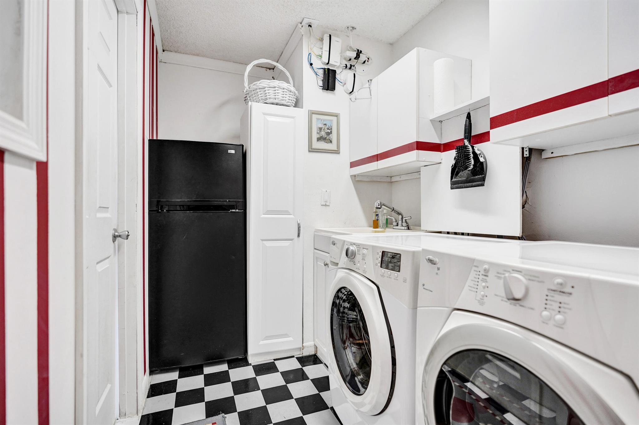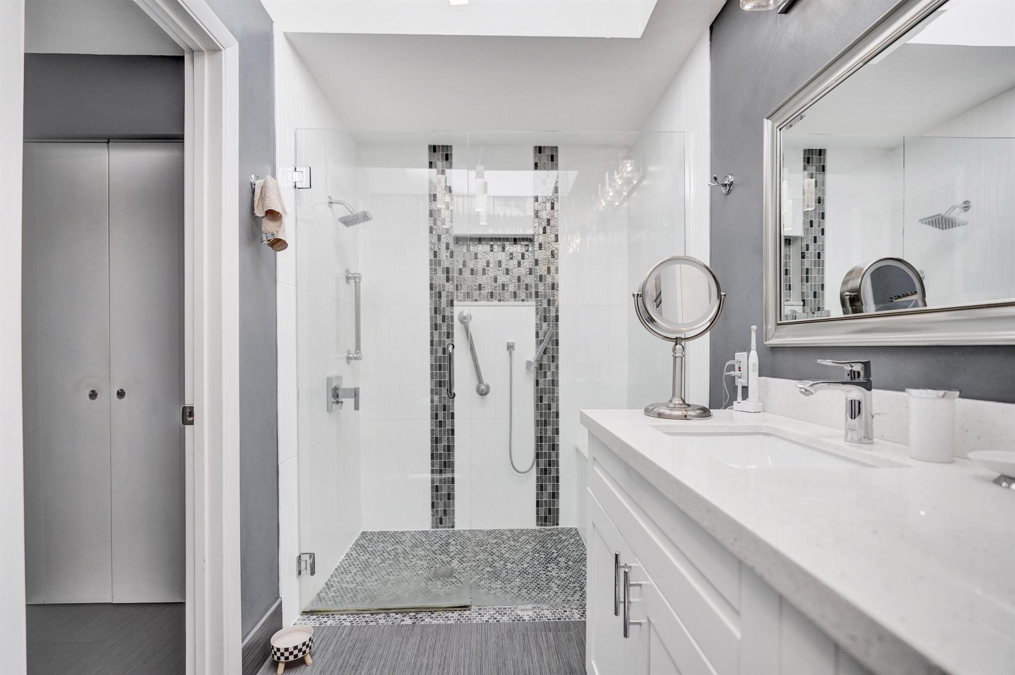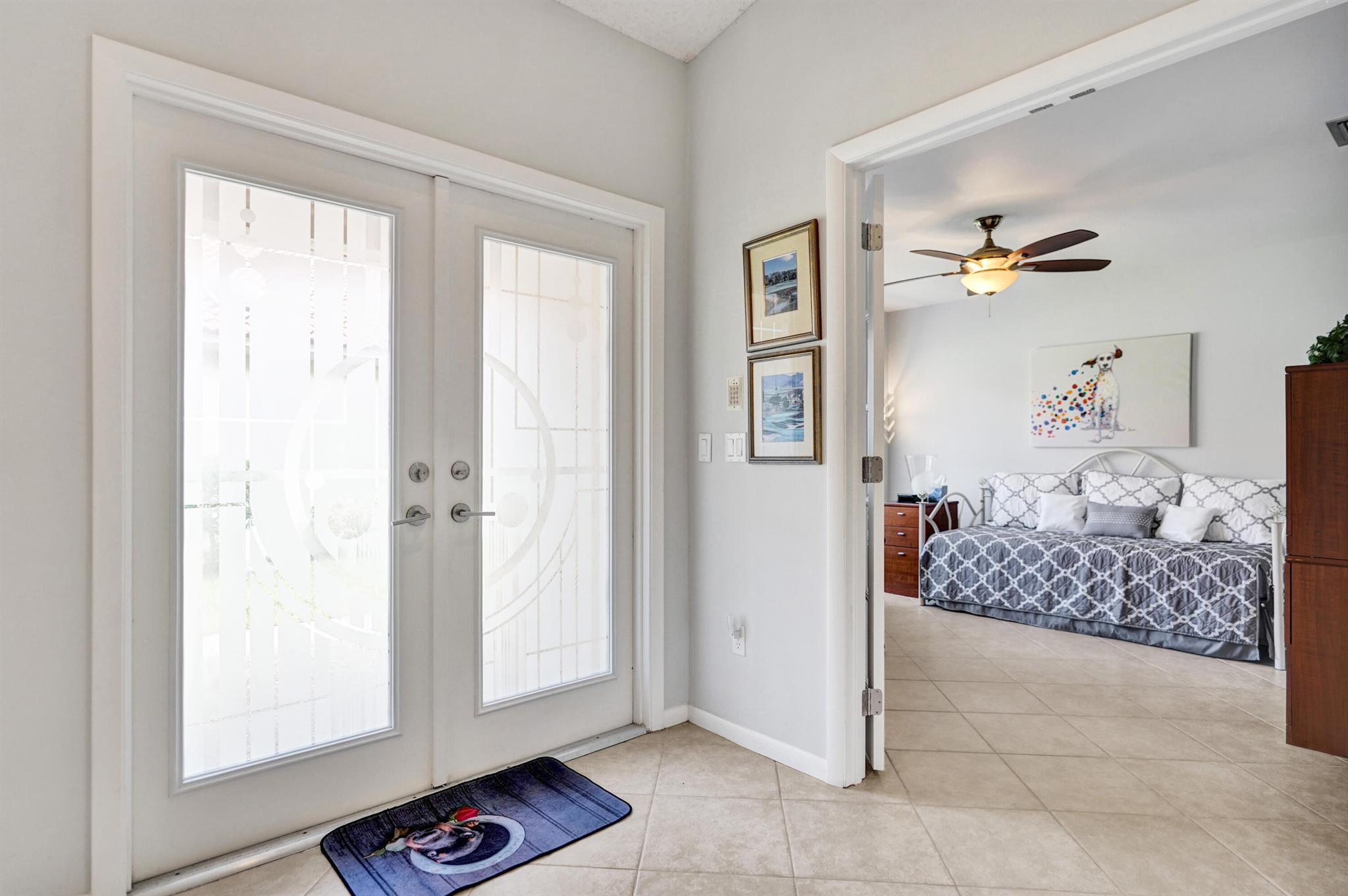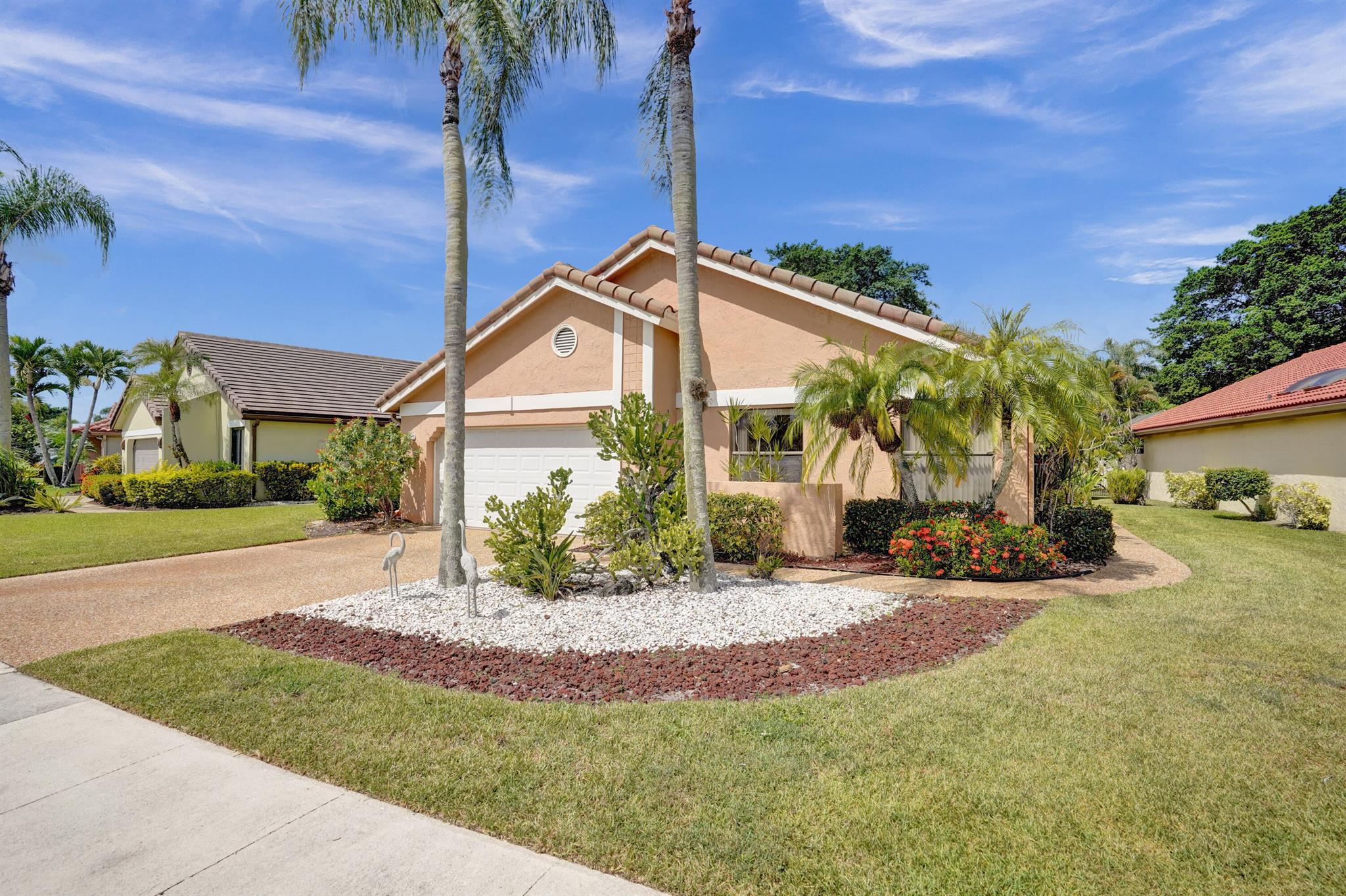Come see this lovely three bedroom, two bathroom home in the all-age community of Boca Woods Country Club. From the moment you enter, you will feel the space and openness...there are cathedral ceilings in the main living area and the kitchen wall has been taken down - the island makes entertaining so easy. Stainless steel appliances and plenty of cabinets. The kitchen and bathrooms were renovated several years ago and they still look great. You will love the amazing primary bathroom with the added linen closet. For continuity, ceramic tile has been used throughout the house. The washer and dryer area has been enclosed and a laundry room was created where there is also an extra refrigerator. And there are no rear neighbors - just a beautiful view of the 6th green of the Lakes course.