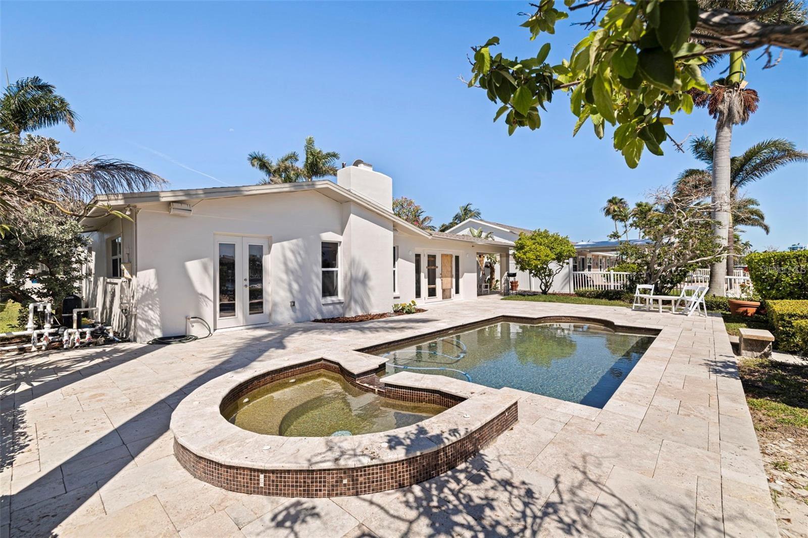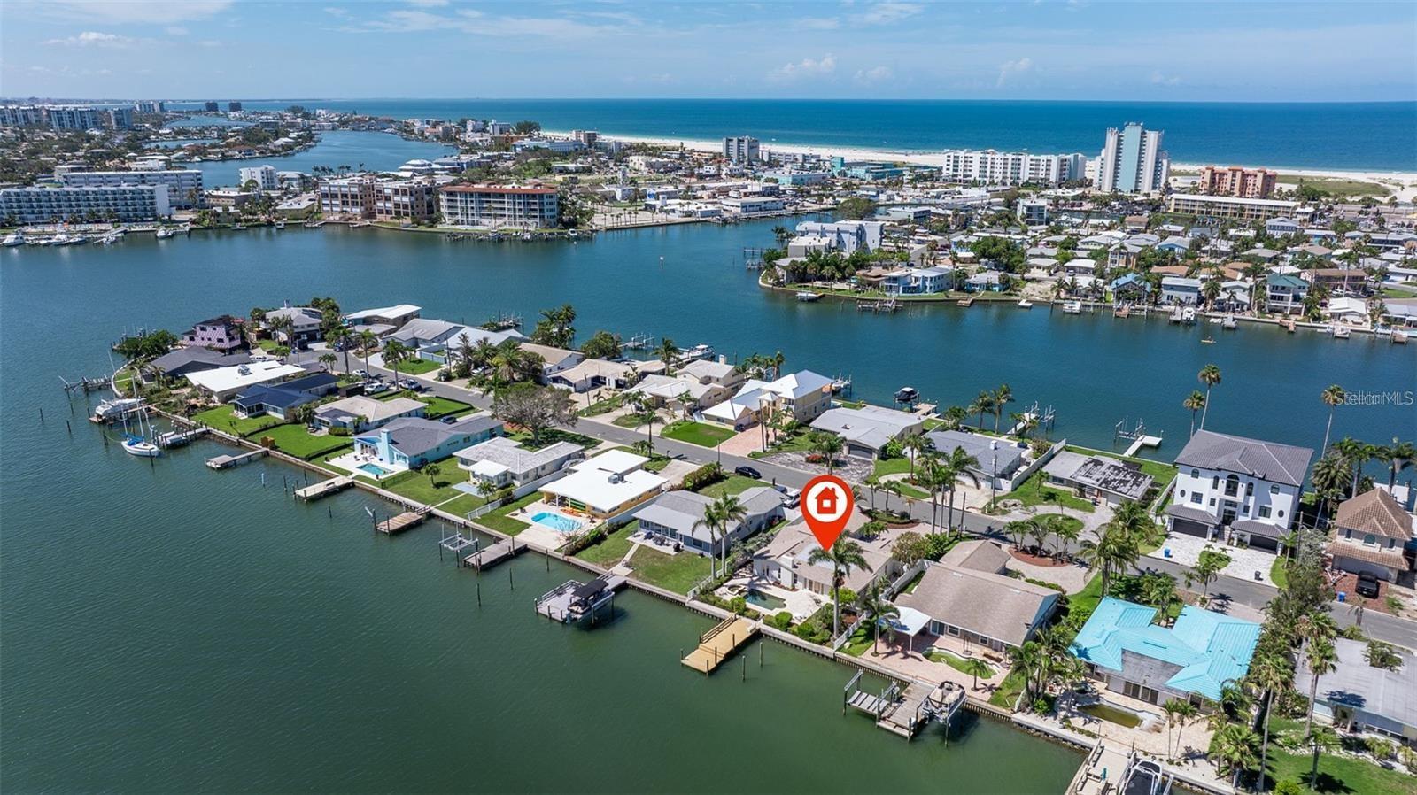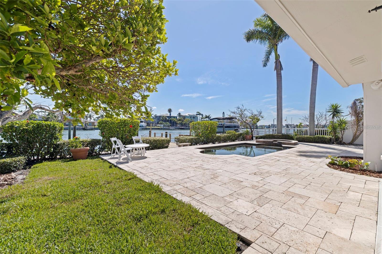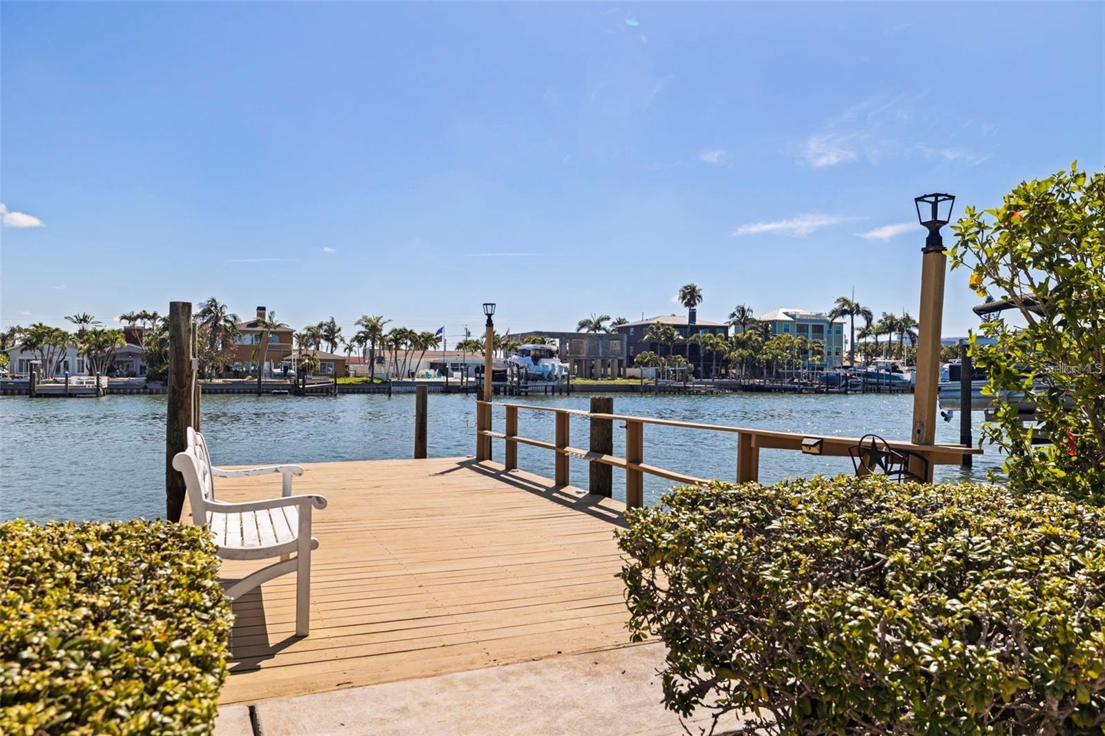 Welcome to this exceptional Isle of Palms waterfront residence, located in the charming community of Treasure Island. This stunningly renovated, 3-Bedroom, 2-Bathroom, 2-Car Garage, executive pool home with dock, is situated on an extra wide sailboat water canal with easy, immediate access to Boca Ciega Bay and the Gulf Of Mexico. As you enter through the gated private courtyard and the paired glass entry doors, an immediate feeling of comfortable elegance is apparent. The entry foyer is graced with waterfront views that bring a peaceful and light-filled ambiance to the open family living spaces. The large, open kitchen is at the center of the home, featuring expansive granite countertops and solid wood cabinets, and brand new stainless steel appliances. Generous storage is provided, and the entertaining area features comfortable bar seating for at least 3 -4 persons. The spacious formal dining area boasts a tray ceiling and room for a large dining table, easily seating 8 guests. Glass french doors open from the dining area to the spacious covered lanai and pool deck and has expansive views to the waterfront and beyond. The formal living room features an elegant gas fireplace. This residence is designed with a split floor plan with the two secondary bedrooms on one side of the home. This wing features a beautifully updated hall bathroom with a gorgeously tiled waterfall steam shower with frameless glass enclosure, and granite-topped floating vanity, servicing the secondary bedrooms as well as serving as a powder room for guest use. The two secondary bedrooms are generously sized with ample closet space and the secondary bedroom on the rear of the home features paired glass doors leading out to the sparkling pool and spa. There are lovely plantation shutters throughout the home offering privacy and a smart look and feel. The very private and peaceful primary suite offers a tranquil retreat for the homeowner(s) including a spacious spa-like primary bathroom with vaulted ceiling, a deep Kohler soaking tub in which to relax away the stress of the day, a spacious walk-in shower with a frameless glass enclosure, and a modern vanity with granite top. The luxury of this residence extends to the lush and private outdoor living spaces of the covered lanai and the beautiful paver deck, surrounding the beautiful pebble-tec pool and spa which overlooks the tranquil waters of Boca Ciega Bay. The home is perfect for boaters as it offers a large private dock with wood decking and water and electrical service. The seawall has been replaced with PVC sheet pile and a very substantial concrete cap. The homes roof was replaced in March of 2023 and the exterior was newly painted in August 2023. Let your cares fade as you relax poolside listening to the sounds of the breeze through the palms and watch the dolphins play in the canal. The pristine beaches and sparkling waters and sunsets of Treasure Island's world renown beaches and nightly sunsets are less than a 1/2 mile away.
