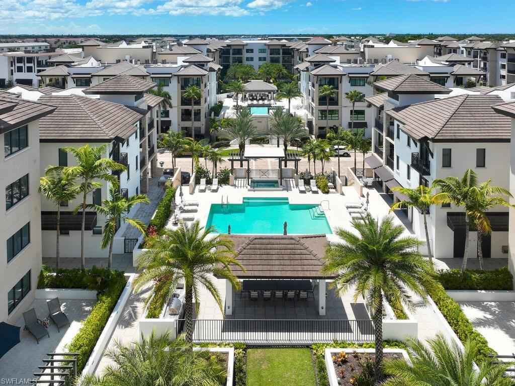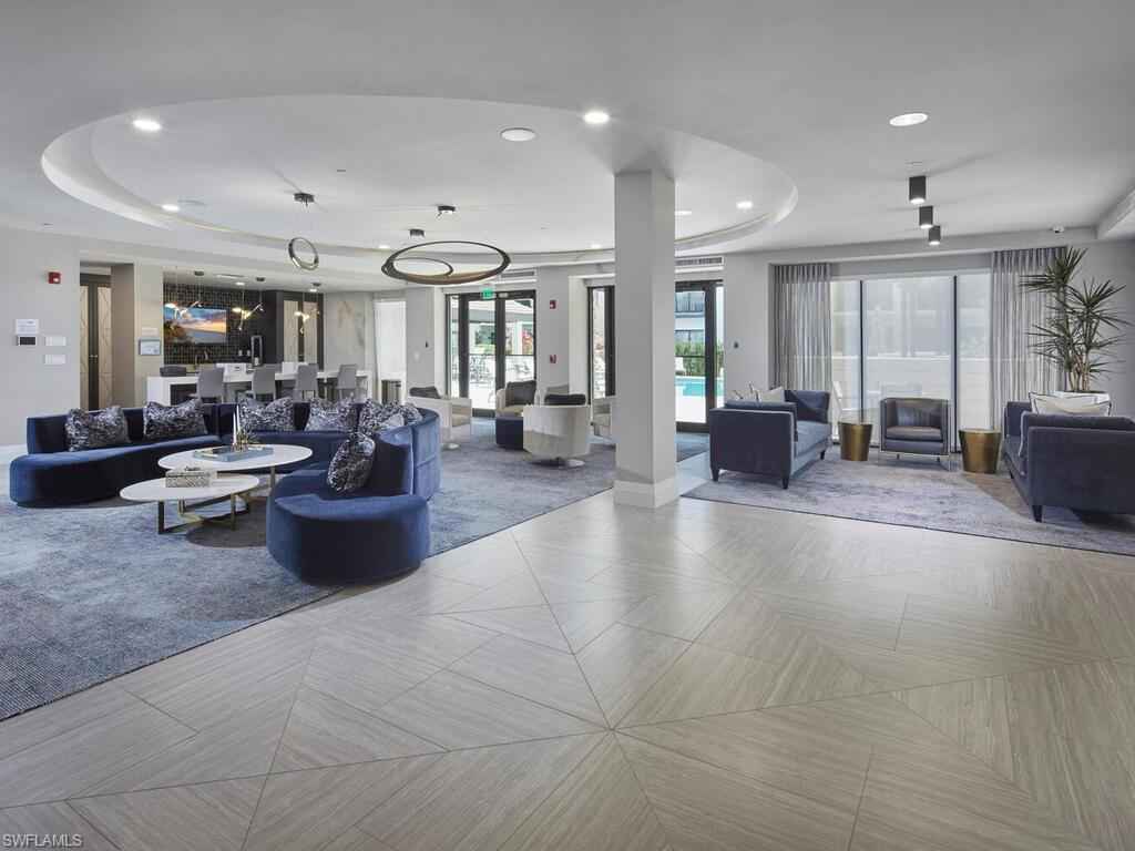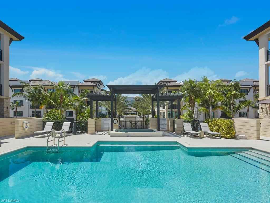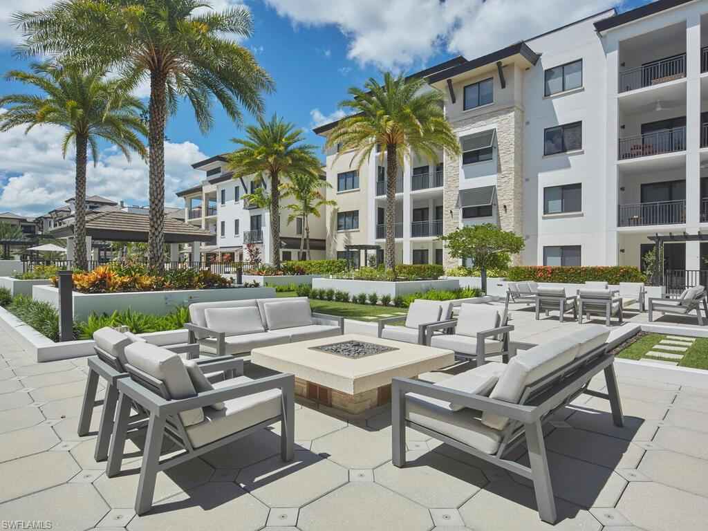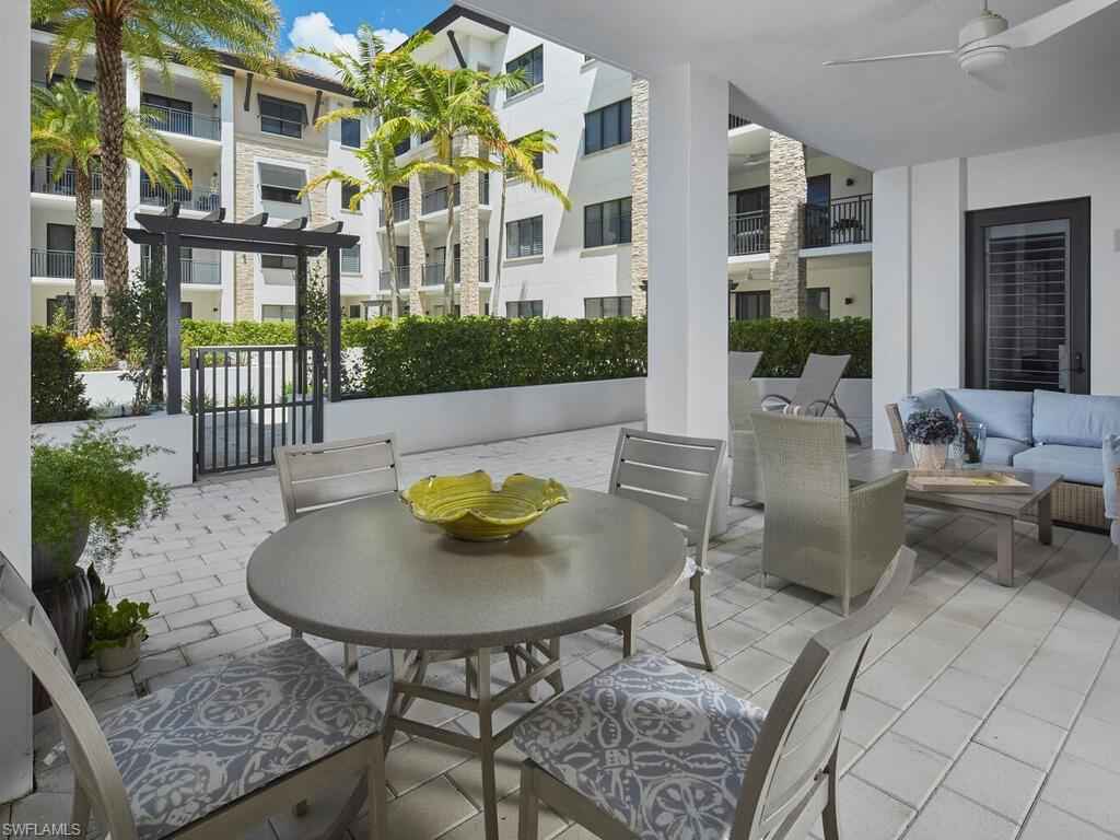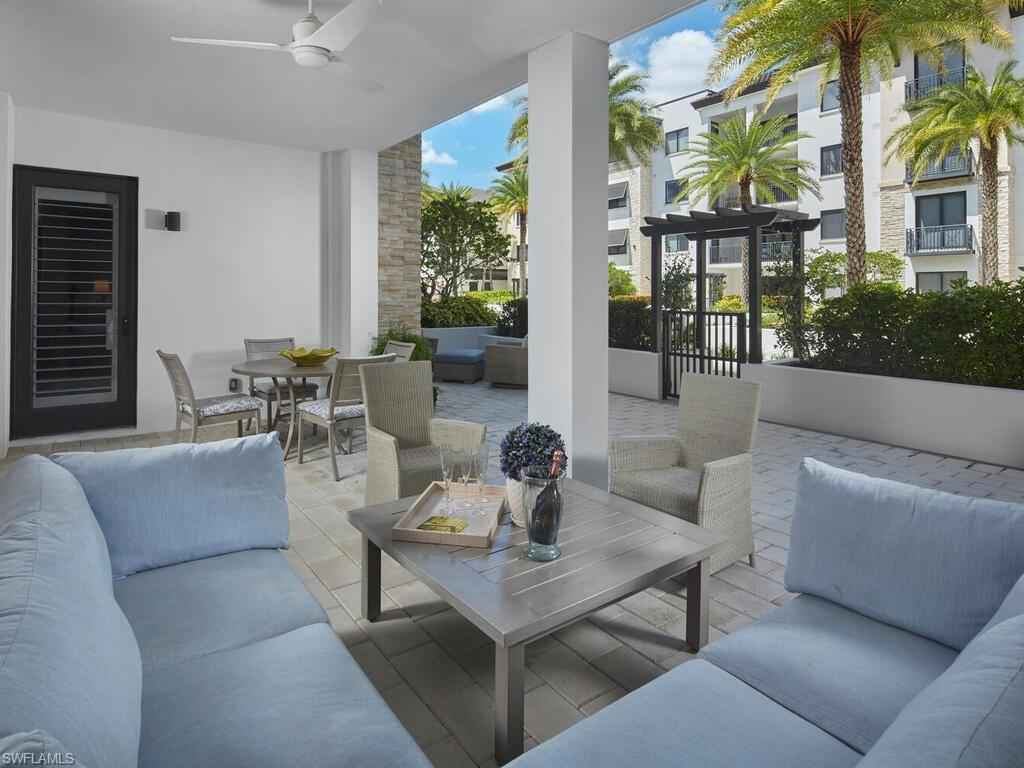 Gracious interior with an expansive patio. Located in one of the most desirable units within Naples Square III, this sought-after Chatham floor plan showcases an exceptional pool-deckx2013;level terrace overlooking the beautifully landscaped courtyardx2014;ideal for effortless indoor-outdoor living. Offered fully furnished and west-facing, the residence is highlighted by a full NanaWall of sliding glass doors, filling the home with natural light and creating a seamless connection to the expansive terrace. The thoughtfully designed center-island kitchen features premium Bosch appliances, sleek custom cabinetry, generous storage, and curated designer finishes that complement the unit's modern coastal architecture. A flexible den with a barn door and Murphy bed functions comfortably as a third bedroom when needed, while the split-bedroom layout ensures privacy. The spacious primary suite includes dual closets and a refined bath with double vanities, a glass-enclosed shower, and a soaking tub. A well-appointed ensuite guest bedroom and a large laundry room with abundant cabinetry further enhance everyday convenience. Naples Square residents enjoy an impressive collection of resort-style amenities, including a sun-splashed pool and spa, inviting fire pit lounges, a covered outdoor grilling pavilion, an elegant club room with billiards, and a state-of-the-art fitness center. All just steps from the shops and restaurants of 5th Avenue S, the beach, and the farmers market and dining along 3rd Street S, this residence delivers refined luxury and walkable downtown living at its best.