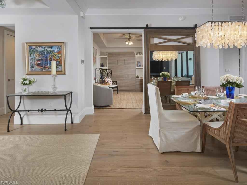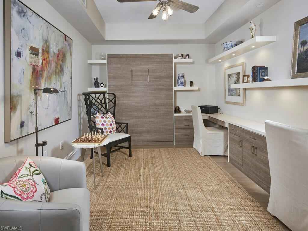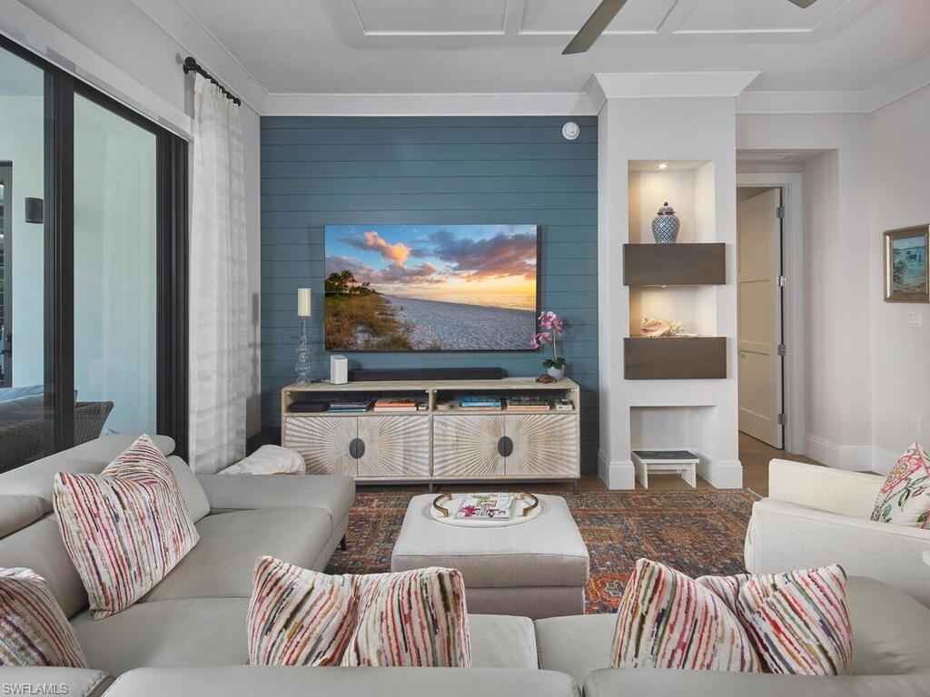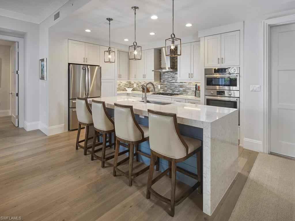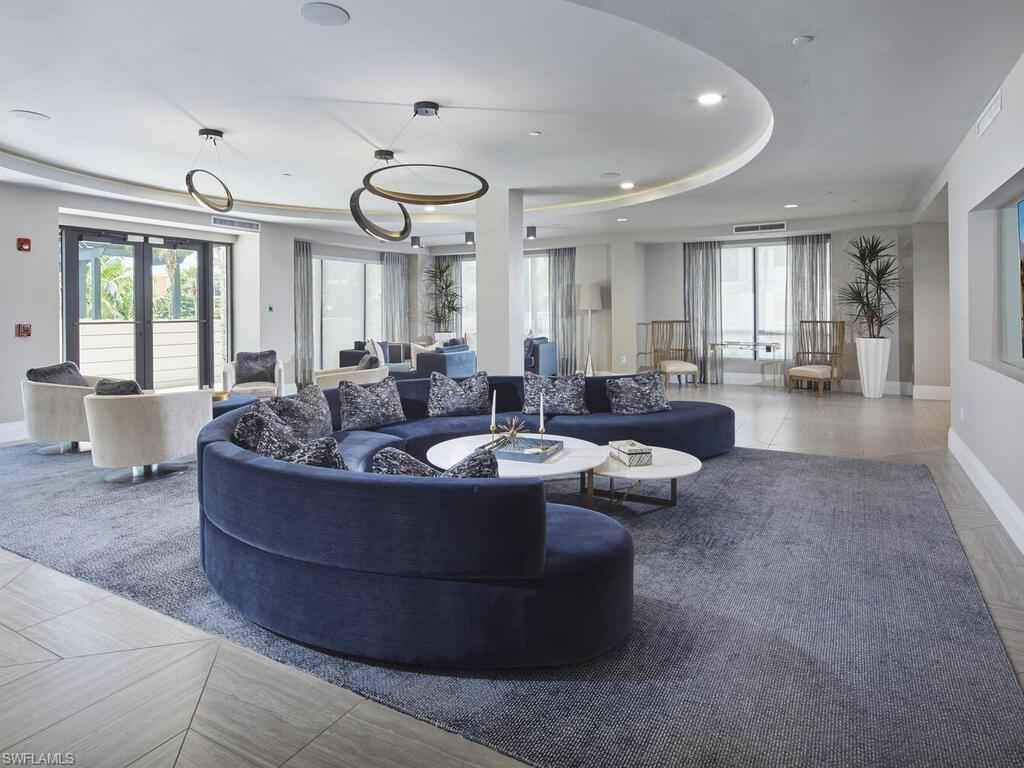 Gracious interior with an expansive patio. Located in one of the most desirable units within Naples Square III, this sought-after Chatham floor plan showcases an exceptional pool-deckx2013;level terrace overlooking the beautifully landscaped courtyardx2014;ideal for effortless indoor-outdoor living. Offered fully furnished and west-facing, the residence is highlighted by a full NanaWall of sliding glass doors, filling the home with natural light and creating a seamless connection to the expansive terrace. The thoughtfully designed center-island kitchen features premium Bosch appliances, sleek custom cabinetry, generous storage, and curated designer finishes that complement the unit's modern coastal architecture. A flexible den with a barn door and Murphy bed functions comfortably as a third bedroom when needed, while the split-bedroom layout ensures privacy. The spacious primary suite includes dual closets and a refined bath with double vanities, a glass-enclosed shower, and a soaking tub. A well-appointed ensuite guest bedroom and a large laundry room with abundant cabinetry further enhance everyday convenience. Naples Square residents enjoy an impressive collection of resort-style amenities, including a sun-splashed pool and spa, inviting fire pit lounges, a covered outdoor grilling pavilion, an elegant club room with billiards, and a state-of-the-art fitness center. All just steps from the shops and restaurants of 5th Avenue S, the beach, and the farmers market and dining along 3rd Street S, this residence delivers refined luxury and walkable downtown living at its best.