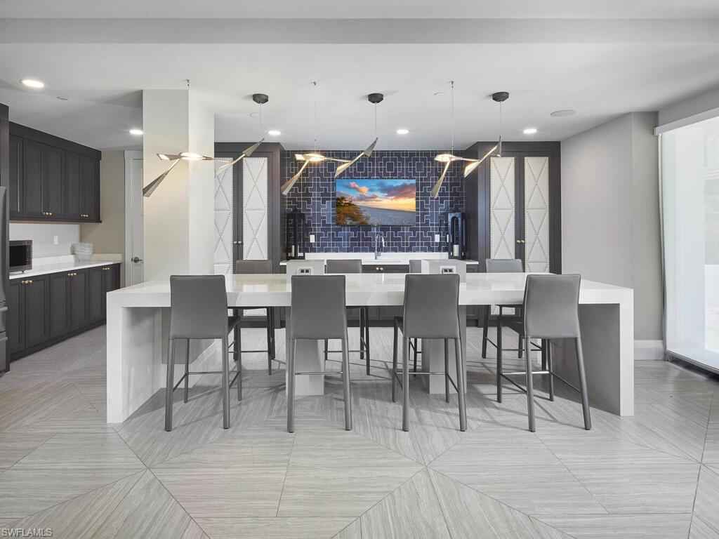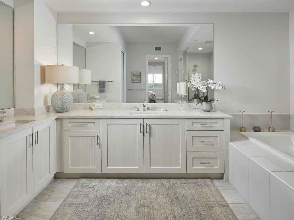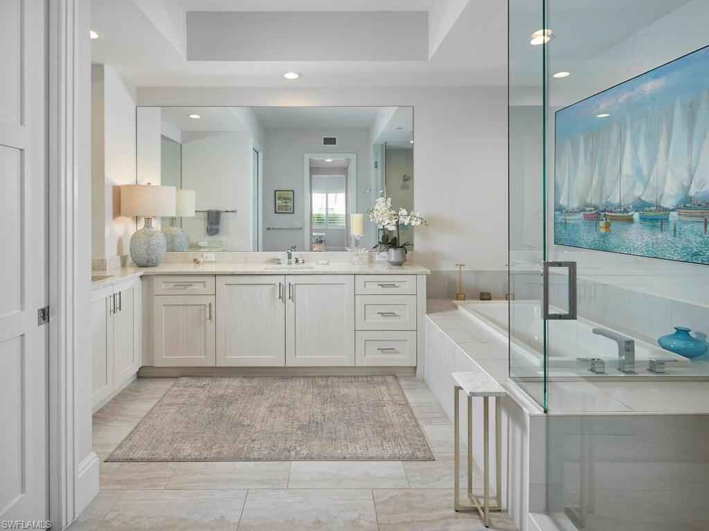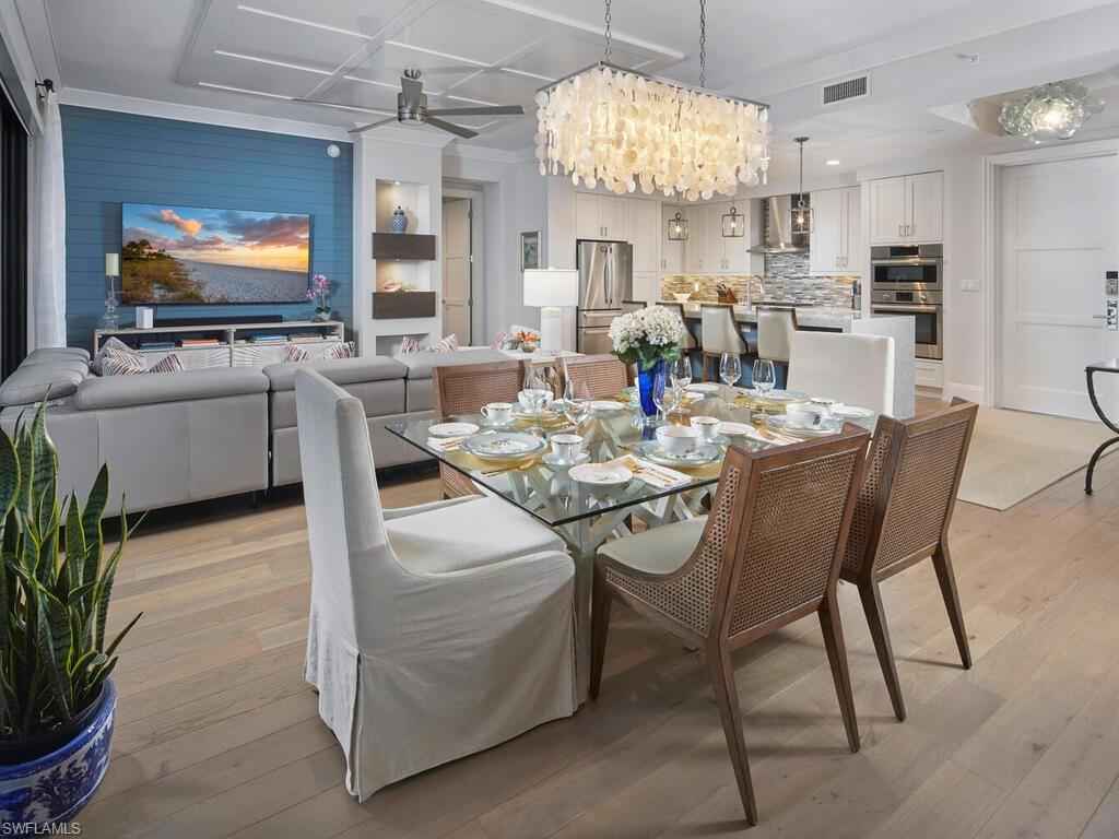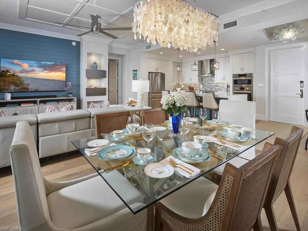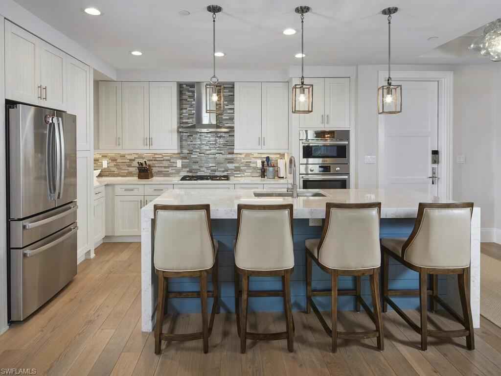 Gracious interior with an expansive patio. Located in one of the most desirable units within Naples Square III, this sought-after Chatham floor plan showcases an exceptional pool-deckx2013;level terrace overlooking the beautifully landscaped courtyardx2014;ideal for effortless indoor-outdoor living. Offered fully furnished and west-facing, the residence is highlighted by a full NanaWall of sliding glass doors, filling the home with natural light and creating a seamless connection to the expansive terrace. The thoughtfully designed center-island kitchen features premium Bosch appliances, sleek custom cabinetry, generous storage, and curated designer finishes that complement the unit's modern coastal architecture. A flexible den with a barn door and Murphy bed functions comfortably as a third bedroom when needed, while the split-bedroom layout ensures privacy. The spacious primary suite includes dual closets and a refined bath with double vanities, a glass-enclosed shower, and a soaking tub. A well-appointed ensuite guest bedroom and a large laundry room with abundant cabinetry further enhance everyday convenience. Naples Square residents enjoy an impressive collection of resort-style amenities, including a sun-splashed pool and spa, inviting fire pit lounges, a covered outdoor grilling pavilion, an elegant club room with billiards, and a state-of-the-art fitness center. All just steps from the shops and restaurants of 5th Avenue S, the beach, and the farmers market and dining along 3rd Street S, this residence delivers refined luxury and walkable downtown living at its best.
