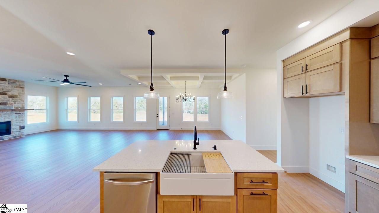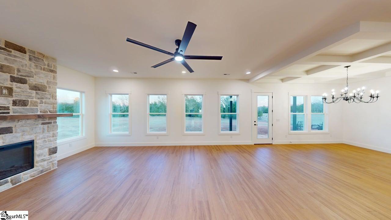 Modern Luxury on 2 Acres! This stunning new build offers over 2,260 sq. ft. all on one level, designed with comfort, light, and elegance in mind. Enjoy 10-foot ceilings, 8-foot doors, and floor-to-ceiling windows that fill the home with natural light. The oversized great room features a coffered ceiling and fireplace, opening to a beautiful kitchen with a custom coffee bar perfect for entertaining or your morning routine. The owners suite is a true retreat, featuring a spa-inspired bathroom with a large all-glass walk-in shower, soaking tub, and a custom wood-shelved walk-in closet. The secondary bedrooms are spacious, and the home office boasts large windows for a bright, inspiring workspace. Step outside to the large covered back porch a perfect spot to relax, watch the wildlife, and enjoy the peaceful surroundings of your 2-acre property. No HOAs! This home blends modern farmhouse style with luxury living in a serene, private setting.
