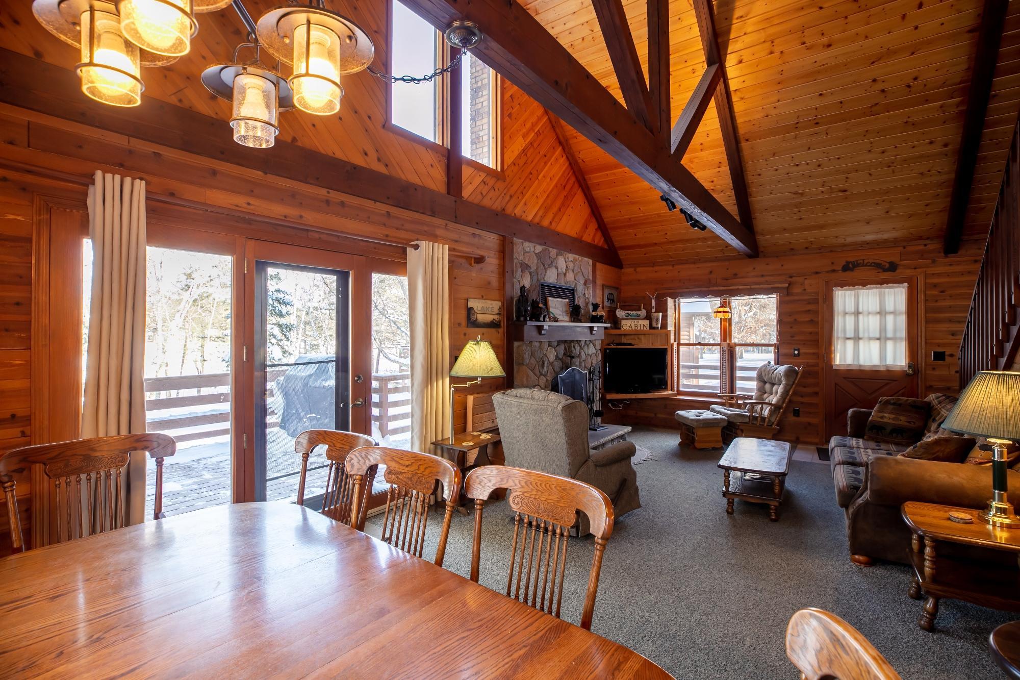 Experience Cabin 65 at Boyd Lodge, featuring exceptional facilities and well-maintained grounds. This lakeshore property offers five bedrooms, three bathrooms, and a wood-burning stone fireplace. The cabins knotty pine vaulted ceiling and timber frames create a classic Up-North atmosphere. The fully equipped kitchen includes a microwave and dishwasher, and the deck features a Weber gas grill perfect for family meals shared against the backdrop of serene lakeside views. Additional sleeping space is available in the loft and finished lower level, which also includes a family room. The home is fully furnished and accommodates up to 11 guests, with furniture, bedding, modern electronics, and wireless internet provided. An owner has 42 days of private use per year. Enjoy the convenience of on-site amenities, including a seasonal laundry facility that saves you trips into town and a fish-cleaning room that makes it easy to prepare your day's catch right at home. The resort offers dock space, a private boat landing, and access to a poolside community building with a hot tub and outdoor pool, perfect for unwinding after a day of adventure. Residents also enjoy a private boat launch, docking on Rush Lake, and a community beach on Whitefish Lake, with full access to the Whitefish Chain. The property is minutes from Crosslakes restaurants, boutique shops, and golf courses, offering the perfect blend of tranquility and accessibility. Imagine summer evenings here; ready to schedule a tour.