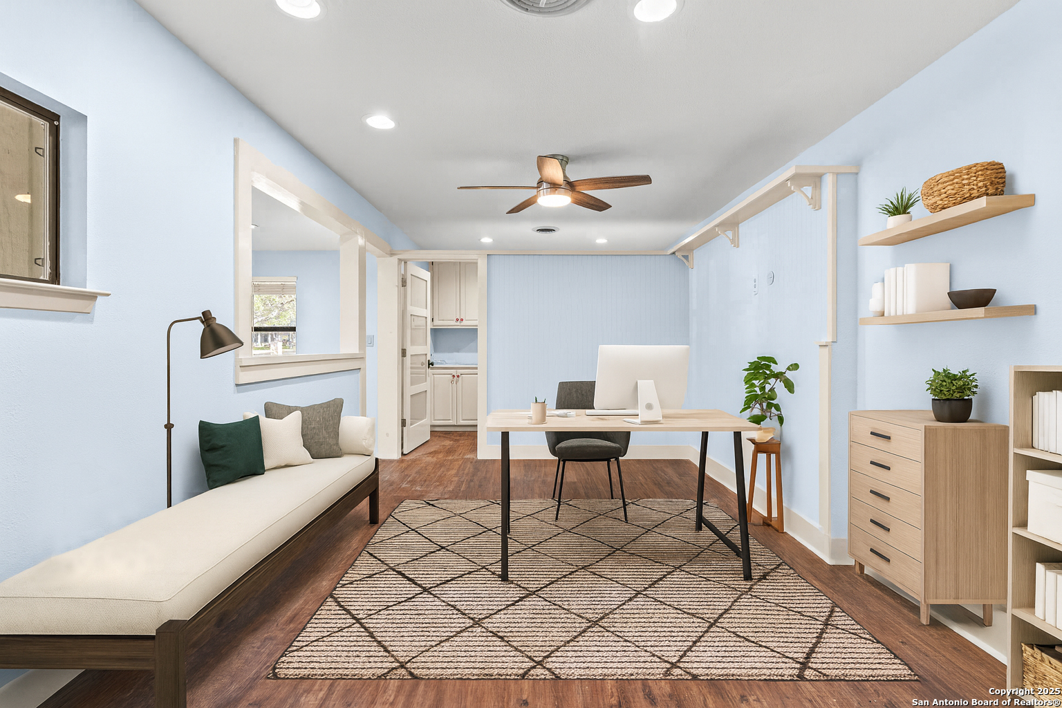 Looking for a home with space for your home office, playroom, yoga studio, workout room, or creative retreat for your hobbies? This approximately 3,400-SF home offers abundant flexibility to enhance every stage of life, as well as an assumable low-rate VA loan. Along with multiple versatile areas, you ll find exceptional storage for crafts, tools, and more, keeping everything organized and within easy reach. The heart of the home is a spacious open-plan living area anchored by the wood-burning fireplace, seamlessly connected to the island kitchen. Here, acres of quartz counters, custom cabinetry, stainless-steel appliances, and under-mount lighting make cooking, entertaining, and everyday living a joy. The dining area, walk-in pantry, utility room, and bright sunroom/family room flow easily from the kitchen, creating a functional and inviting layout. The private bedroom wing includes a serene primary bedroom with en-suite bath, along with comfortable guest bedrooms, all featuring brand-new, plush carpeting. Tucked away from the main living areas, the bedrooms provide peace and quiet when it s time to unwind. Step outside to the fenced back yard shaded by oak trees and with plenty of open space for kids and pets to play. Park your RV on the pad behind the gate and store your gear in the mudroom. The office and workshop have easy-clean formica walls, sinks, and storage cabinets. This home combines generous square footage, thoughtful design, and a warm, welcoming atmosphere, ready to complement your lifestyle. Hollywood Park has its own police and fire departments, and a voluntary homeowners association. There is a clubhouse, a shaded pavilion with outdoor grills, three swimming pools, a splash pad, a playground, two tennis courts, a regulation basketball court, and a volleyball court. Residents also enjoy year-round community events that make it easy to connect with neighbors and kids, such as visits from Santa and Mrs. Claus, safe Halloween outdoor trails, parades, and Easter egg hunts.