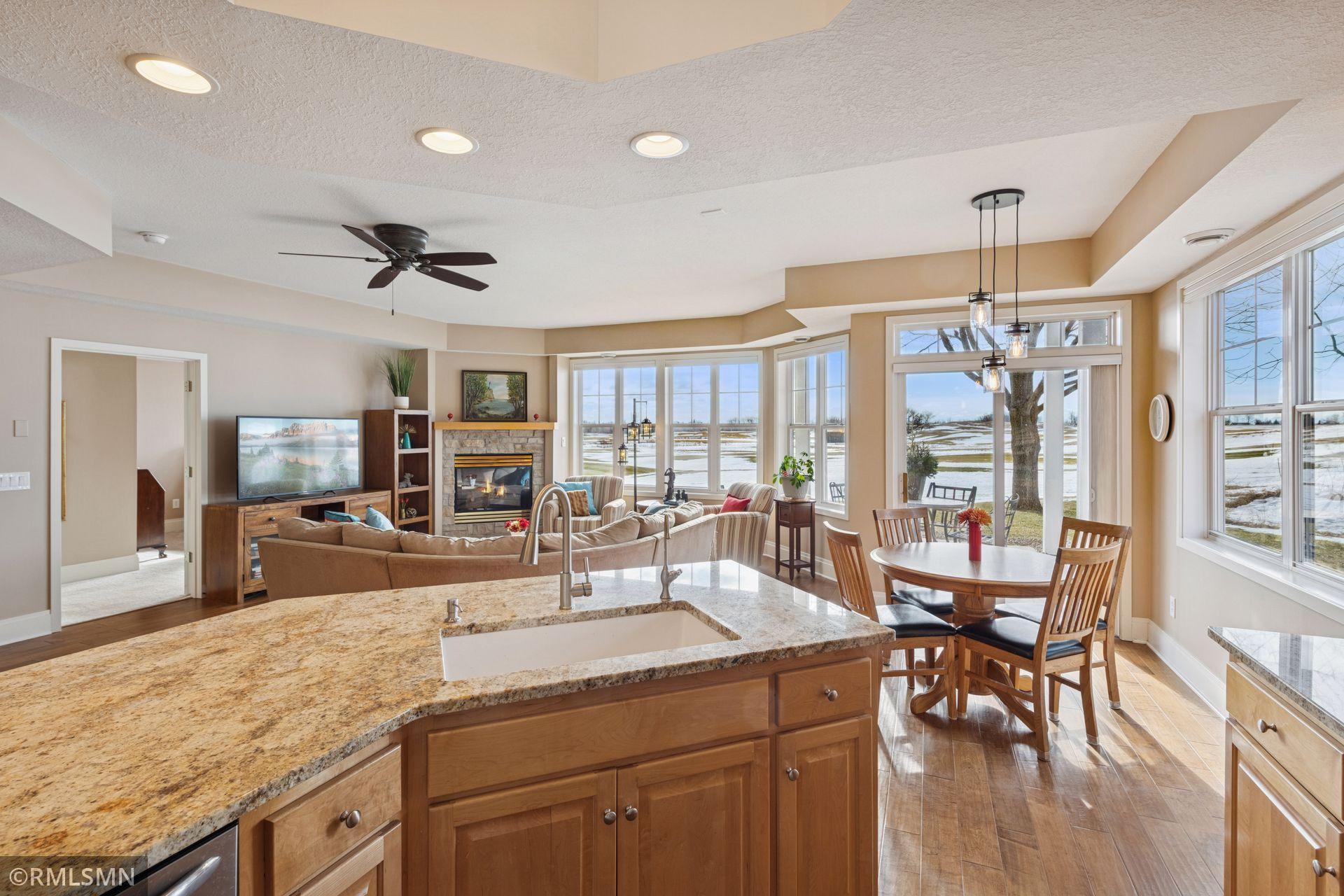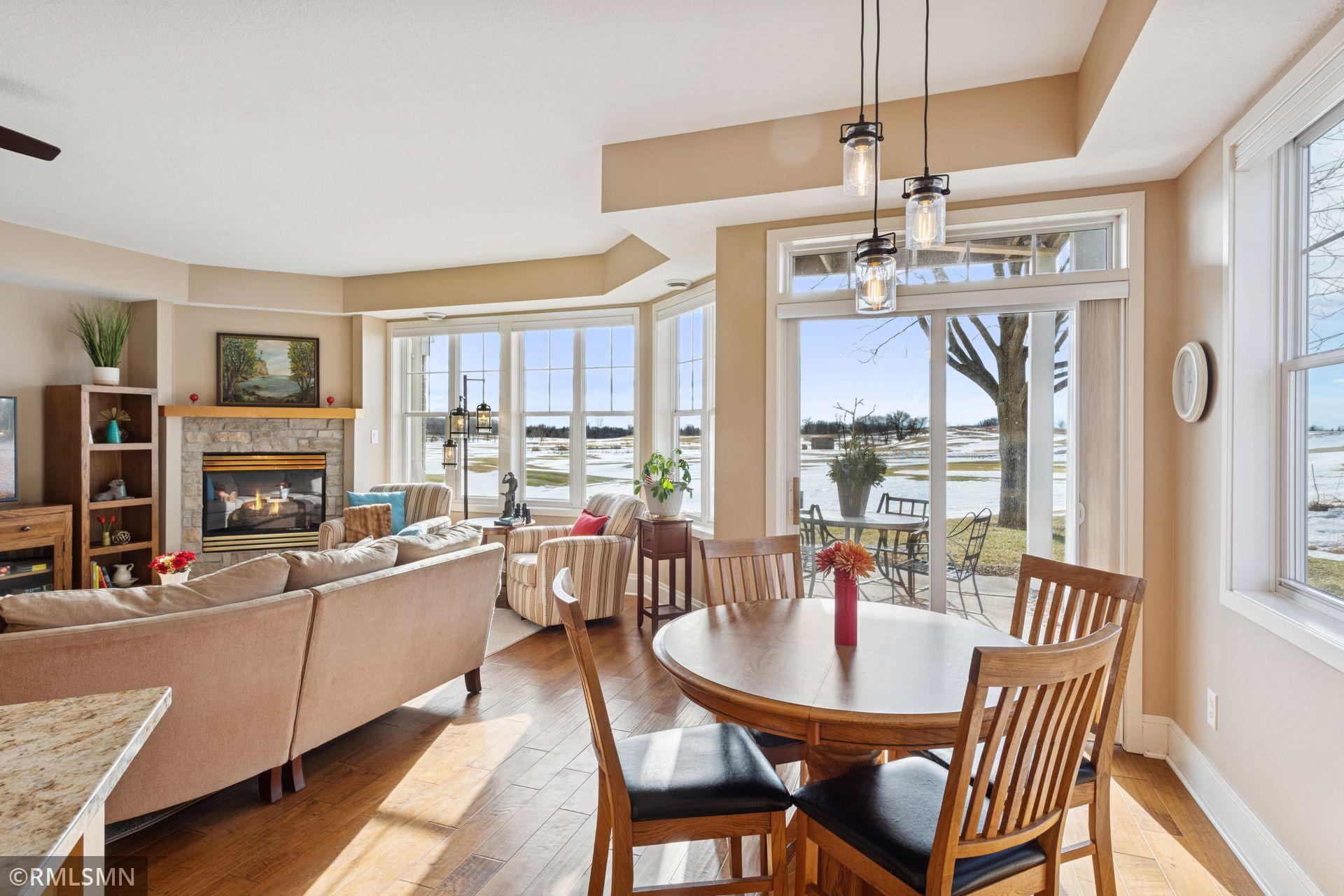 Step into effortless, main-level living in this end-unit townhome overlooking the golf course. With no interior or exterior stairs, this home offers unmatched comfort and accessibility from the moment you arrive. Sunlight pours across rich hardwood floors, guiding you through a thoughtfully designed layout featuring three spacious bedrooms and two baths, including a private primary suite with its own 3/4 bath.The kitchen blends style and function with granite countertops, newer appliances, and updated light fixtures that add a fresh, modern touch. Enjoy cozy evenings by the stunning stone gas fireplace, or take in peaceful views of the fairway right from your living space.Major updates provide peace of mind, including a new A/C and water heater installed in 2020. And the best part say goodbye to shoveling snow and mowing lawns. Exterior maintenance is handled for you, giving you more time to relax and enjoy the lifestyle this community offers.A rare combination of convenience, comfort, and location, this one-level gem is ready to welcome you home.
