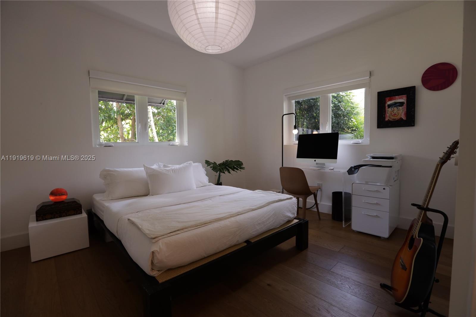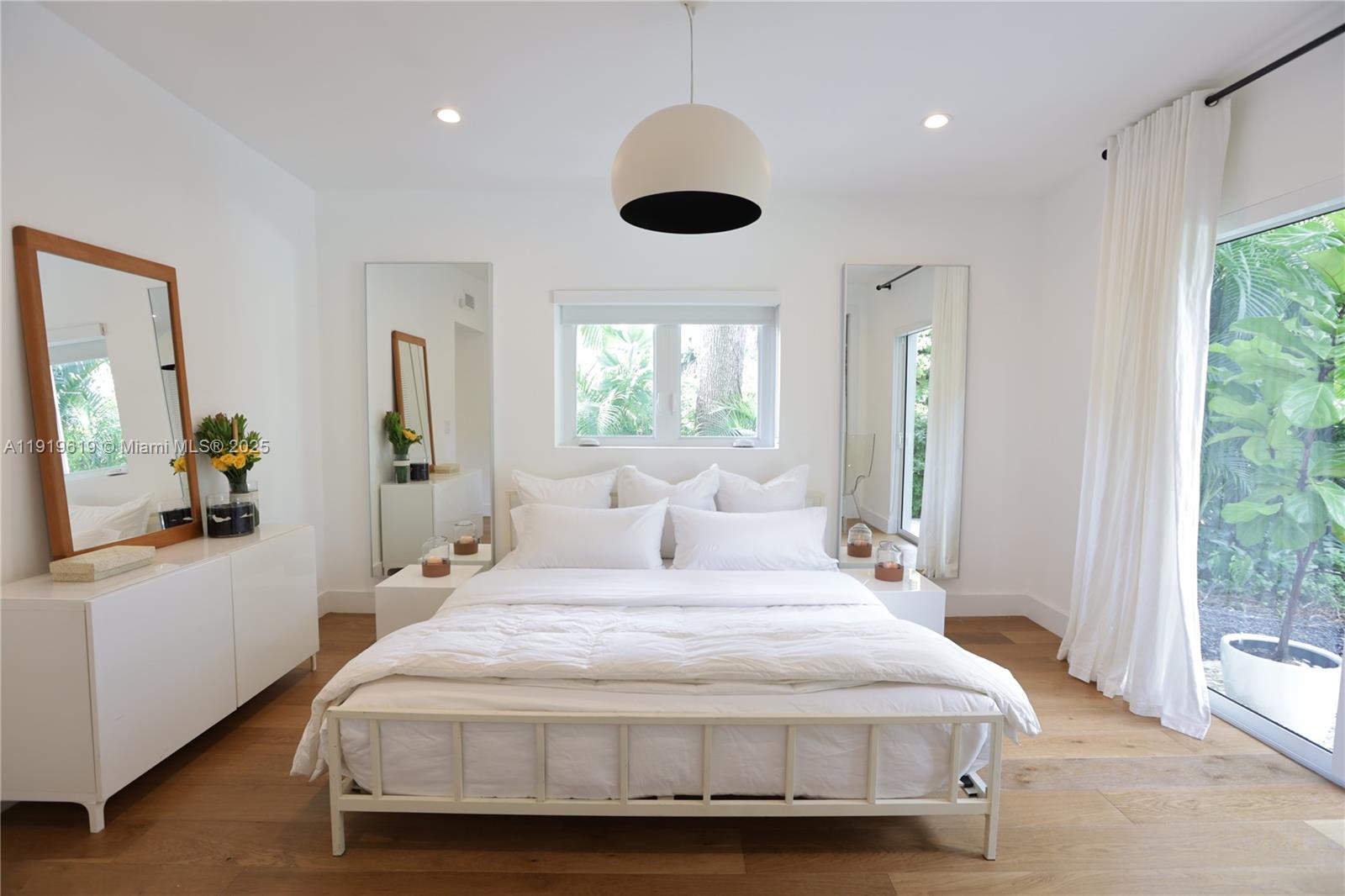Exquisitely fully furnished modern living space with high ceilings and open airy spaces. White throughout, including large cool terrazzo tiles in the living area and wide-planked Siberian white wood in the bedrooms. High impact windows and doors and custom closets. Immaculately maintained high-end kitchen including marble counters and top of the line appliances. Large lush private canopied/tropical backyard with mature trees and nearly 1/2 acre fenced property with saltwater heated pool.Outdoor shower and patio with awning for all year round entertaining. A tropical paradise! NO DOGS ALLOWED.