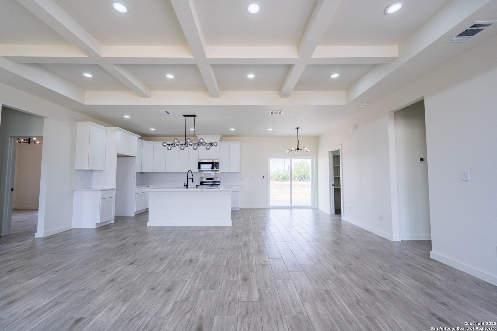 *** Offering 5k towards closing cost *** Nestled in the quiet charm of Natalia, Texas, discover 122 Ranchero Way - a stunning brand-new contemporary residence set upon a sweeping one-acre canvas. With its sophisticated stucco facade, striking stone entrance, and bold black trim, this home commands attention before you even step inside. Thoughtful landscaping frames the front, while a distinguished stone address plaque and elegant French doors with obscured glass set the tone for the refined spaces that await within. Inside, you re immediately greeted by an 11-foot coffered ceiling that spans the living area, accented with recessed lighting and large windows that flood the space with natural light. The open layout seamlessly connects the living, dining, and kitchen areas, creating a flow that feels both modern and inviting. The kitchen is a showstopper with its all-white cabinetry, glossy subway tile backsplash, and white marbled quartz countertops. A center island with barstool seating provides the perfect gathering spot, while a metallic glass globe chandelier mirrors the elegance of the dining light fixture. Stainless steel appliances and a walk-in pantry with built-in shelving complete the space. The primary suite is privately tucked away from the other bedrooms, featuring a stylish frosted-globe chandelier, six-panel closet doors, and plenty of room to unwind. The en suite bath is designed with spa-like detail - a soaking tub, single vanity with quartz countertop, pendant lighting, and a full-height marble tile backsplash with a built-in niche. The additional bedrooms each feature industrial pendant lights, natural light, and spacious closets with six-panel double doors. They share a full bathroom with a double vanity, quartz counters, a sleek modern black light fixture, and a shower-tub combo with marble tile to the ceiling. Throughout the home, luxury vinyl plank flooring in a gray wood-grain finish ties everything together with both durability and style. Step outside, and you ll find a covered patio with a remote controlled ceiling fan overlooking the full acre of open land - a blank canvas ready to be personalized. And then, there s the garage - a massive oversized 22 by 31-foot space, extra deep and ready to accommodate vehicles, storage, or even a workshop. This is a home that blends modern design with comfort, functionality, and room to grow - a truly remarkable new build here in Natalia.