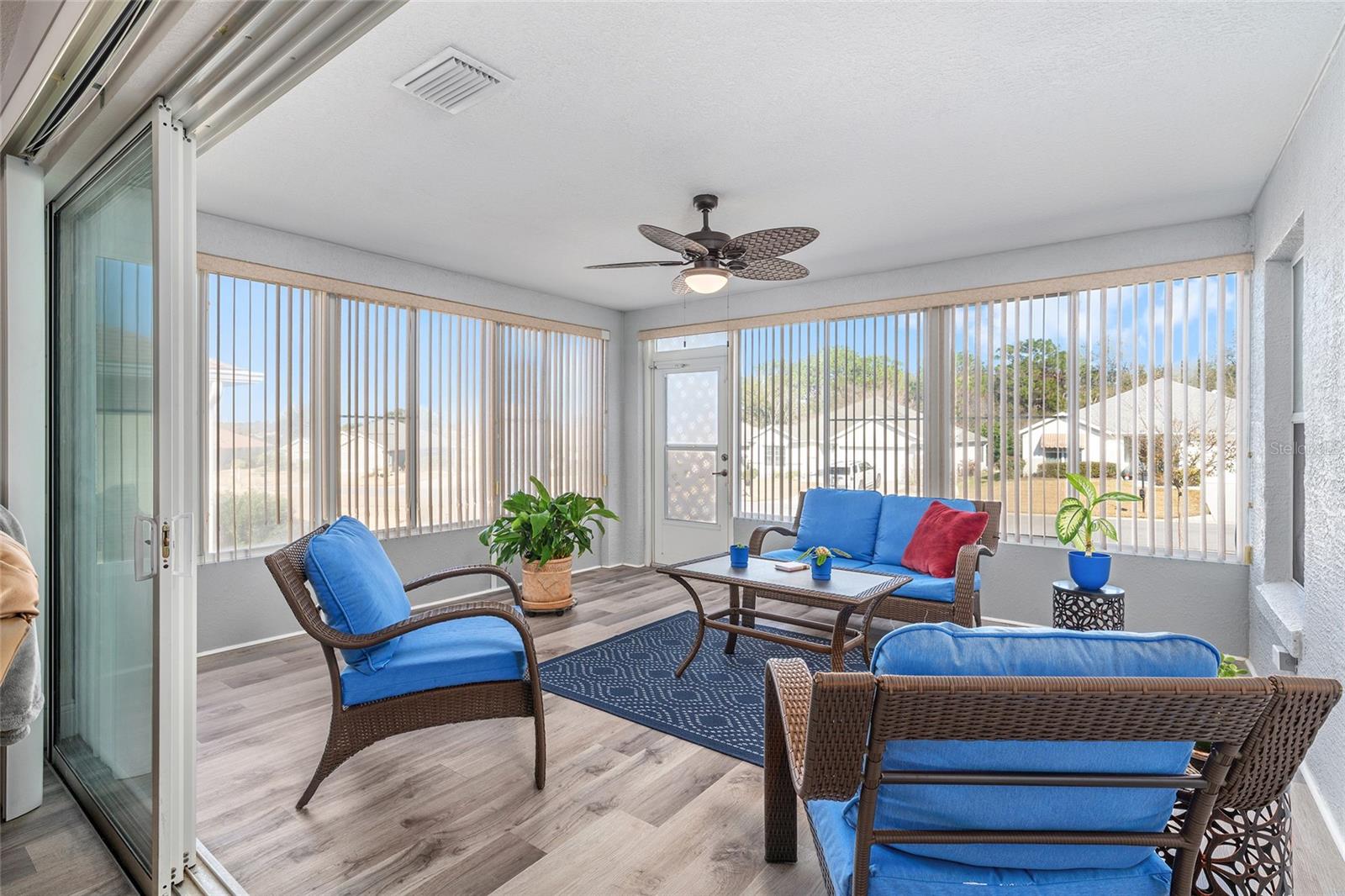 Located in the Hampton Hills community, this adorable rental block home sits upon a Florida style hill and provides everything you need for life here. Entering the living room you find an open concept with an enclosed patio off the rear, which adds to the useable square footage. The kitchen features an eat in breakfast area with plenty of cabinets and counterspace. Wrapping around you will find the bedrooms, second bathroom, and indoor laundry room. The master bathroom includes his and her sinks and a large walk-in closet. While the two-car garage will certainly serve the purpose that the name entails, you will find life is better with a golf cart in space two. Positioned throughout the community are tennis and pickleball courts, 3 pools, one of which is heated and indoors, softball fields, a full bar and restaurant, and four unique 9-hole golf courses. Dont let the fear of not being able to bring your RV or boat along with you, inhibit you from living the life you imagined here. Located behind the gates of the already gated community you can store your toy. Stop dreaming about what life would be like here and come see for yourself today. Available March 15th Furnished or Unfurnished