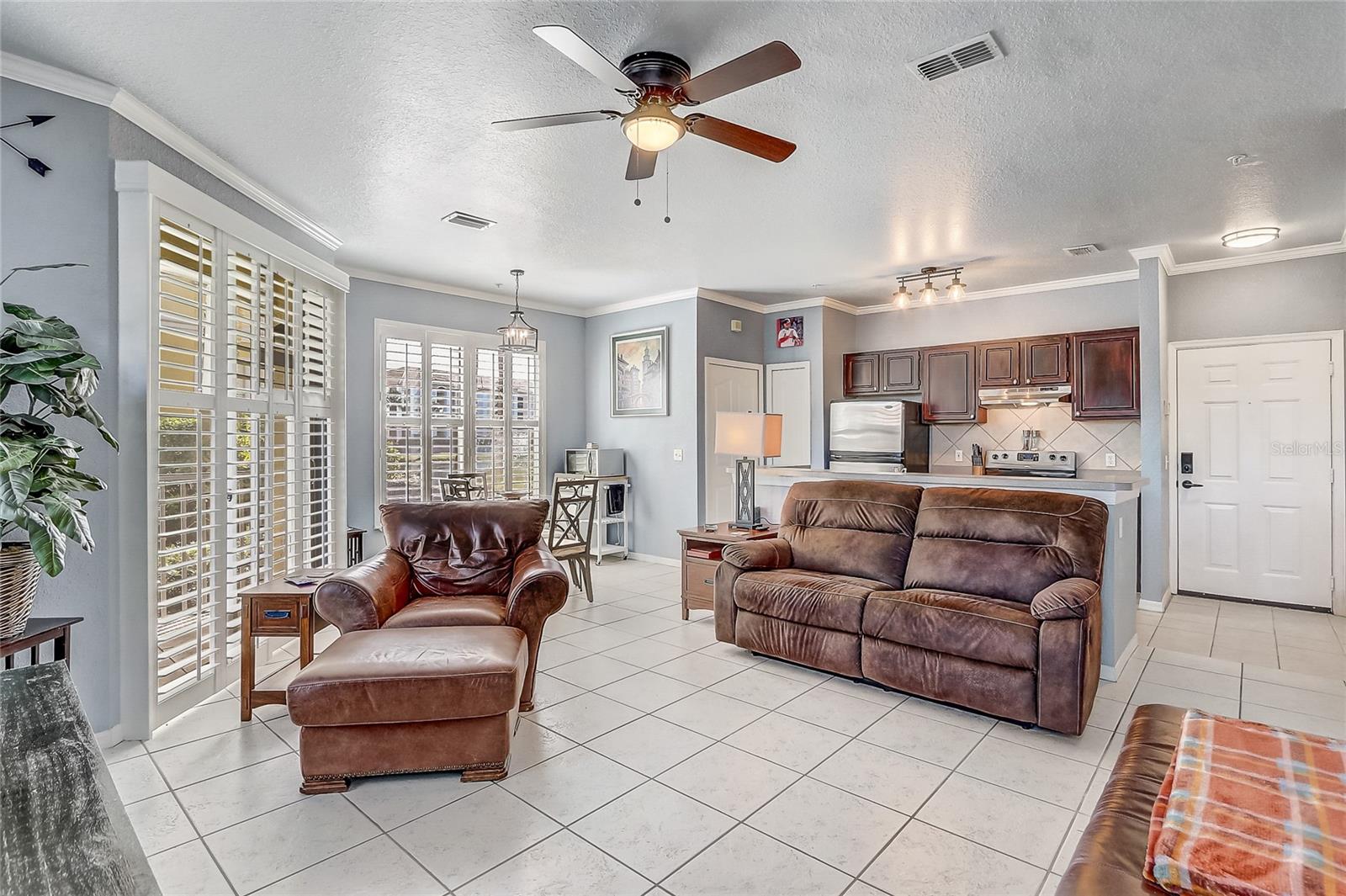 Immediately available! This refreshed 1-bedroom, 1-bath ground-floor condominium with a deeded 1-car garage is the one youve been waiting for in the desirable gated community of Visconti West. Tucked away in the back of the community, this home offers a peaceful retreat with a private patio and tranquil surroundings. Step inside to a bright, airy interior featuring all-tile flooring and an open floor plan perfect for both relaxing and entertaining. The modern kitchen boasts stainless steel appliances and a breakfast bar, ideal for morning coffee or casual meals with friends. Just off the kitchen, youll find a convenient laundry closet with a full-size washer and dryer. Special note the windows feature plantation shutters to add to the modern feel. The spacious living room flows seamlessly into the open kitchen and the screened-in balcony, where you can unwind outdoors while enjoying the privacy of your quiet setting. A storage closet on the balcony provides extra space for seasonal items or outdoor gear. In addition to your deeded garage, ample open parking is available for guests.At Visconti West, youll enjoy resort-style amenities including a sparkling pool, fitness center, clubhouse, playground, and sports courts. Water service and valet trash are included in your HOA, allowing for low-maintenance living. All this luxury for a low reasonable monthly condo association fee. Ideally located near I-4 and SR-414, youre minutes from Downtown Maitland, Winter Park Village, Cranes Roost Park, and the shops and dining of Uptown Altamonte. With Downtown Orlando only 15 minutes away, youll enjoy the best of both worldspeaceful living in a vibrant, convenient location. This is a must see to appreciate.