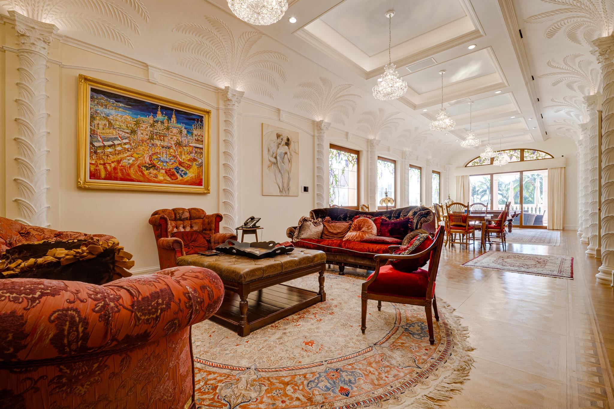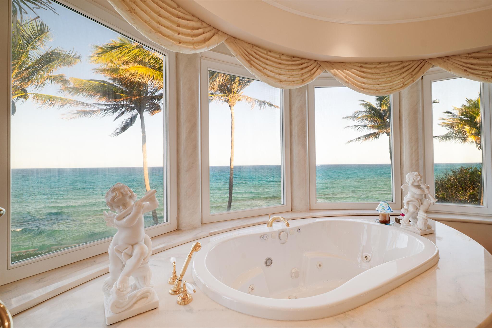 Commanding 151+/- feet of direct ocean frontage, Villa Rebecca is a rare ocean-to-Intracoastal estate that epitomizes timeless European elegance. Set on 1.33+/- acres of manicured grounds in the enclave of Manalapan, this Italian-inspired residence was designed by renowned architect Shane Ames.Spanning more than 30,000 total square feet, with nearly 16,000 square feet of living space, the gated compound offers 9 bedrooms, 13 full and 4 half baths, and a separate 2-bedroom guest house.A dramatic three-story foyer with a sweeping marble staircase and a 35-foot chandelier sets a regal tone, leading to grand living and dining rooms accented by Venetian plaster ceilings, intricate millwork, and imported hand-carved marble floors. The chef's kitchen features double Sub-Zeros, a Wolf gas