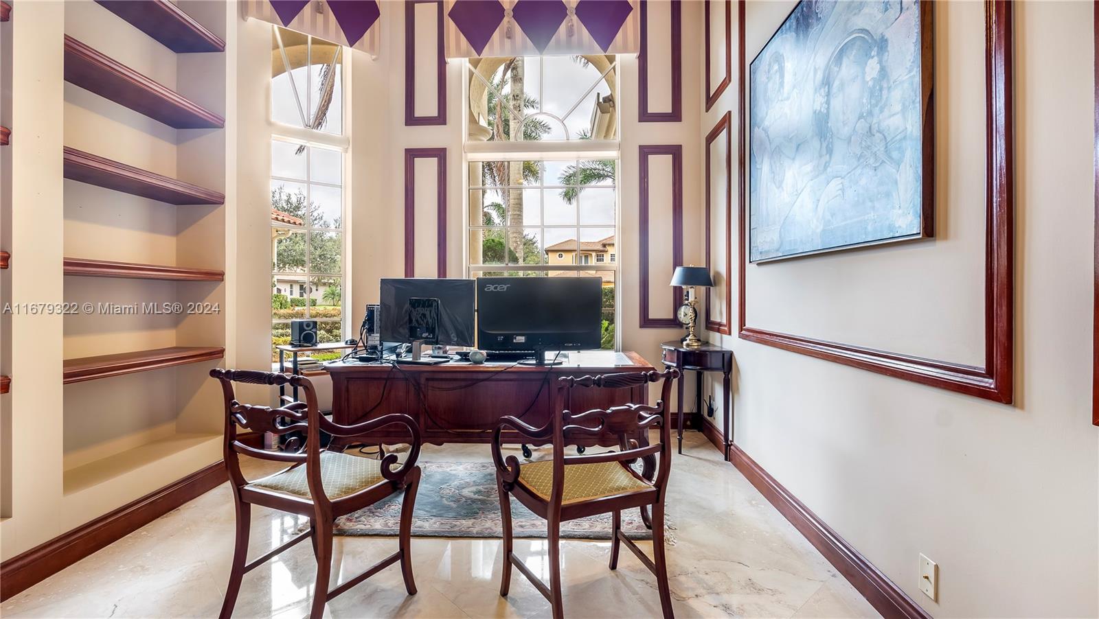 Welcome to this exquisite custom-built home on a builders acre in the prestigious gated community of Stonebrook Estates. This luxurious residence features a grand foyer leading into formal living and dining areas, and a gourmet kitchen with a wet bar. Enjoy coffered ceilings, expansive picture windows, and custom doors that flood the space with natural light. The split floor plan offers a lavish primary ensuite with a sitting area, dual closets, and a spa bath. Spacious bedrooms with one serving as a home gym with cabana bath and separate entrance. Step outside to a private fenced backyard with a swimming pool, grotto waterfalls, a pool slide, caves, and tropical landscaping. Host gatherings in the covered outdoor summer kitchen and relax on the deck while enjoying views of lush greenery.