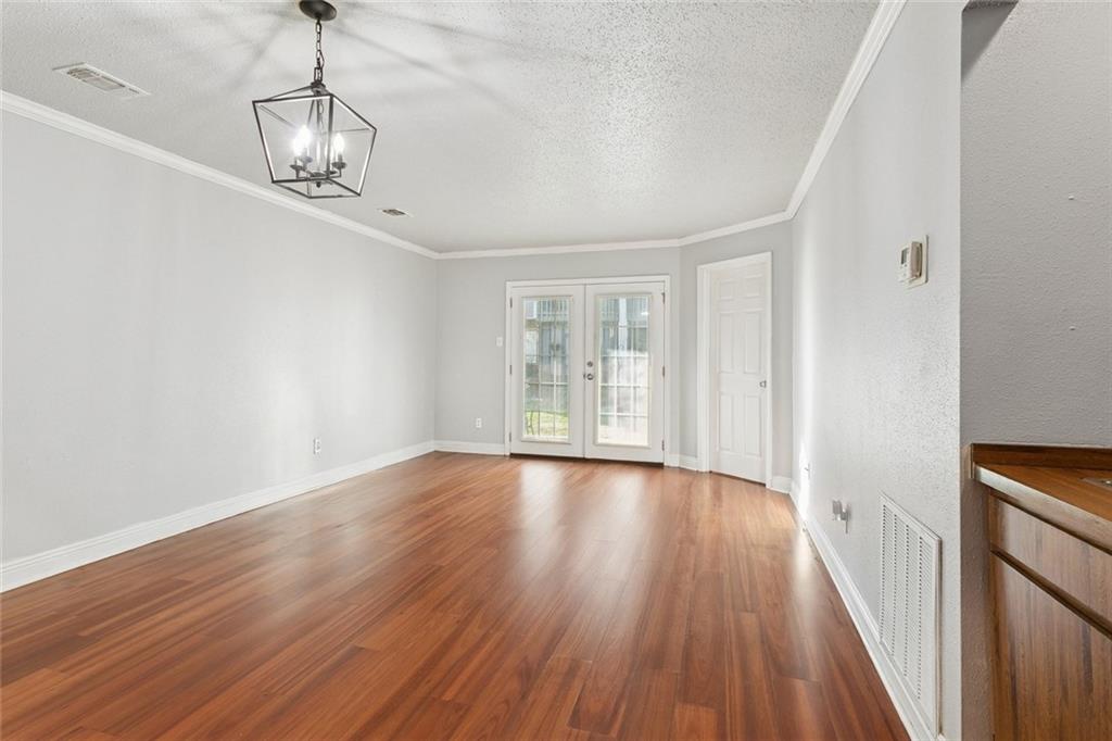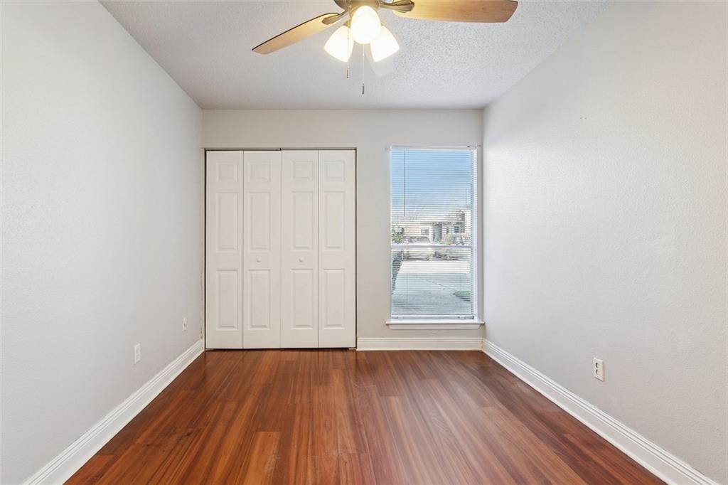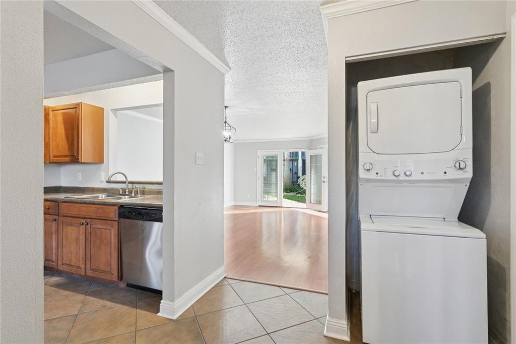 Very pretty ground floor 2-bedroom, 2-bath condo at Avant Garde Condominiums featuring beautiful wood floors in the living area and bedrooms, a wet bar, crown molding and French doors to a private covered patio. The primary bedroom has patio access, a walk-in closet, ceiling fan, and en-suite bathroom. The kitchen includes a breakfast area, a pantry, range/oven, refrigerator with icemaker, dishwasher and garbage disposal. Also included is a full-size stacked washer and dryer! The 2nd bdrm is a good size with ample closet space and adjacent is the 2nd full bath with combo tub/shower. The condo fee includes water, exterior and flood insurance, termite contract, and much more! Amenities include two pools, tennis court, hot tub, and a community party room. In walking distance to restaurants, a library, coffee shops, an elementary school and more!