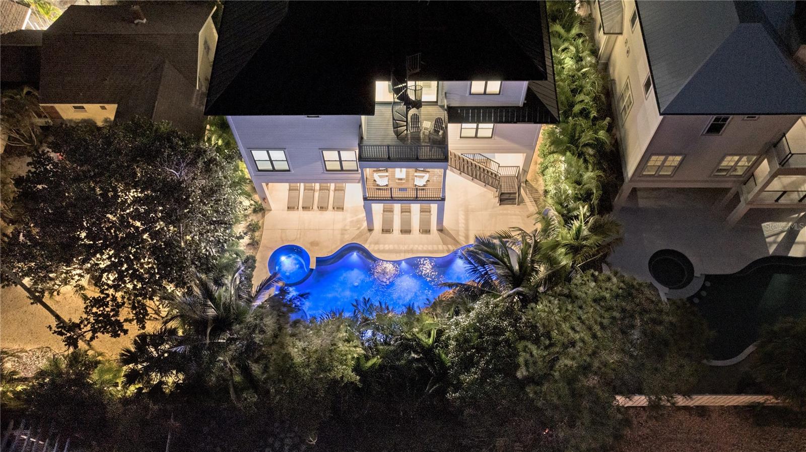 Impressive coastal luxury home featuring exquisite finishes throughout and only a block from the beach on the famous Lido Key, Sarasota. Boasting 10 bedrooms, and 12 bathrooms along with a 3 car garage, heated pool & spa this home is sure to please either a homeowner or a savvy investor looking to invest in an income producing vacation rental with a successful history. Turn key furnished and existing property management company in place already allows for a seamless transition. Awesome amenities include a waterslide, waterfall, an elevator and high end appliances. To complement the beautiful aquatic amenities, the sprawling patio features a high top bar with outdoor entertainment, a grilling area, a gaming area with a a ping pong table, and a dining area to perfect nightly entertainment on those Florida evenings. Sip your cocktails or coffee on one of the multiple private balconies or rooftop deck. This residence's prime location is just steps from the turquoise waters of Lido Beach, a 5 minute bike ride to the world famous St. Armands Circle, and a short drive to the historic downtown Sarasota. The main level features 5 guest suites, an oversized great room, and kitchen with a built-in oven, convection oven, refrigerator, and cooktop, leading to the dining room that connects to a covered balcony overlooking a tropical oasis backyard and pool/spa. Expansive 12'-14' ceilings and vast window treatments create a bright & spacious atmosphere. The third level features two master suites and three more guest suites, as well as a den featuring a stainless-steel wet bar. This home is the epitome of elegance, with intricate attention to detail on finishes and furnishings to ensure a luxurious experience.