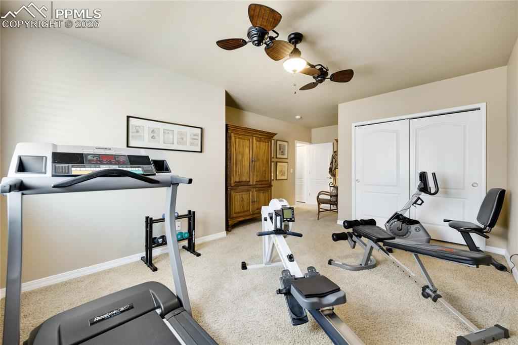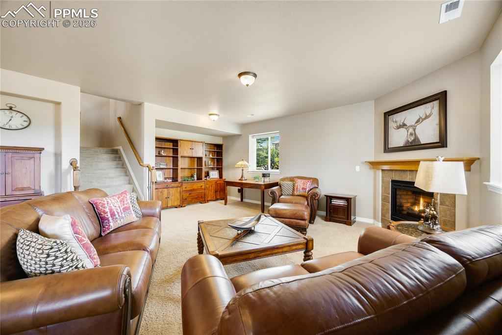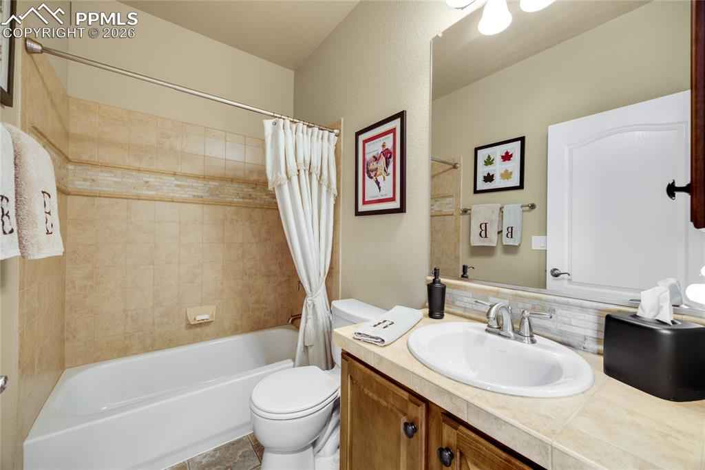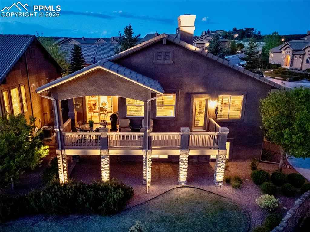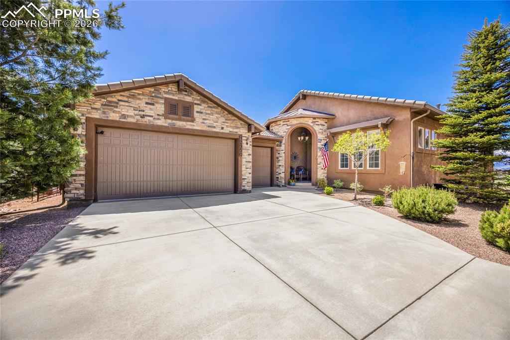 Experience luxury living in the prestigious Flying Horse Golf Community, where panoramic views of Pikes Peak and the Front Range create an extraordinary everyday backdrop. Situated on a prime corner lot, this meticulously maintained 4-bedroom, 3-bathroom home with a finished 3-car garage offers 3,616 total square feet of thoughtfully designed living space and low-maintenance convenience. The exterior features stucco and stone construction with a tile roof, delivering timeless curb appeal. Inside, beautiful wood flooring flows through the main living areas, complementing the homex2019;s refined design. The main-level primary suite offers private deck access, a custom walk-in closet, and dual vanities. The gourmet kitchen is ideal for entertaining and daily living, featuring granite countertops, stainless steel appliances, a large island with bar seating, and a spacious walk-in pantry. Step outside to the refurbished Trex deck (2023) where youx2019;ll enjoy breathtaking mountain views, a gas grill hookup, and a remote sunshade for comfortable outdoor living. The expansive lower level is perfect for gatherings with a gas fireplace and stone surround, plus a wet bar with dishwasher and wine rack. Two additional bedrooms, a full bathroom, and a large unfinished storage room offer flexibility for guests, hobbies, or future expansion. Recent updates include Trex deck replacement (2023), water heater (2023), radon mitigation (2021), and tile roof replacement (2015). Additional features include upgraded lighting, a no-slip coated front porch and floor in the finished garage. The HOA maintains landscaping, snow removal, trash, and recycling, allowing easy living. Residents enjoy Flying Horse amenities including the Tom Weiskopf championship golf course, athletic club, pools, tennis, dining, parks, trails, and Academy District 20 schools. One of the few homes remaining with views toward the future Colorado Springs Temple & Gardens of The Church of Jesus Christ of Latter-day Saints!