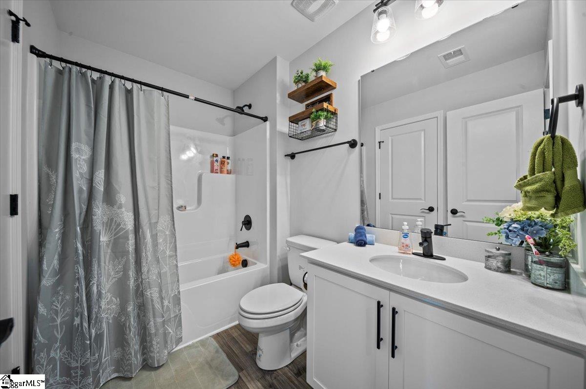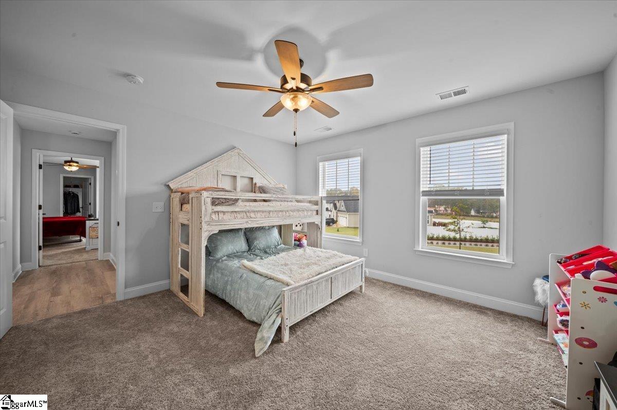 Nestled in the tranquil Alder Pond community of Campobello, South Carolina, this stunning 2024-built Craftsman-style residence spans approximately 3,800 square feet on a 0.81-acre lot, perfectly positioned to capture serene views of the community pond and distant Blue Ridge Mountain vistas. The exterior welcomes you with a charming covered front porch, durable Hardie Plank siding, and low-maintenance landscaping that enhances the homes curb appeal. Step inside to an open-concept main level bathed in natural light through oversized windows. The spacious great room, anchored by a cozy gas fireplace, flows seamlessly into a state-of-the-art kitchen featuring a farm sink, sleek quartz countertops, stainless steel appliances, a large island, and a butlers pantry for added convenience. Soft-close drawers throughout the home add a touch of luxury, while the kitchen window frames picturesque pond views, making every meal a scenic experience. The adjacent dining area is perfect for gatherings, large or small. The second-level primary suite is a private sanctuary, boasting multiple walk-in closets and a spa-like en-suite bathroom with dual vanities, a tiled walk-in shower, and elegant finishes. Four additional bedrooms, one on the main level and three upstairs, with access to well-appointed full baths, provide ample space for family, guests, or a home office. A versatile loft area upstairs serves as a flexible space for relaxation, play, or hobbies. Luxury vinyl plank flooring, ceramic tile, crown molding, and recessed lighting throughout reflect the homes many upgrades, blending style with durability. Outside, the expansive backyard overlooks the serene Alder Pond, ideal for gardening, relaxation, or future additions like a play set. The attached three-car garage with epoxy floors includes a dedicated section perfect for a man cave, workshop, or extra storage, catering to hobbies and convenience alike. The Alder Pond community enhances daily life with its scenic pond for quiet strolls, a picnic shelter for neighborhood gatherings, and proximity to miles of trails near the Tryon International Equestrian Center. Minutes from Interstate 26, this home balances rural charm with easy access to Greenvilles vibrant dining and shopping or Ashevilles cultural attractions.