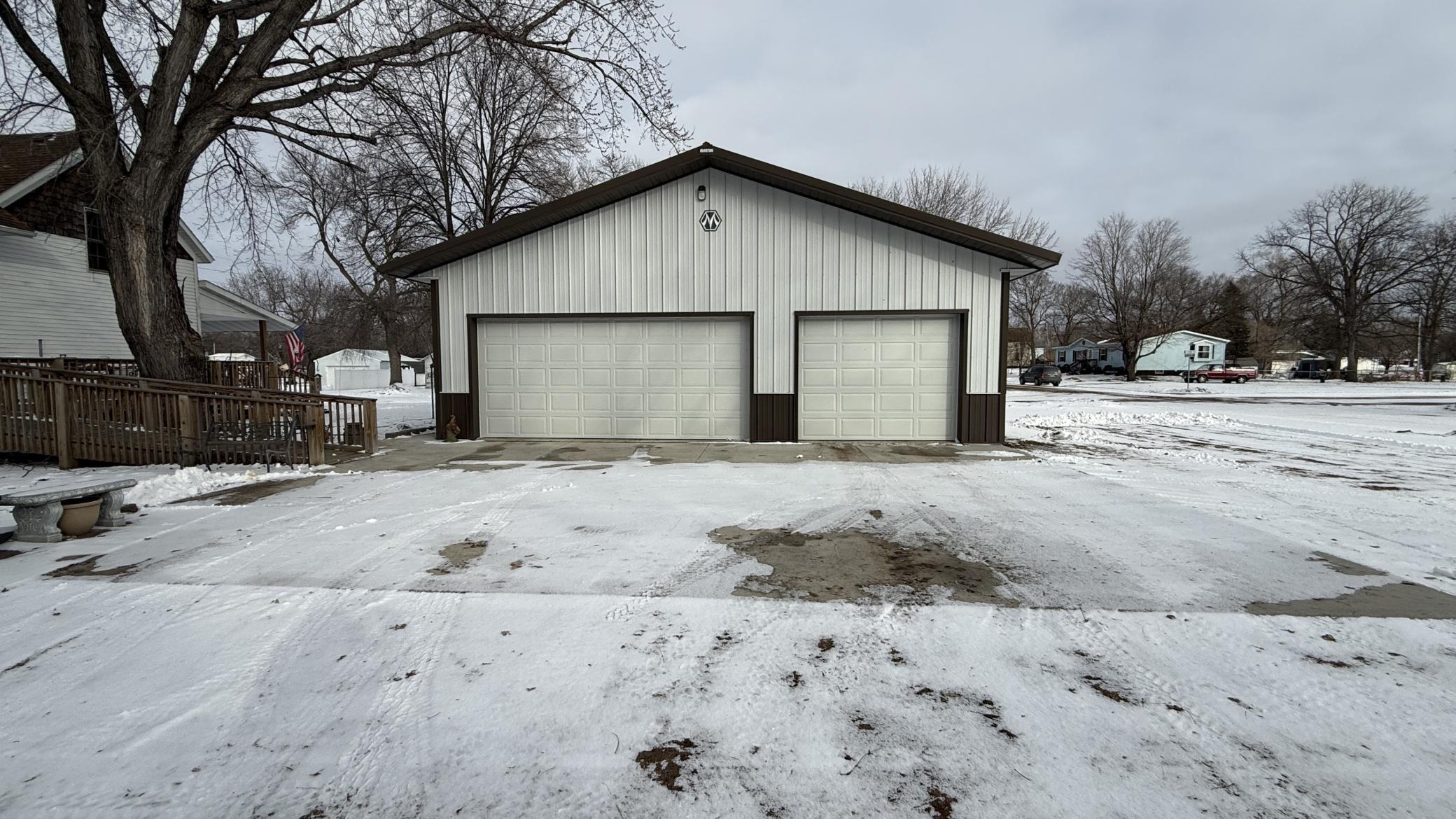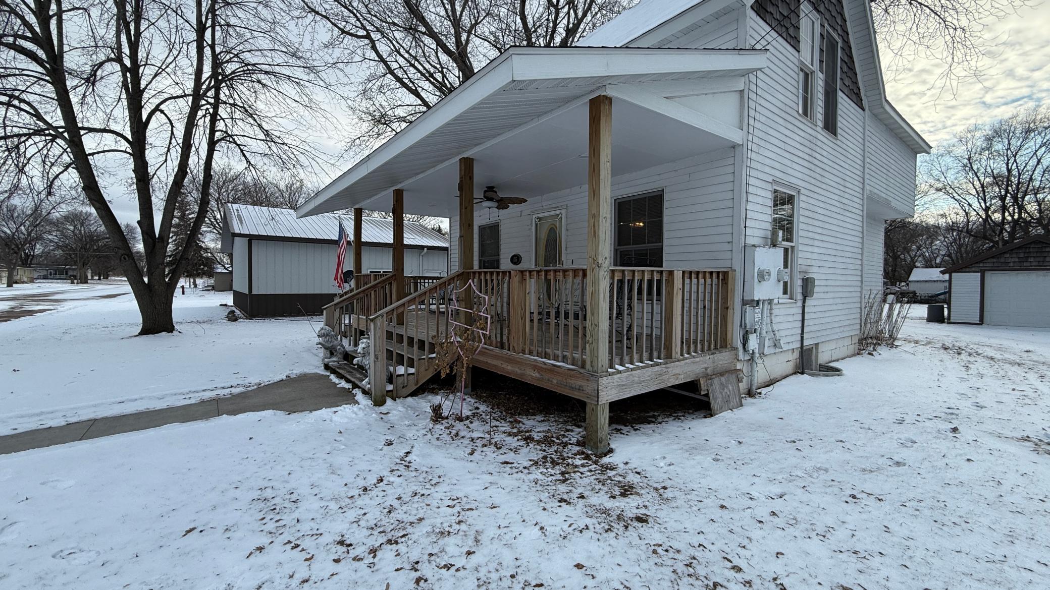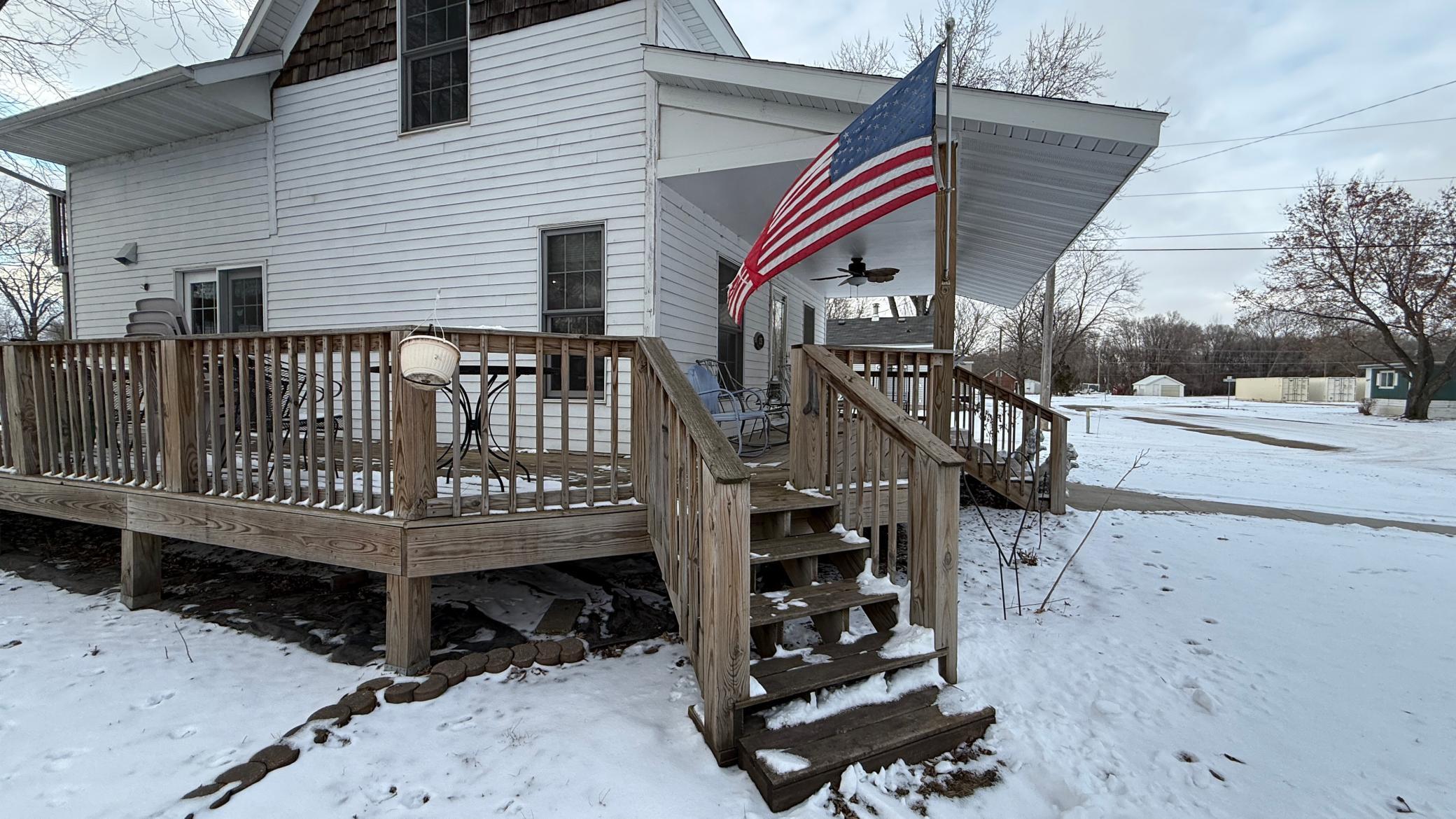This home has been extensively rebuilt since 1998, having been taken down to the studs and fully reinsulated, replumbed, and rewired. Updates also include replaced windows, siding, and shingles. The thoughtfully designed layout provides a seamless flow from the covered front porch into a spacious living room and an inviting eat-in kitchen.The upper level features a primary suite with a walk-in closet, bathroom, and private balcony. A generous den offers flexibility and could be converted into one or two additional bedrooms. Quality craftsmanship is evident throughout, including solid wood cabinetry, trim, and railings, as well as a convenient laundry chute leading to the basement. From the kitchen, a patio door opens to a wraparound deck with ramp access. The basement offers ample storage, houses the laundry area, and includes a bonus room that could serve as an additional bedroom with the addition of an egress. The home sits on a large double corner lot and includes a 30 x 36 Morton building constructed three years ago with 100-amp service, along with a detached one-car garage. Call today to appreciate this one of a kind property!