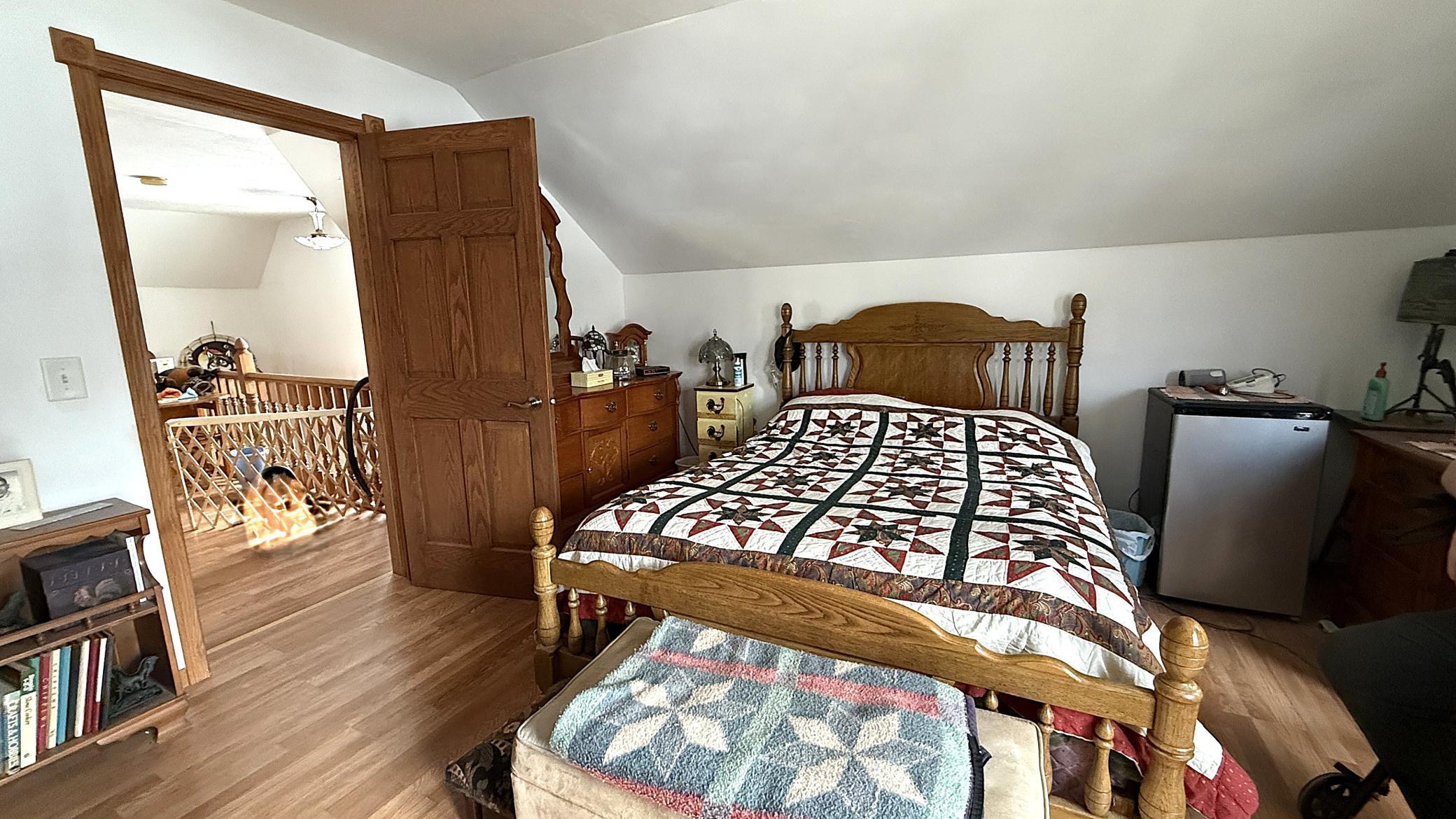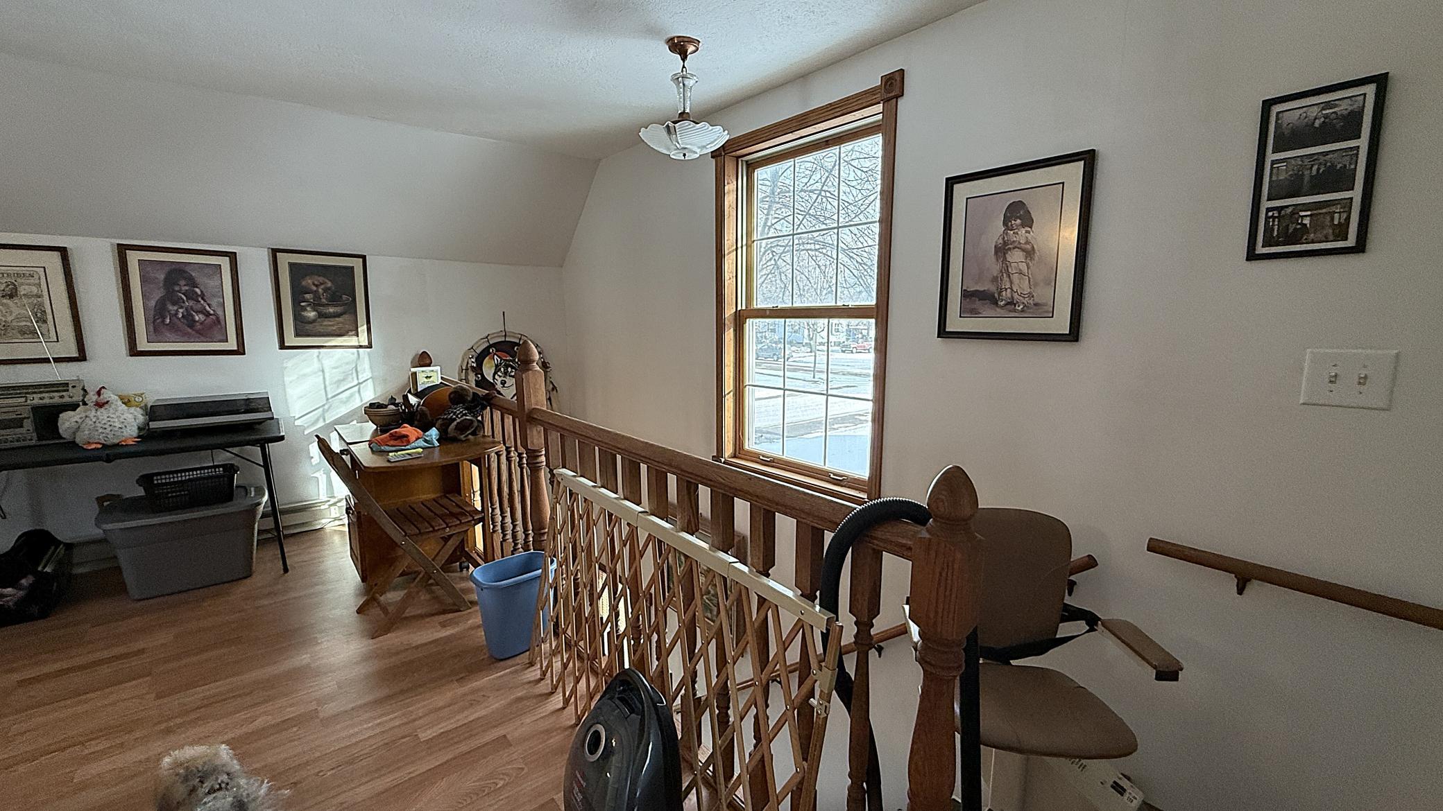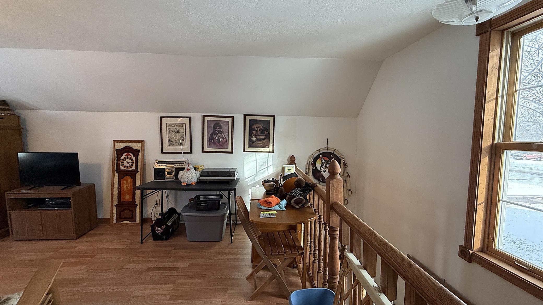 This home has been extensively rebuilt since 1998, having been taken down to the studs and fully reinsulated, replumbed, and rewired. Updates also include replaced windows, siding, and shingles. The thoughtfully designed layout provides a seamless flow from the covered front porch into a spacious living room and an inviting eat-in kitchen.The upper level features a primary suite with a walk-in closet, bathroom, and private balcony. A generous den offers flexibility and could be converted into one or two additional bedrooms. Quality craftsmanship is evident throughout, including solid wood cabinetry, trim, and railings, as well as a convenient laundry chute leading to the basement. From the kitchen, a patio door opens to a wraparound deck with ramp access. The basement offers ample storage, houses the laundry area, and includes a bonus room that could serve as an additional bedroom with the addition of an egress. The home sits on a large double corner lot and includes a 30 x 36 Morton building constructed three years ago with 100-amp service, along with a detached one-car garage. Call today to appreciate this one of a kind property!
