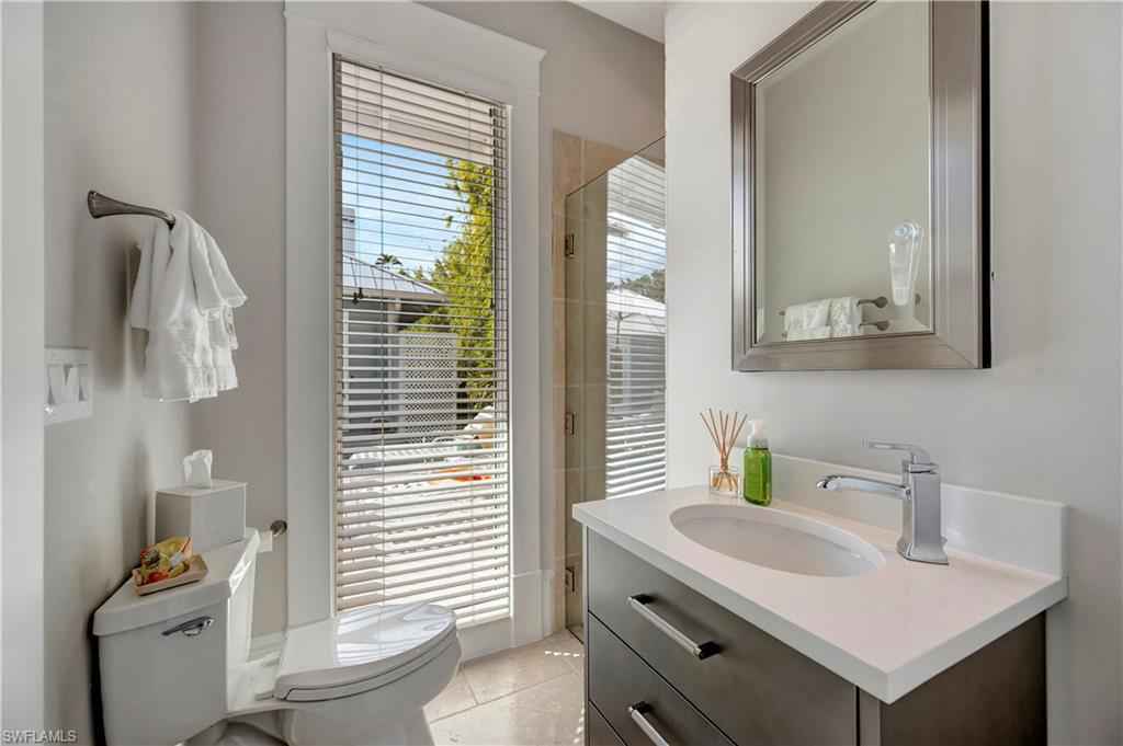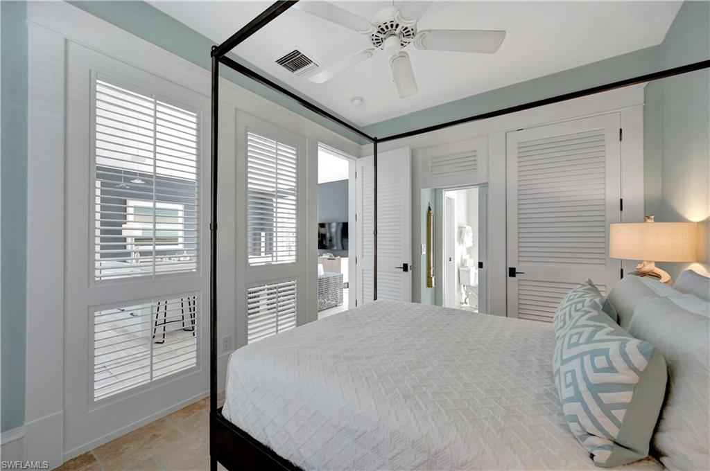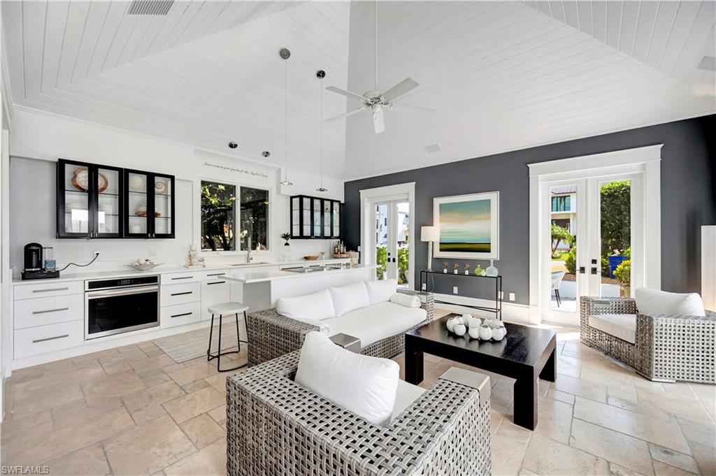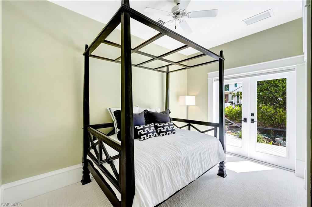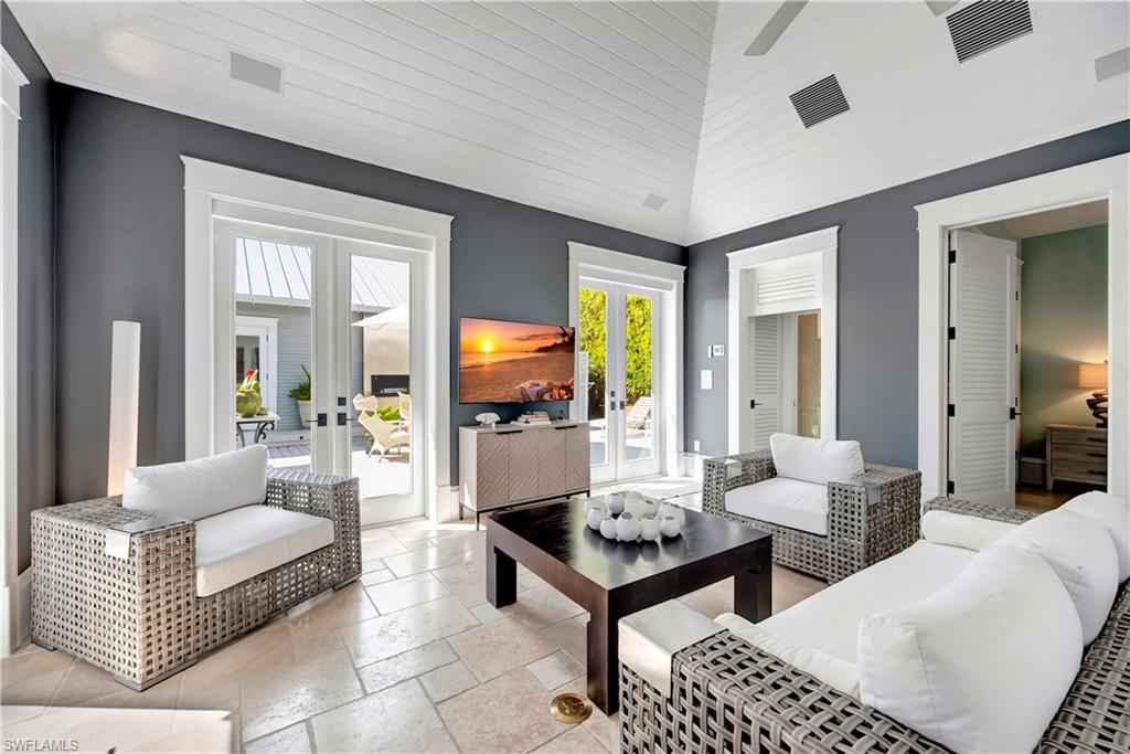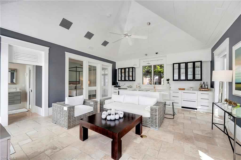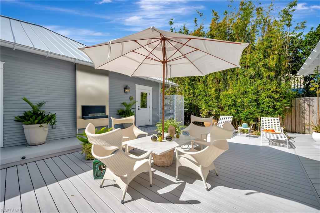 HISTORIC OLD NAPLES in the heart of the 3rd Street Shopping District.. This recently remodeled property on Gordon Drive near 3rd Street South has a Cottage with 3 sleeping rooms and a one-bedroom cabana joined by a large wood-deck with multiple seatings areas for outdoor dining, conversation or taking in the afternoon sun. The Cabana is for a party of two and includes a bedroom with a king bed, a full bath with a walk-in shower, a morning kitchen, and an expansive living area with high ceilings, and a large wall-mounted TV. The Cottage itself has 2 suites: the primary suite with a king bed and full bath, and a secondary suite that is furnished with a full-size bed, a queen bed, and a shared bath. The Cottage has a full kitchen, a dining area, a large living room as well as a screened patio with another table and seating area. Lounge by the lusciously landscaped lagoon/ plunge pool where you can cool off with a quick dip after a full day on the beach. Or take in the sights on 3rd Street, famous for its shopping, dining, and people watching.