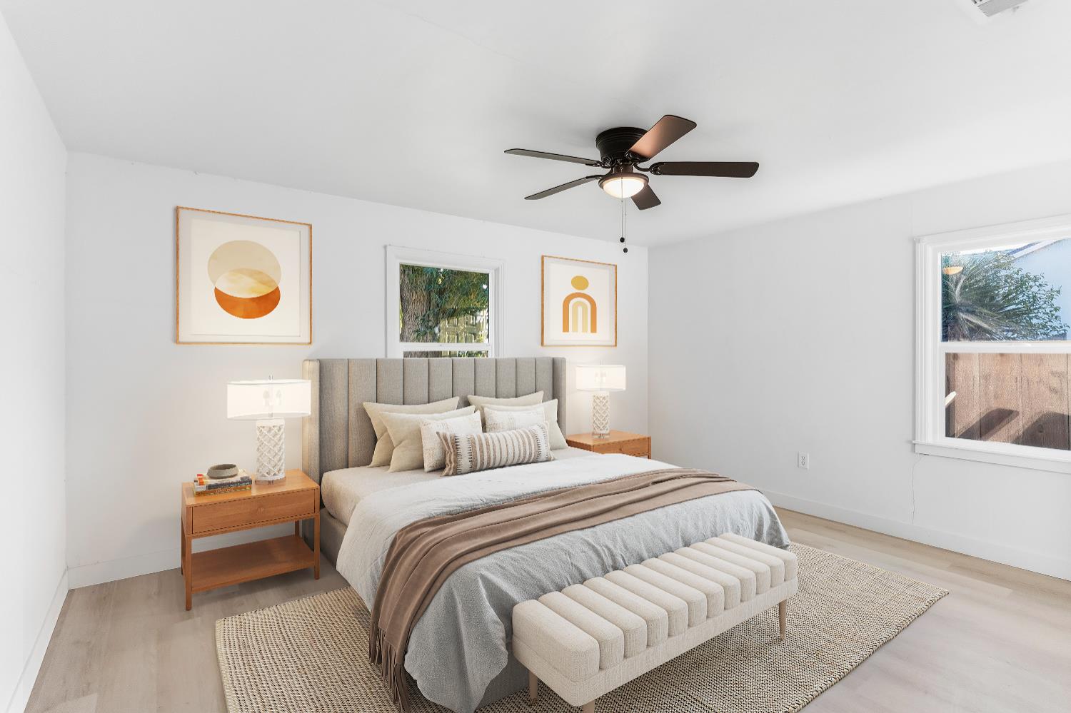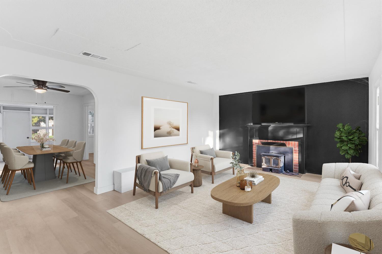 Bright and inviting home with updated flooring, fresh interior paint, and abundant natural light. Spacious living room with fireplace and large windows. Kitchen features white cabinetry, updated countertops, and tile backsplash. Well-sized bedrooms and refreshed bathroom with tiled shower surround. Enclosed patio/sunroom offers flexible bonus space. Situated on a generous 10,625 sq ft lot with mature trees, spacious backyard, and detached garage.