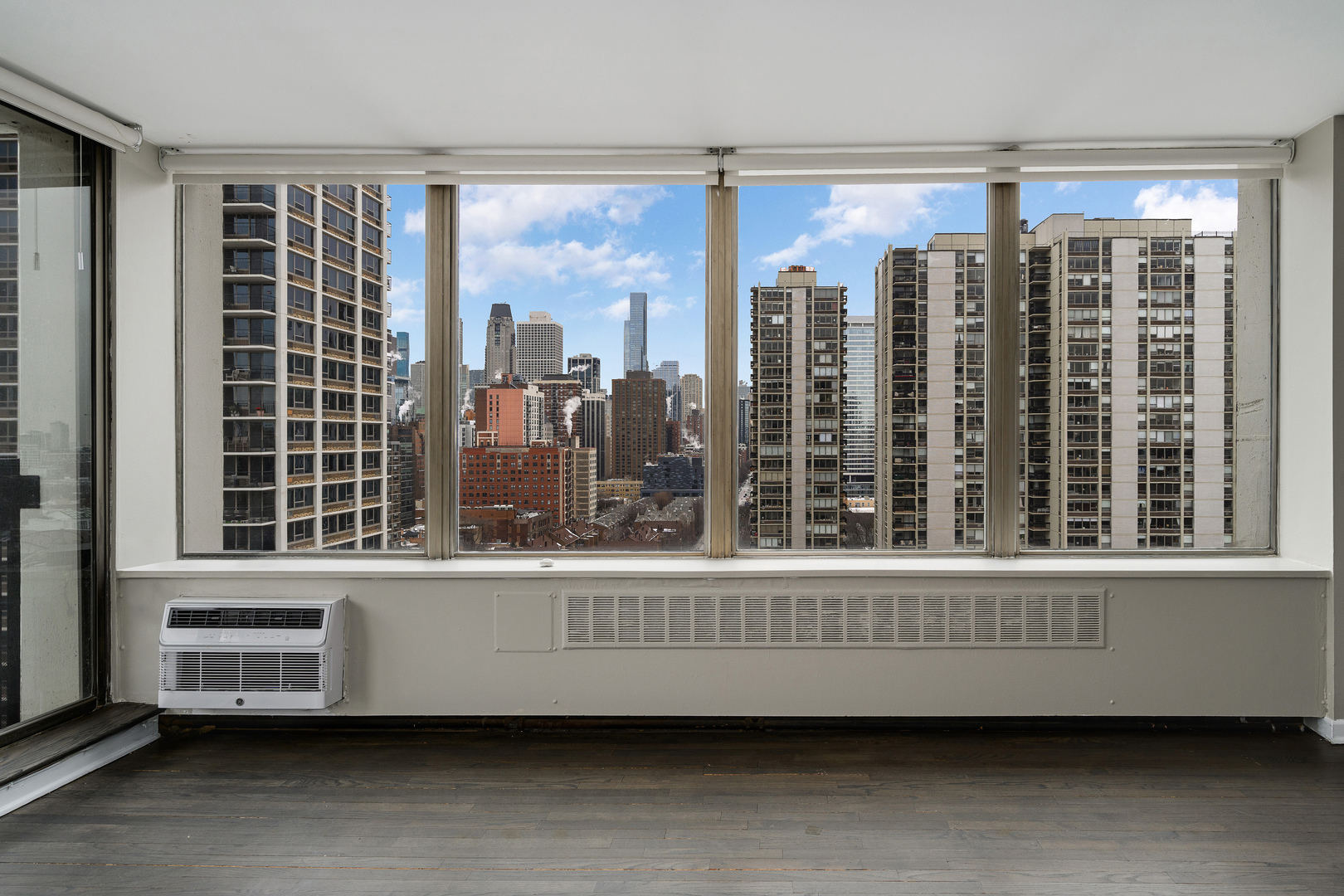 High-floor CORNER living with sweeping south and east skyline views in the heart of Old Town. This spacious, 850 SQ FT corner one-bedroom plus den residence at Bryant House offers a rare layout, abundant natural light, and a thoughtful blend of original upgrades and recent improvements, including fresh paint, hardwood flooring throughout, crown molding, and an oversized private balcony perfect for enjoying expansive city views. Wraparound windows with south and east-facing exposures feature premium Hunter Douglas automatic blinds and fill the home with sunlight throughout the day, while the open living and dining area easily accommodates everyday living and entertaining. The kitchen features custom cabinetry, granite and quartz surfaces, a full-height glass-and-stainless backsplash, under-cabinet lighting, stainless steel appliances, including a dual-zone wine fridge, a deep corner sink, and a generous six-foot breakfast bar, with a separate dining area option as well. The large bedroom comfortably accommodates a king-sized bed and features ample closet space, complemented by additional storage throughout the home, enhancing functionality. A dedicated den/office with custom shelving and a barn door provides ideal work-from-home flexibility rarely found in one-bedroom units. The updated bathroom maintains a clean, timeless feel. Monthly assessments include heat, cable, and high-speed internet (1GB), with only electricity billed separately, and the well-managed, FHA-approved building offers 24-hour door staff, fitness center, rooftop sundeck, bike room, additional storage included, attached garage parking available for rent, and access to Sandburg Village amenities including two Olympic-sized heated pools, tennis and pickleball courts, and landscaped courtyards (fees apply). Just steps from public transportation, Lake Shore Drive, the lakefront trail, Old Town, Lincoln Park, dining, shopping, nightlife, and Jewel-Osco, with professional on-site management and pet-friendly living.