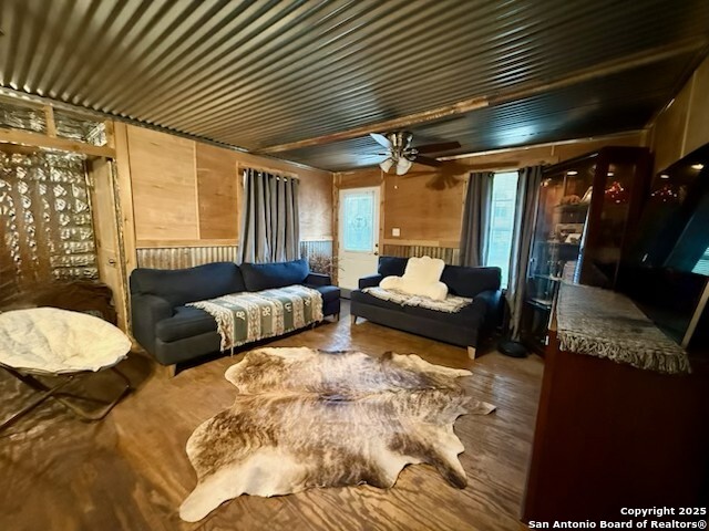 Updated 2/2 ranch-style home with barndo-inspired character. Open-concept kitchen/living area features granite countertops, new cabinets, and new appliances. Reclaimed wood flooring and wood ceiling in bedroom add warmth, while reclaimed tin accents in living and kitchen areas create a rustic-industrial feel. New windows, enclosed carport, cedar accents, and new driveway add function and curb appeal, plus a 50-amp RV hookup. Windmill-style ceiling fan and rustic porch lighting enhance the design. One bath offers a tiled walk-in shower the second includes a tub/shower combo. Single-story, move-in ready, with exterior paint updates scheduled for January 2026 providing added value for the next homeowner without the upfront cost or planning.