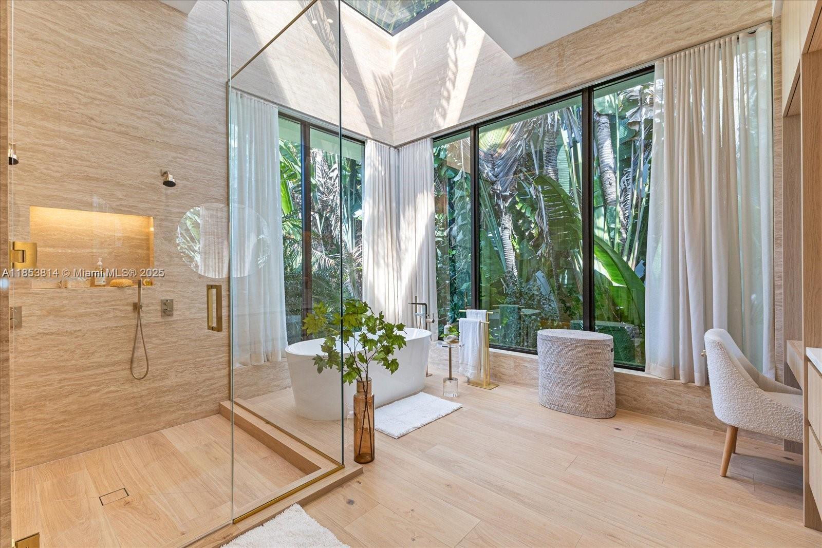 Newly constructed and elevated, this modern waterfront residence offers 9000+ SF of living space with 90 feet of water frontage on coveted, guard-gated Sunset Island III. A perfect home for those who seek both privacy and connection to Miamis iconic waterfront boating lifestyle, with walkability to Sunset Harbor's restaurants, fitness studios, padel club and waterfront park. Design features include natural materials such as white oak, marble, and travertine to bring warmth and sophistication, while floor-to-ceiling glass and skylights create seamless indoor-outdoor living, custom Italian kitchen with top-of-the-line appliances, a heated pool with all-day southern sun exposure, spa, rooftop loft with terrace, and well-designed outdoor spaces to relax and entertain.