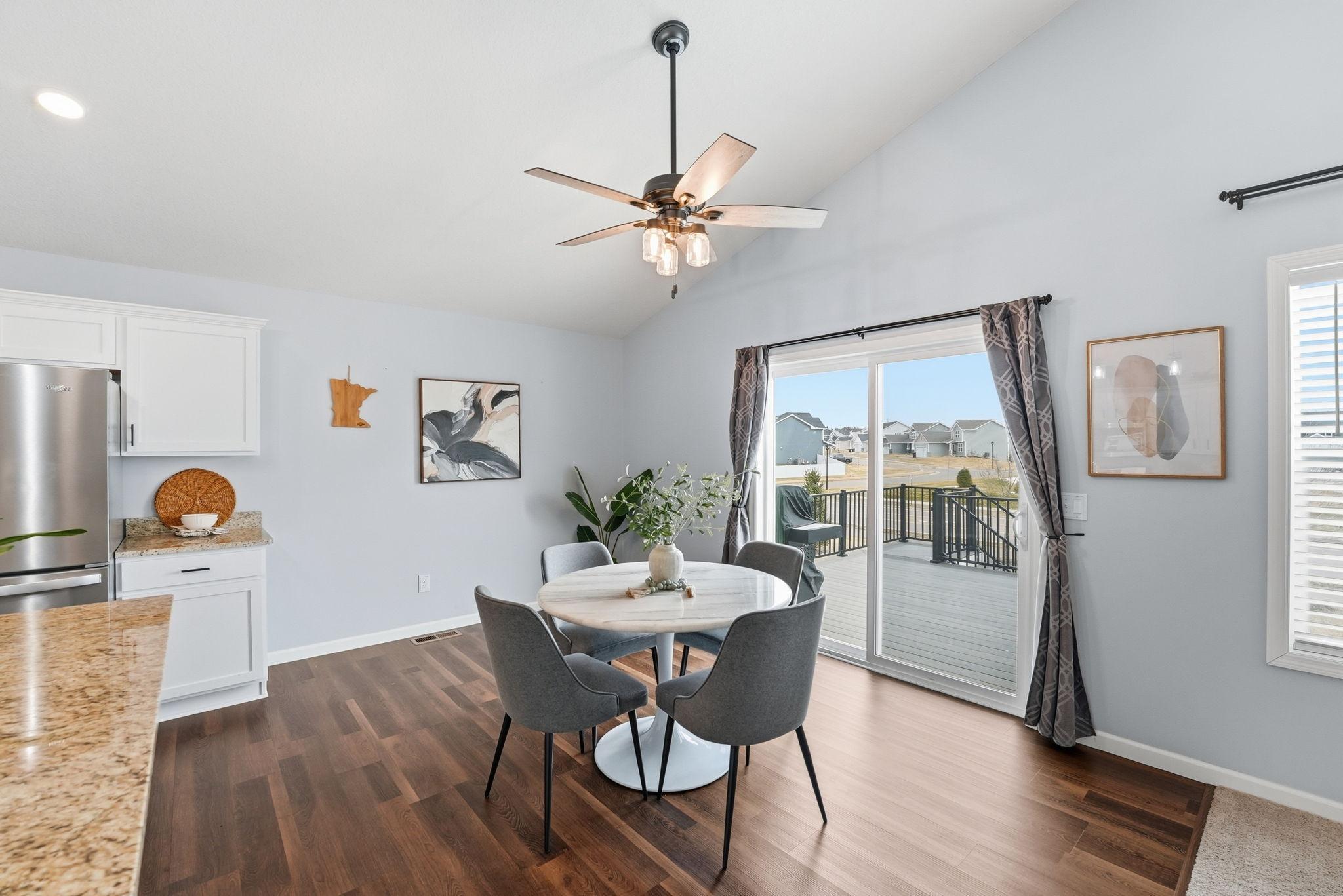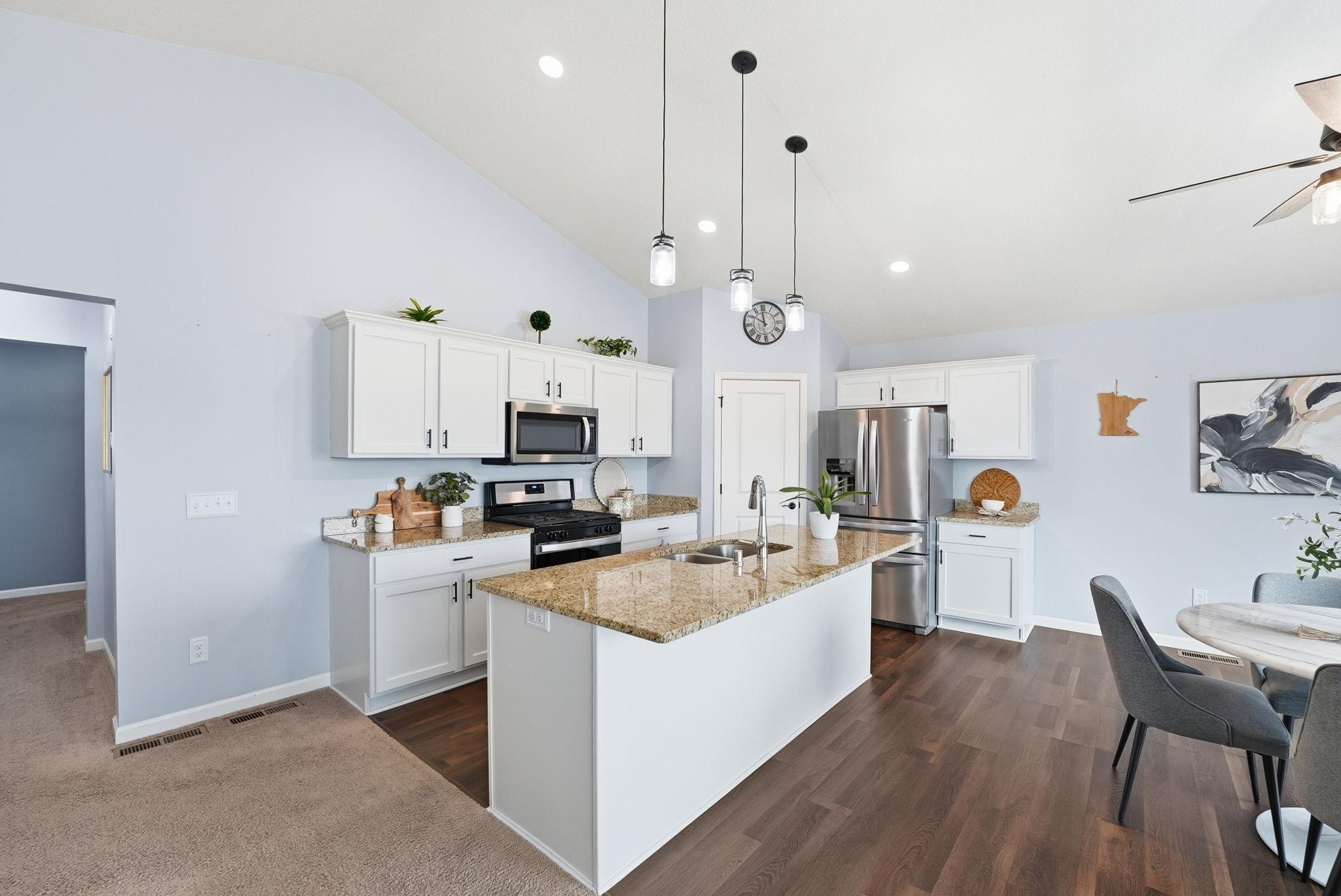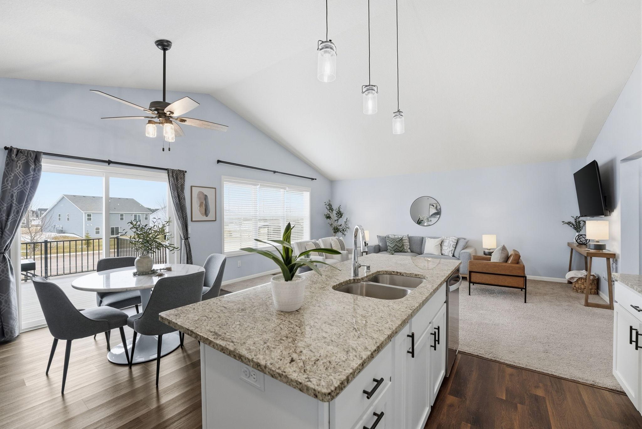 Welcome to this beautiful home located on a quiet cul-de-sac in Ramsey. The main level features an open-concept layout with vaulted ceilings, large windows, and great natural light throughout. The kitchen offers granite countertops, stainless steel appliances, a center island, and plenty of cabinet space, flowing nicely into the dining and living areas.The home includes spacious bedrooms, including a large primary suite with a private bathroom and double vanity. Enjoy the elevated deck overlooking the backyardperfect for relaxing or entertaining.Additional highlights include a walkout lower level with room to add future living space, a 2-car garage, and a great location close to parks, trails, shopping, and easy highway access.Move-in ready and a great opportunity in a growing Ramsey neighborhood.
