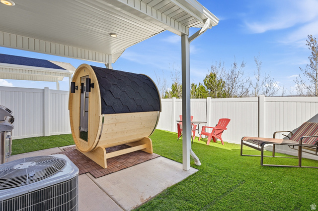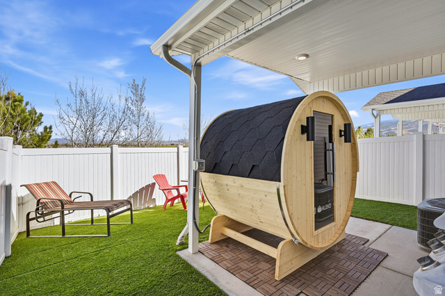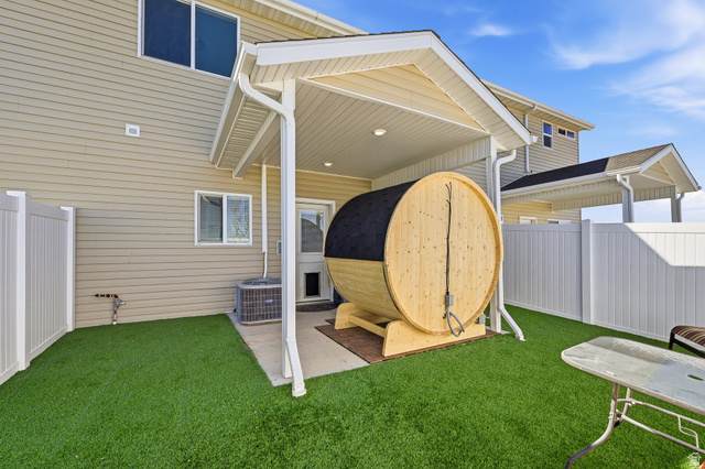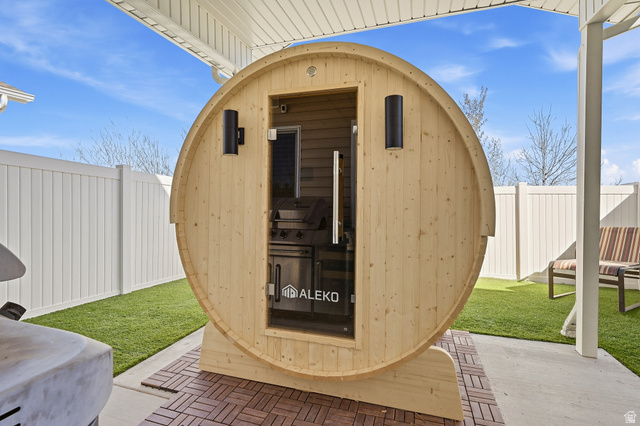 This inviting 3 bedroom, 2 bathroom Cedar Bend townhome--with its own private outdoor sauna and security system--offers the perfect mix of comfort, style, and standout extras. Ideally located next to visitor parking, it also features peaceful, open views out back with no rear neighbors. The open concept main floor seamlessly connects the kitchen, dining, and living areas, creating a bright and welcoming space that's perfect for entertaining. The kitchen showcases white cabinetry, solid surface countertops, and a spacious pantry. Upstairs, you'll find three bedrooms, two full bathrooms, and a conveniently located laundry area, including a new LG Smart stackable washer and dryer. Step outside to a fully fenced, low maintenance turf backyard and unwind in your own private sauna retreat.