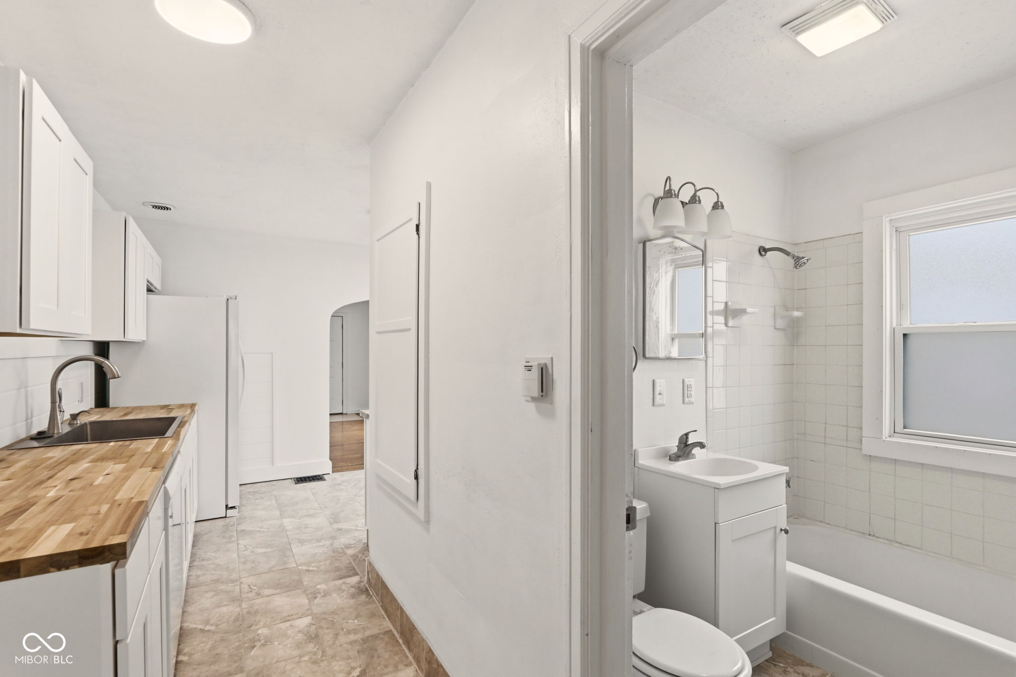 Welcome to this stylishly updated 1 bedroom/ 1 bath duplex unit in Little Flower, minutes from Brookside park, Irvington and Downtown Indy. Upgrades include new kitchen cabinets, butcherblock cabinets, vinyl flooring in kitchen, hall, and bath, with original hardwood floors in living room and bedroom, new bathroom vanity with tub/shower combo and a basement with a washer and dryer. One dedicated parking spot in back and street parking in front. It comes with refrigerator, oven/electric stove, microwave in kitchen and one window cooling unit for the bedroom. No smoking or pets allowed. Security deposit is equal to one month's rent. Renter's Insurance required. $40 per person non-refundable fee for credit check/application. Unit is unfurnished. Furniture in living room is AI generated.