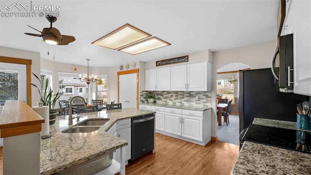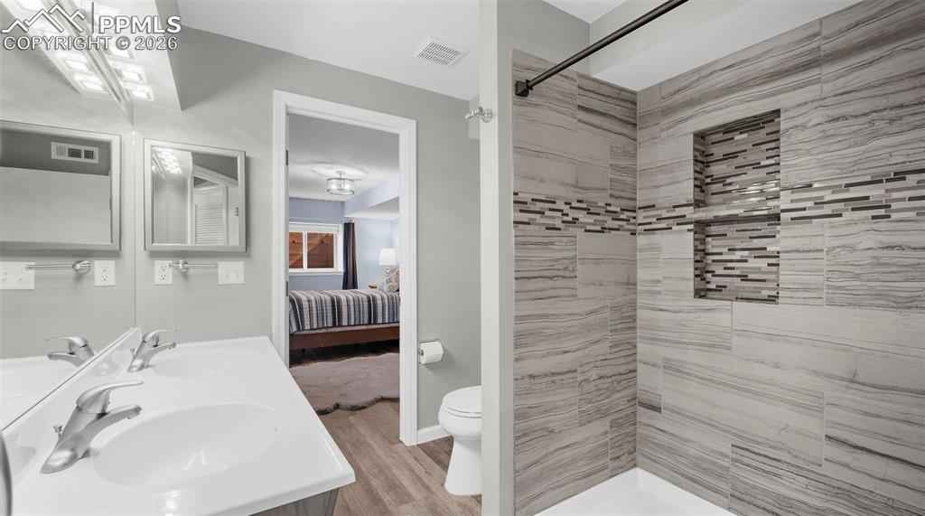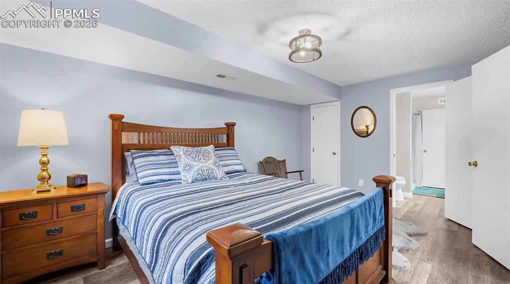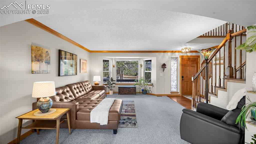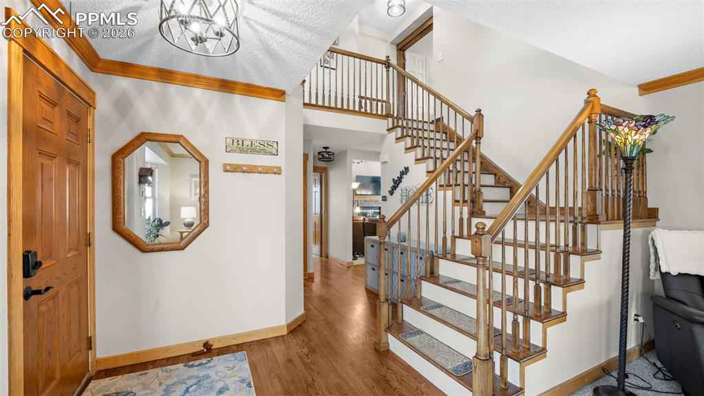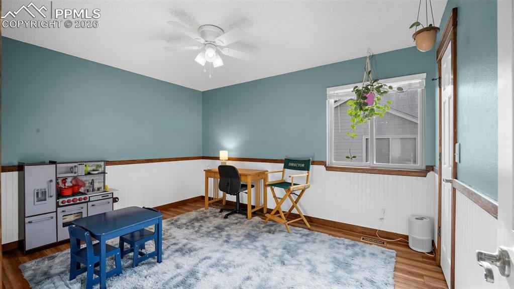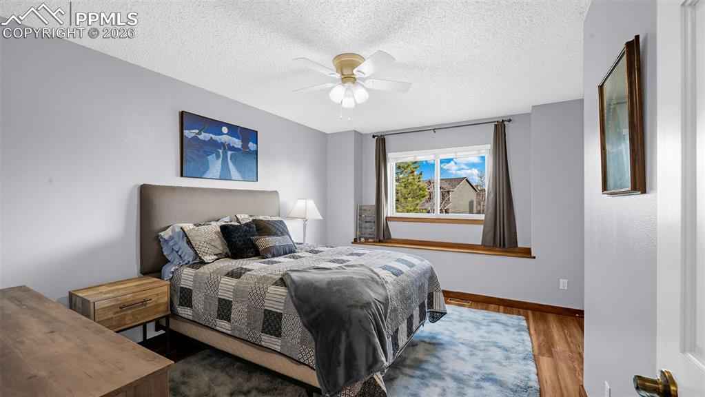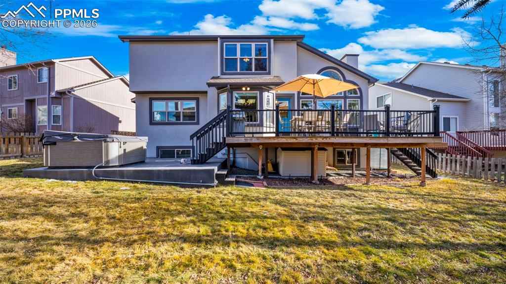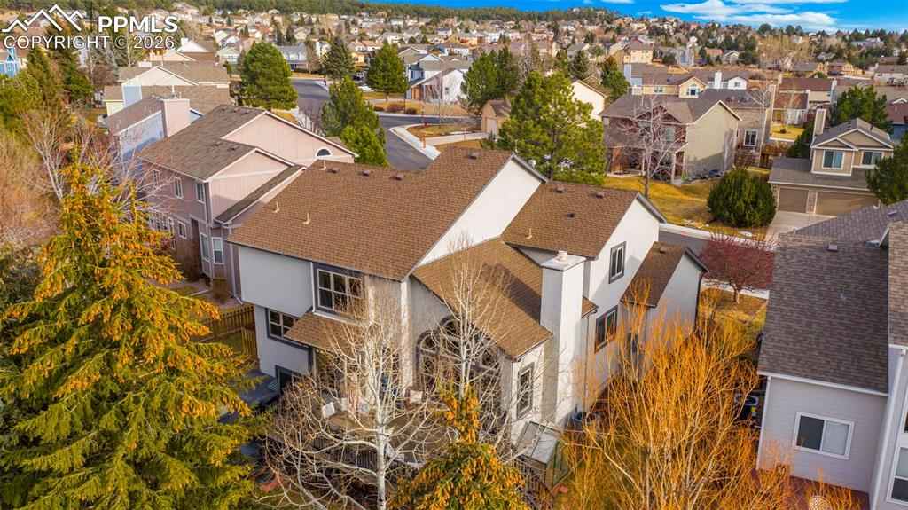 One of the largest floorplans built in the neighborhood! Renovated 2-story home in the desirable Gleneagle area. Close to I-25, schools, USAFA, and shopping. Stucco and brick exterior with a large covered front porch and an oversized two-car garage with workbench, built-in shelving, and wired for EV charging. Inside this spacious floorplan there are features like bay windows, vaulted ceilings, oversized rooms and walk-in closets in nearly every bedroom. The entry foyer features architectural views of the staircase and upper level. This leads into the formal living room and dining room. The eat-in kitchen features granite counters, newer stainless steel appliances, a large island, and walks out to an oversized 24'x14' trex composite deck. Or, take the steps down to the 18'x18' patio wired for your hot tub. The main level also includes an office, half bath, and laundry/mud room with garage access and utility sink. Upstairs, the 17'x17' primary suite features a brand new spa-like five piece bath and walk-in closet. Three more large bedrooms (two with walk-in closets and one with double closets) and a renovated full bathroom complete the upstairs. The finished garden level basement features a large rec room, two large bedrooms, a 3/4 bathroom with double vanities, and a mechanical room with a large unfinished storage area. Out back there is a fairly level yard with an automatic sprinkler system, greenhouse, playset, fenced dog run with dog door, and fully fenced rear yard. Central air added in 2018. Furnace replaced in 2021. Trex composite deck completed in 2020. Stained patio completed in 2023. Upgraded electrical panel, hot tub wiring, and EV charging added in 2023. Primary bath, full bath, and 3/4 bath renovated in 2025. Easy commute to Colorado Springs or Denver and located in award-winning Academy School District 20. Blending elegance, functionality, lots of square footage, and a great location, this Gleneagle find is the place you will want to call home.