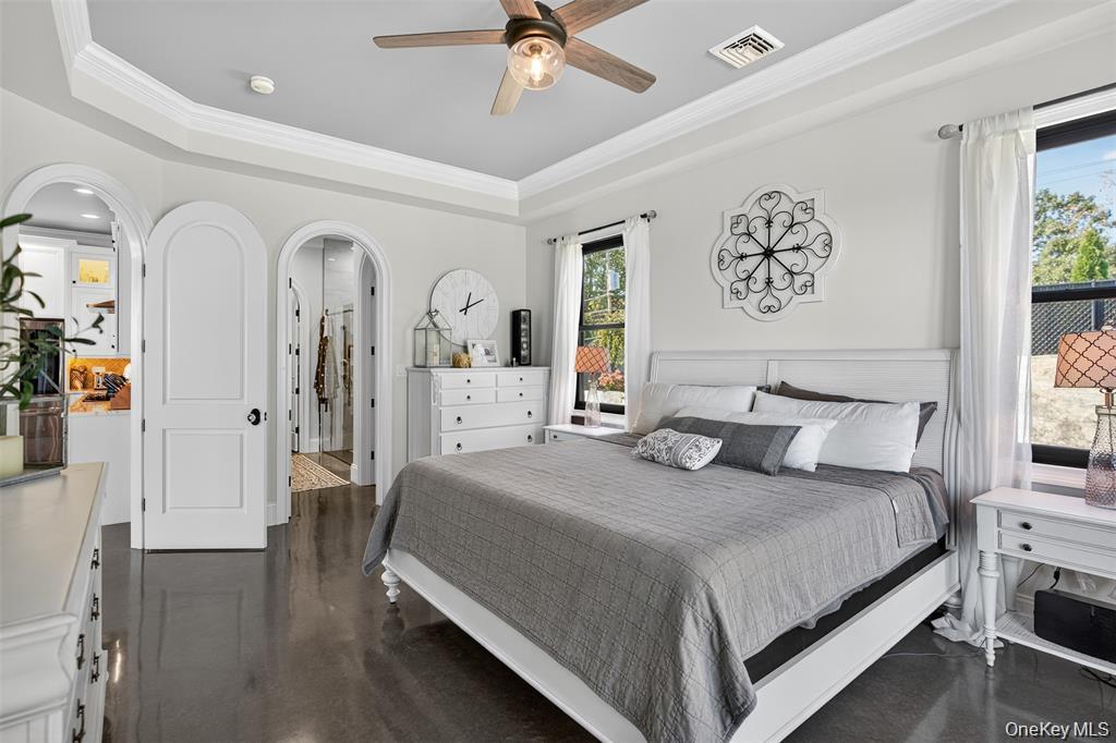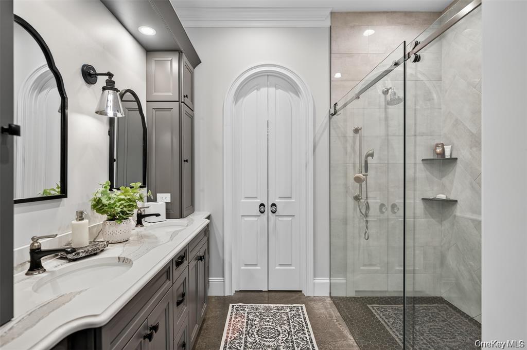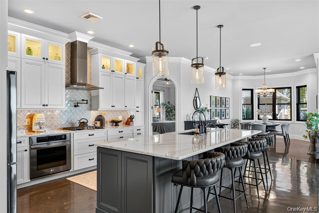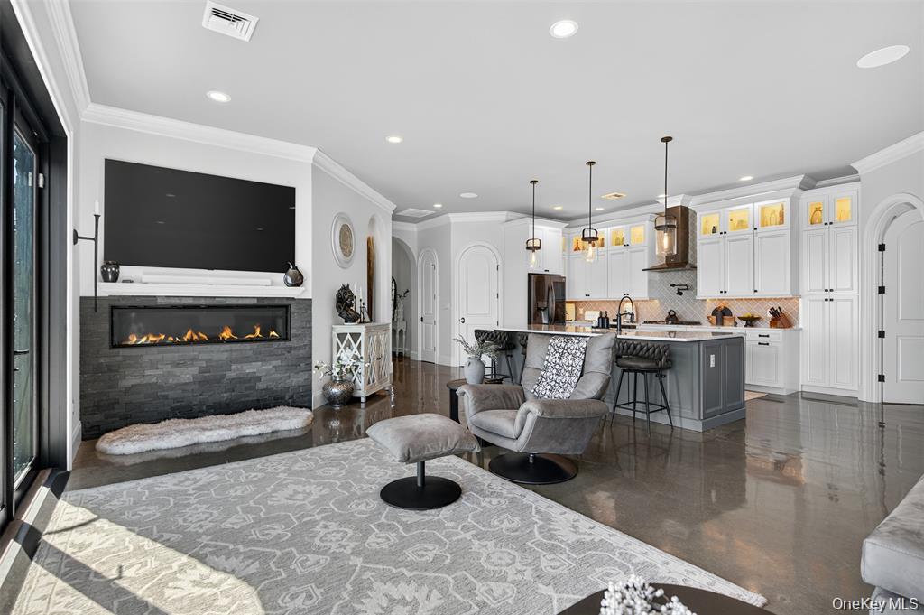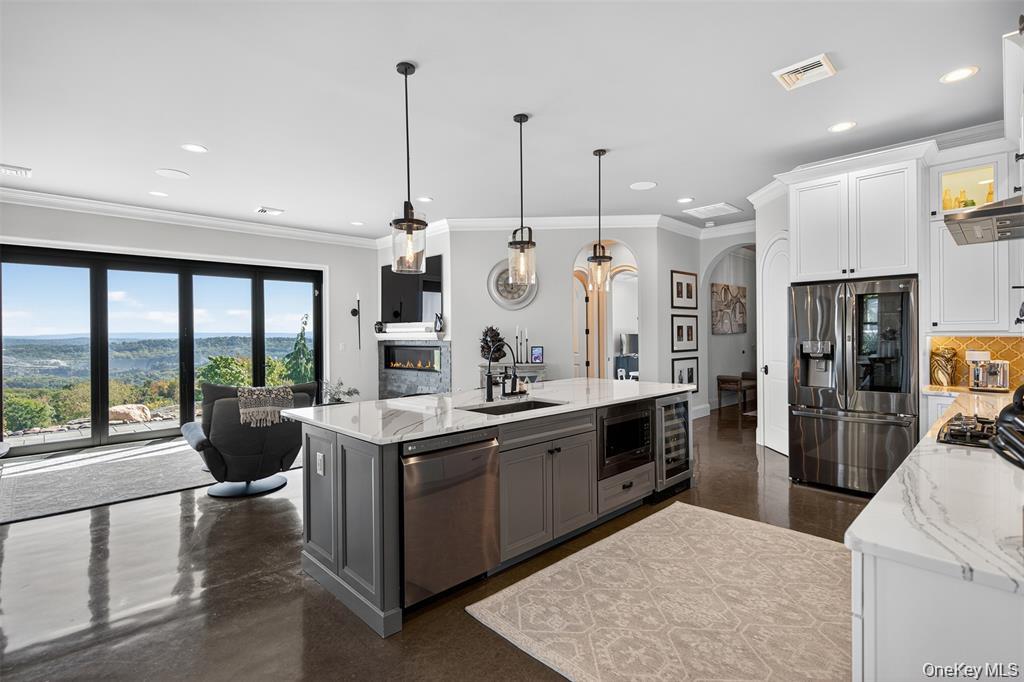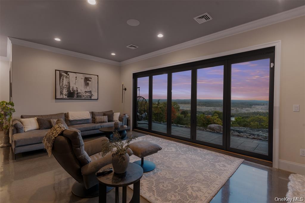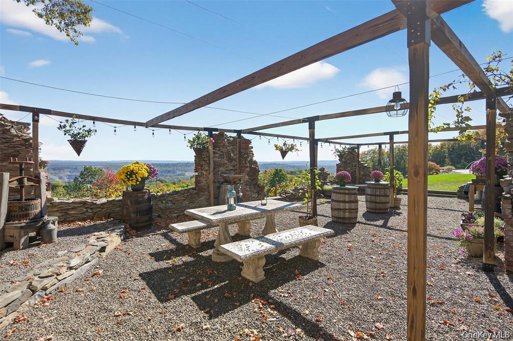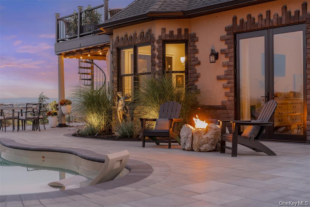 Perched high above the Hudson River with panoramic views set on 3.9 private acres, this custom-designed single-level estate embodies refined modern luxury. Clean architectural lines, dramatic finishes, and meticulously curated details create a residence that feels both sophisticated and effortlessly livable. The current layout lives spaciously, with the flexibility to easily convert to additional bedrooms, offering additional versatility without compromising the homes elegant flow.A custom entry door opens to a striking foyer that leads into a sun-drenched chefs kitchen designed for both everyday living and elevated entertaining. Quartz countertops, bespoke cabinetry, an oversized statement island, pot filler, gas range, wine refrigerator, and expansive prep space anchor the room. The open-concept design continues into a light-filled dining area and expansive living room, where floor-to-ceiling accordion glass doors fully disappear to reveal uninterrupted Hudson River views and breathtaking east-facing sunrises.The outdoor experience is nothing short of resort-like. Thoughtfully designed across lush landscaped grounds, the property features a stunning inground pool with water features and slide, a stacked-stone outdoor bar with changing room and bath, a custom-built fireplace, hot tub, sauna, and outdoor shower. A romantic secret garden retreat with its own fireplace and starlit patio offers a private sanctuary, while the grounds also include a playground, vineyard with grapevines and fruit trees, a detached barn, and beautifully hand-laid stone walls that weave throughout the property. Multiple terraces, a covered porch, and a Juliet spiral staircase with balcony create countless vantage points to take in the landscape and river beyond.Inside, a spacious guest bedroom shares a beautifully appointed full bath, while the luxurious primary suite serves as a serene retreat with private exterior access, a spa-inspired bath with double vanity and rainfall shower, and an expansive walk-in closet. A two-car garage provides ample space for vehicles and storage, while a walk-up partially finished attic offers the opportunity for a den, office, or additional living space.Privately gated with extensive hardscaping and generous parking, this extraordinary Hudson River estate delivers a rare combination of architectural beauty, privacy, and lifestyle, with the added opportunity to easily convert to a three-bedroom configuration for those seeking additional space.