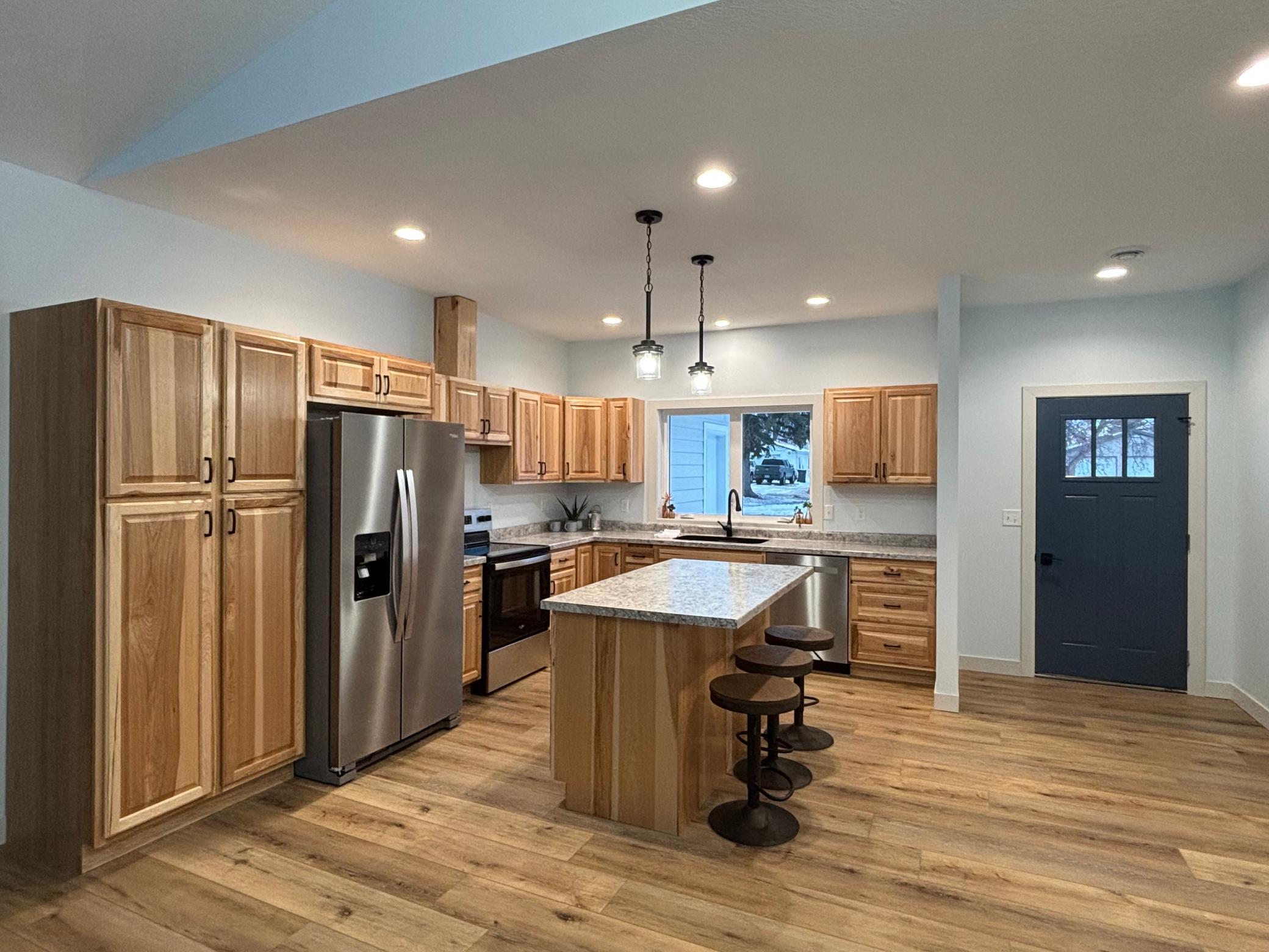 This beautifully built, one-level, 3-bedroom, 2-bathroom home seamlessly blends comfort, style, and functionality. The striking black windows and durable LP siding ensure both aesthetic appeal and longevity. Solid wood doors and cabinetry throughout the house reflect attention to detail, quality craftsmanship, and timeless style. Experience the warmth and comfort of in-floor heating that extends throughout the home and garage, including the spacious mudroom, which conveniently features a laundry area. The heart of this home is its open-concept layout, perfect for both entertaining and everyday living. The kitchen is a highlight with its modern stainless-steel appliances and island counter space.The luxurious tile walk-in shower in the primary suite offers a spa-like retreat, while the large walk-in closet provides ample space for your wardrobe. The expansive 2-car garage is not only practical for parking but also offers bonus space on both sides, ideal for storage, tools, or your favorite recreational toys. A separate zone for the in-floor heating allows you to set the perfect temperature for Minnesota winters.Step outside to your spacious backyard, complete with a patio that's perfect for relaxing or hosting gatherings. This move-in-ready home offers the simplicity and ease of one-level living, making it an ideal choice for those seeking both comfort and convenience.