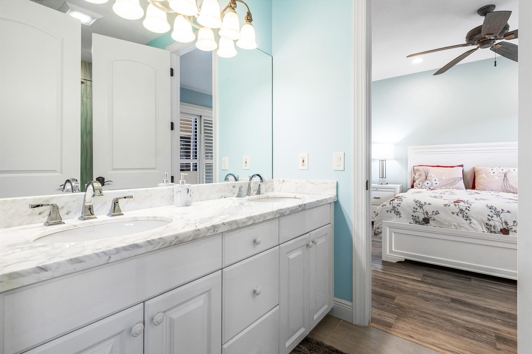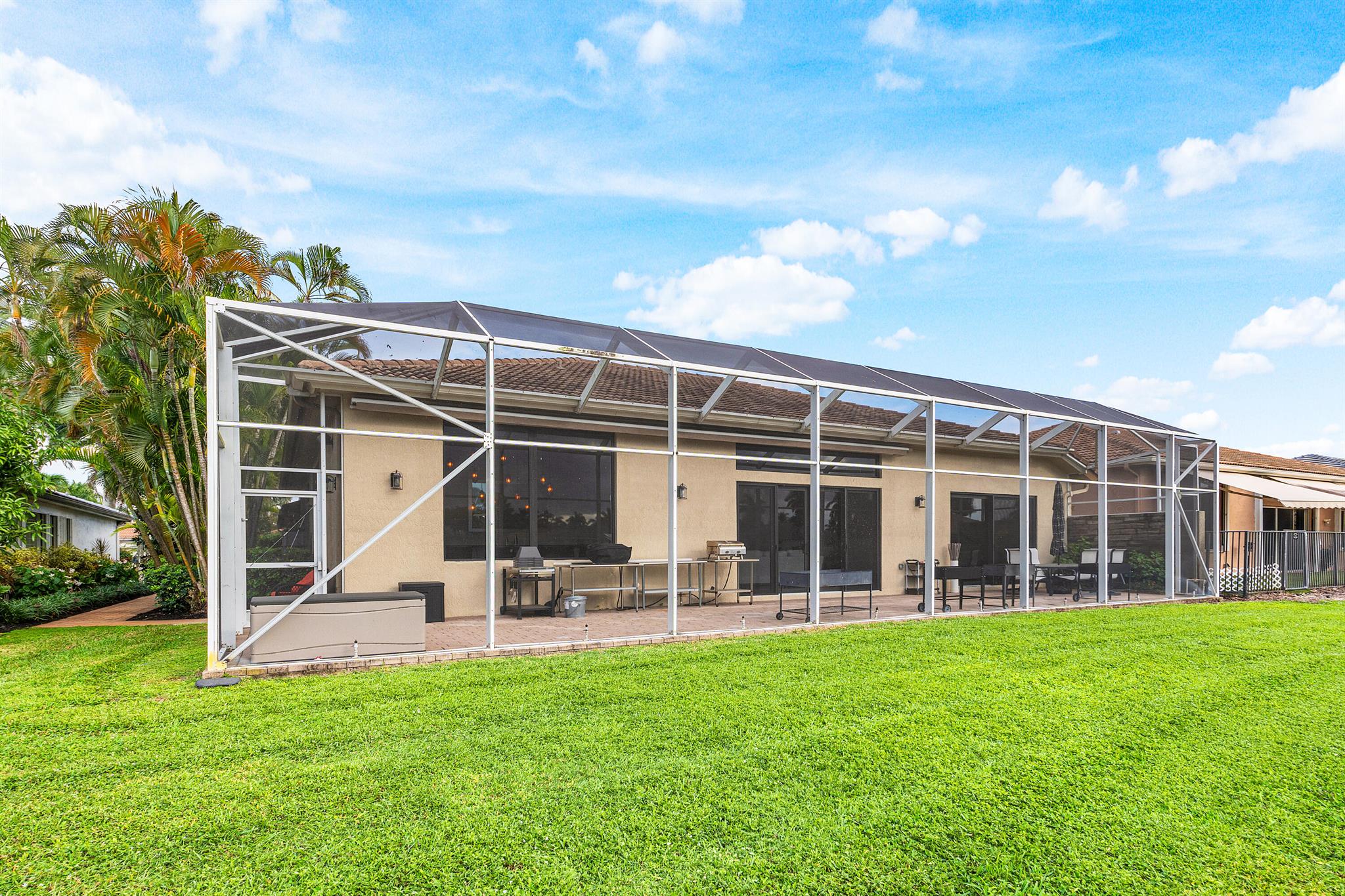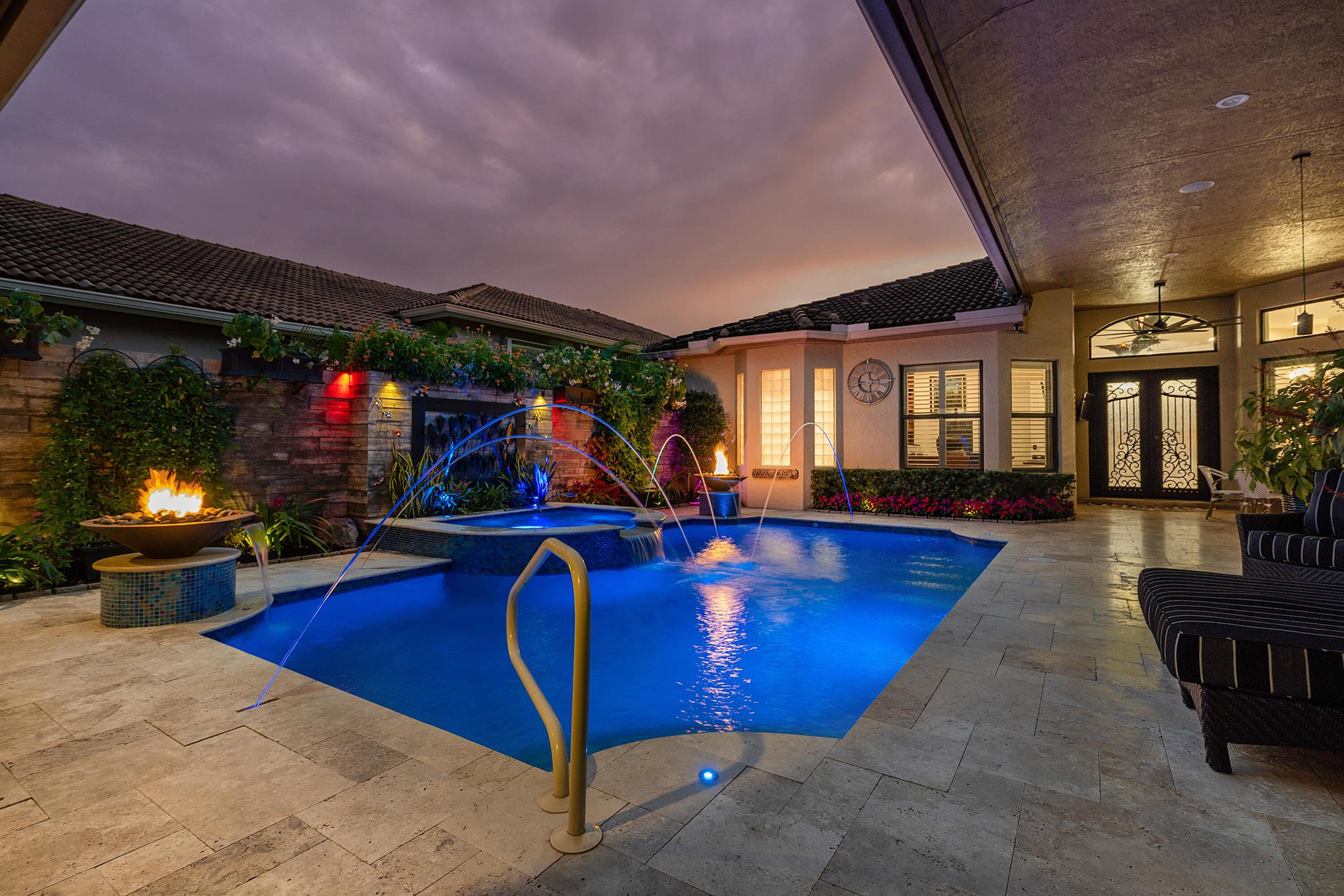 Experience the best of Mizner Country Club living in this updated lakefront Courtyard home offering immediate sports equity. Featuring new impact windows/doors throughout, limestone courtyard & drive, custom wrought-iron entry doors, new tile, & designer lighting. Features include whole-house generator, reverse osmosis water, & water softener, instant hot water, SubZero drawer fridge, new Bosch dishwasher, mother-of-pearl backsplash, motorized shades, music throughout, 3 extra A/C mini splits in living, dining, & garage. Built-in safe. Pool has gas/electric heaters w/chiller, & laminar water arcs over pool, fire pits w/waterfalls, misting system, hot-tub blower, outdoor bar w/drawer fridge, & 85'' TV with rock speakers. Back area has a screened patio w/awning & lake vistas.
